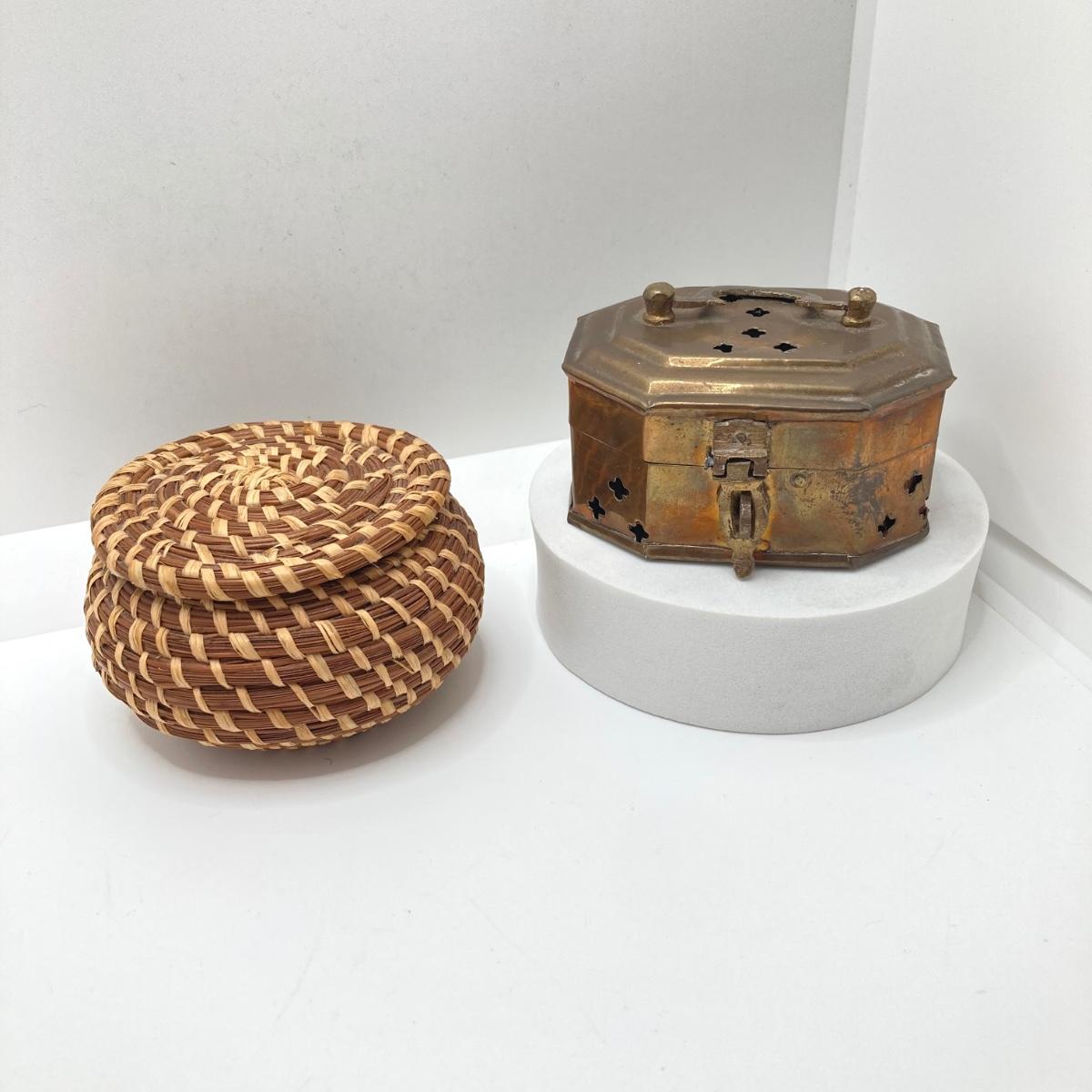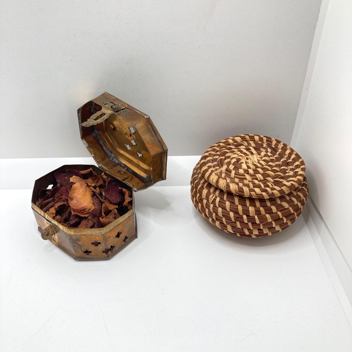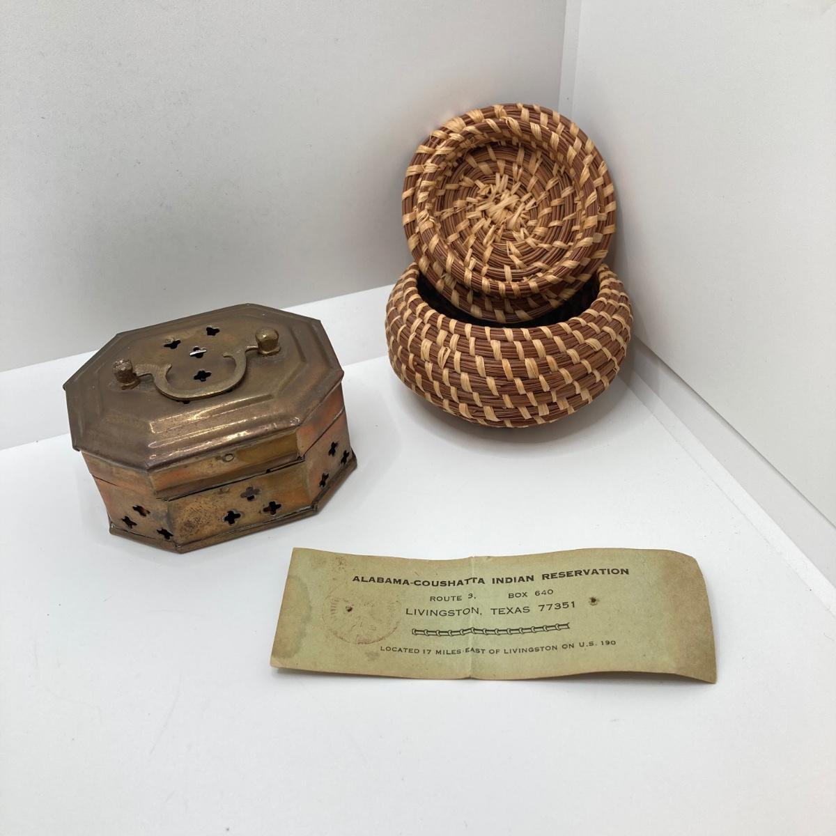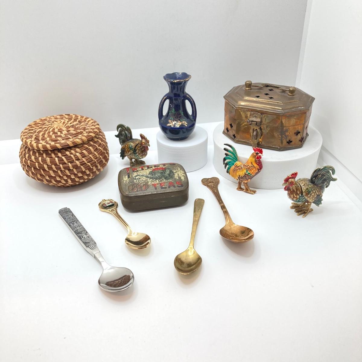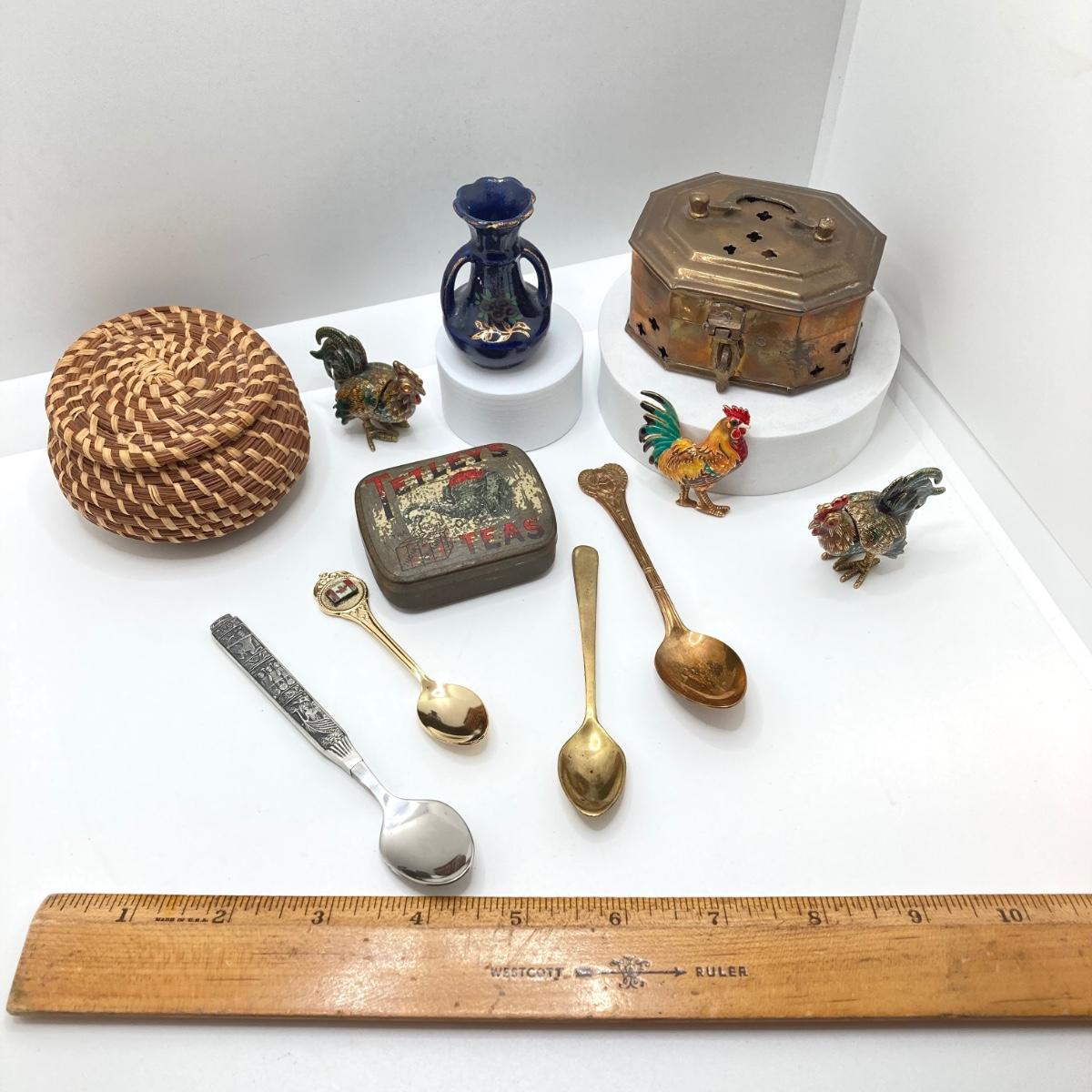 LOT 74: Trinkets and Trinket Holders - Brass Cricket Box, Handcrafted Trinket Basket, Occupied Japan Miniature Pottery, Roosters and Collector Spoons