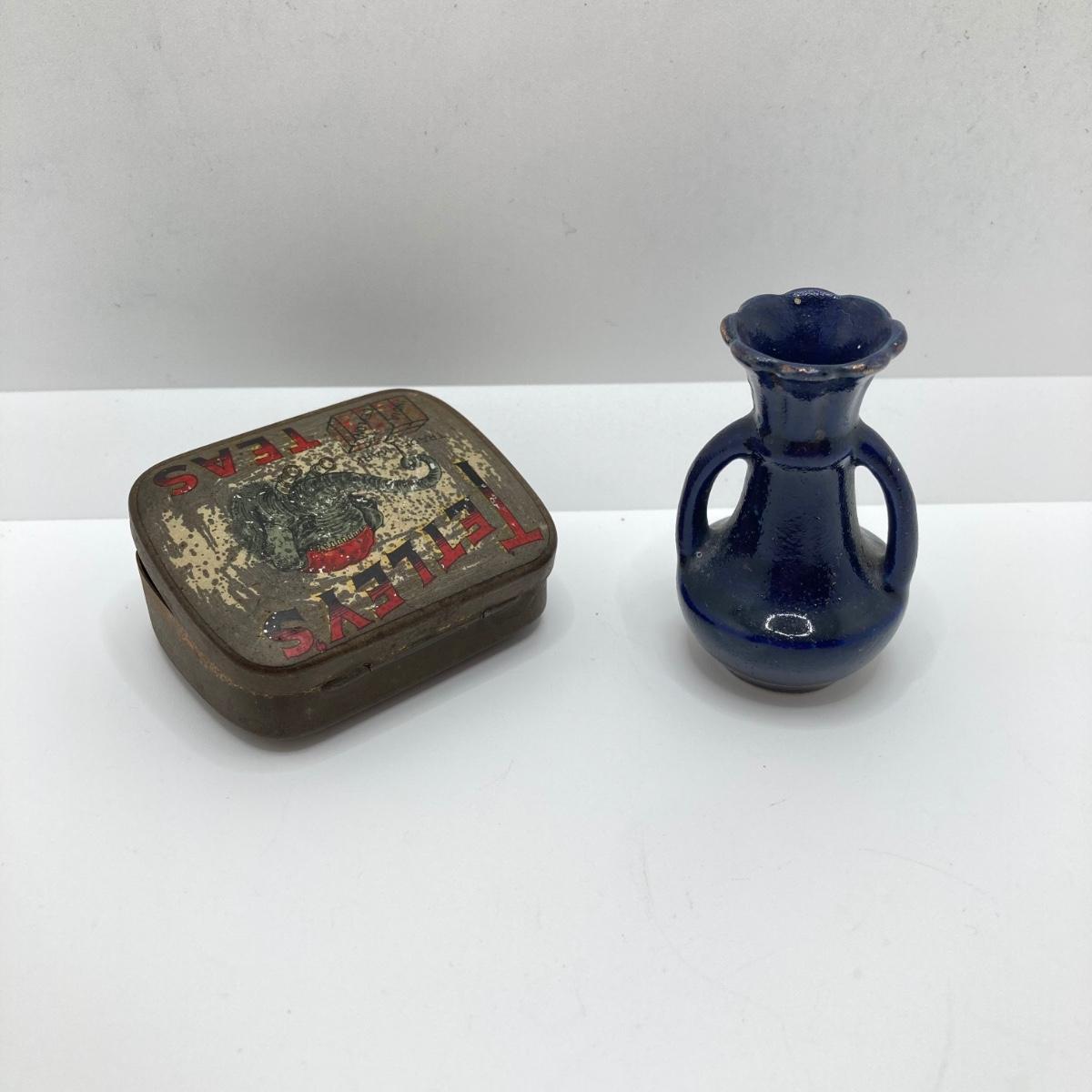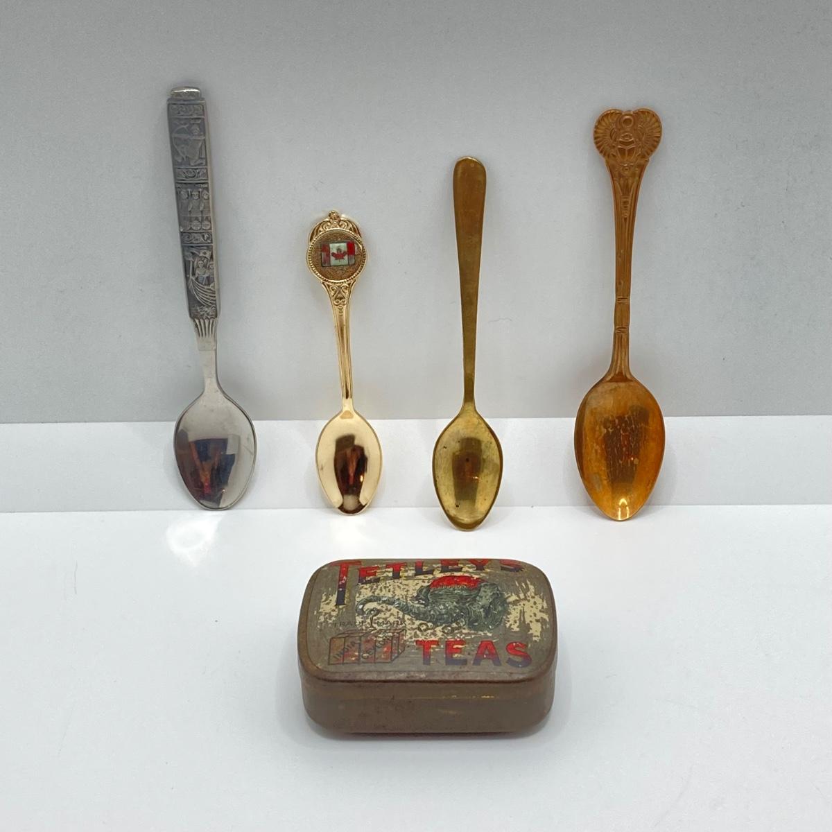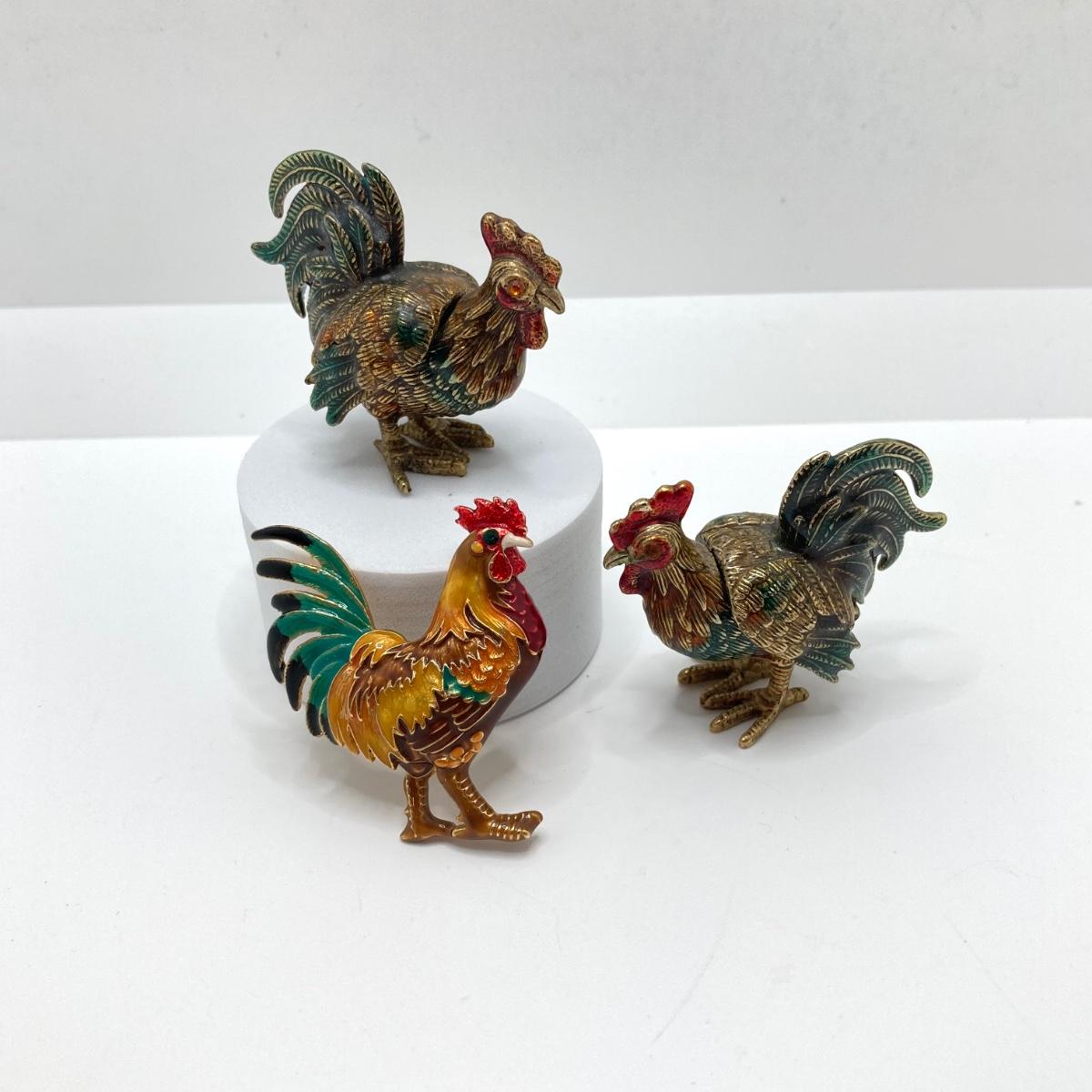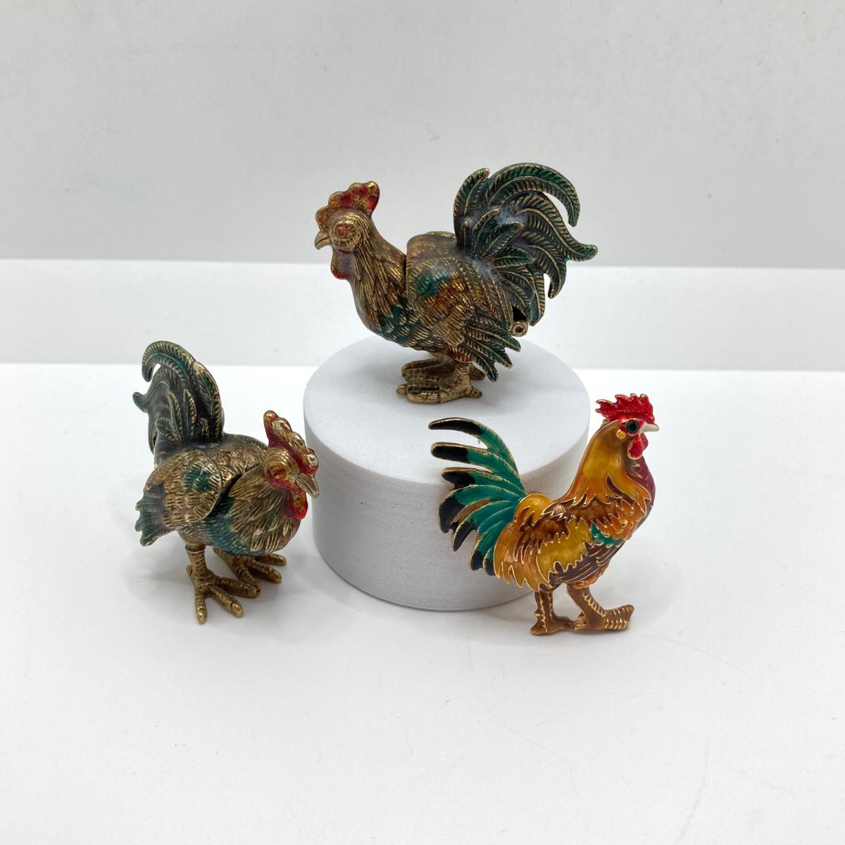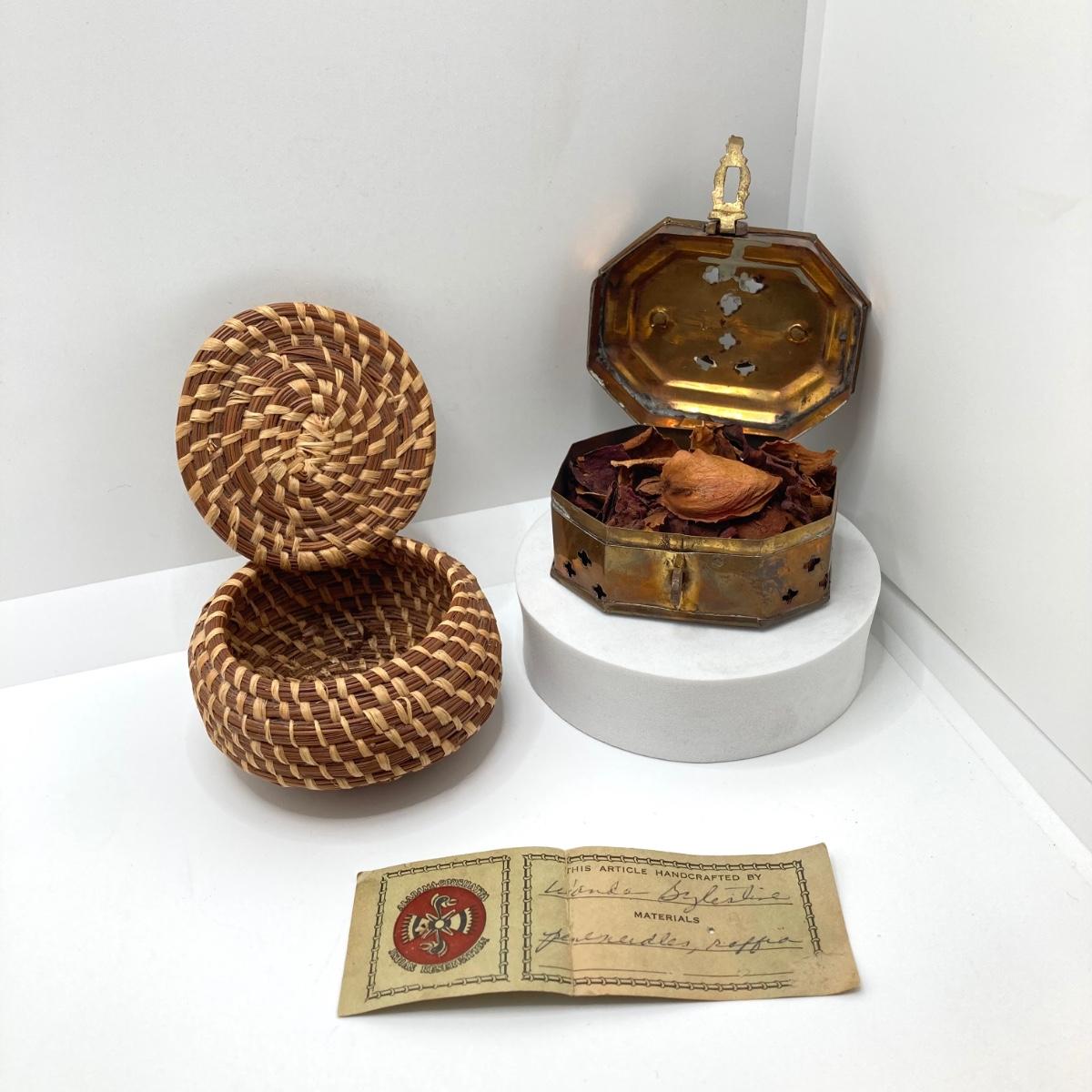 LOT 74: Trinkets and Trinket Holders - Brass Cricket Box, Handcrafted Trinket Basket, Occupied Japan Miniature Pottery, Roosters and Collector Spoons