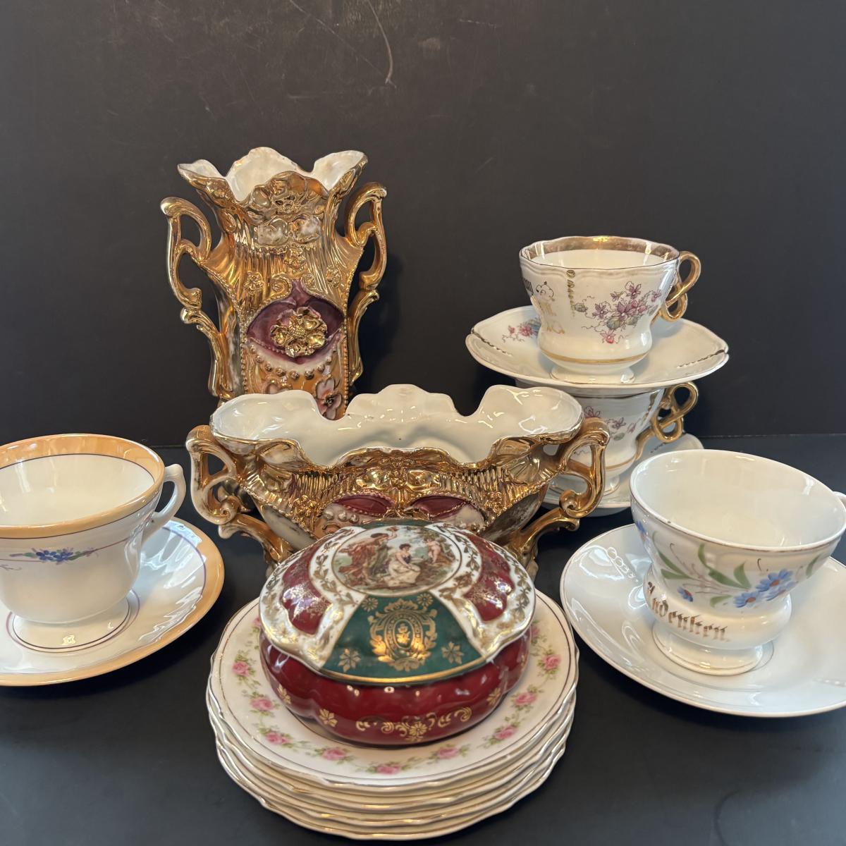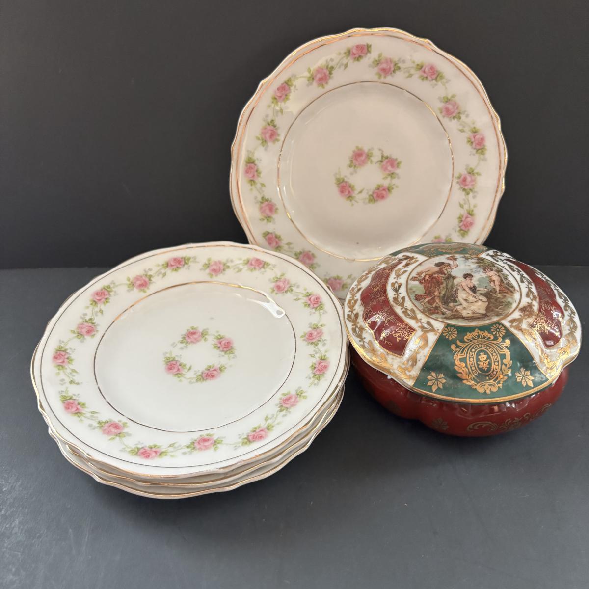 LOT 96: Made in Germany Collection: Oscar Schlegelmilch Porcelain Trinket Box, Carl Thielsch CT Dessert Dishes, Erphila Vases & More