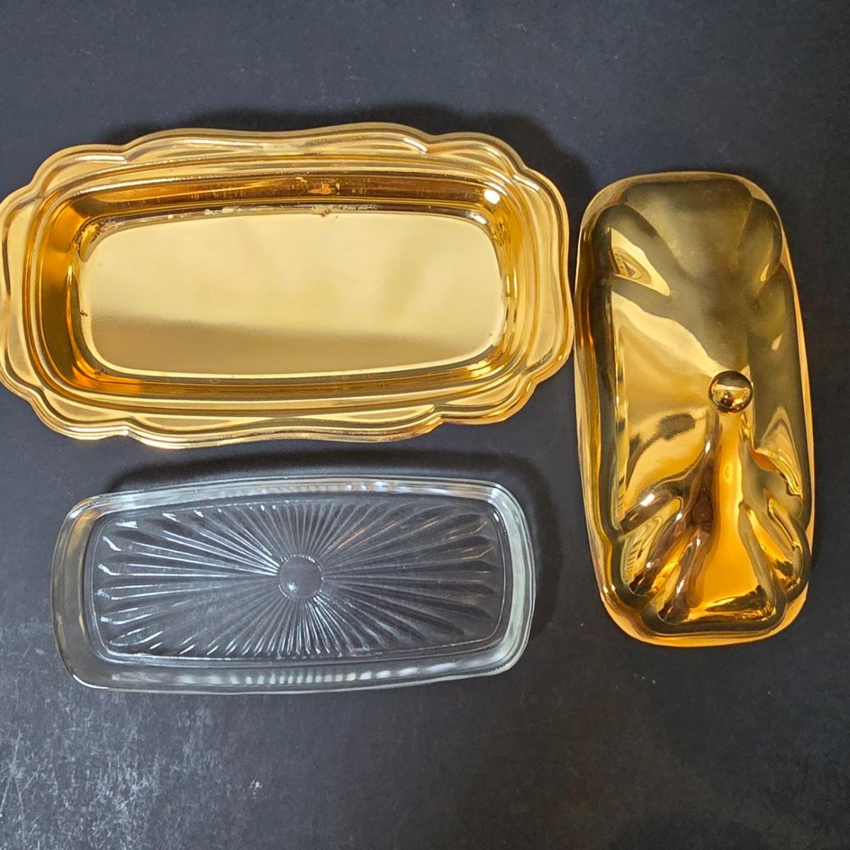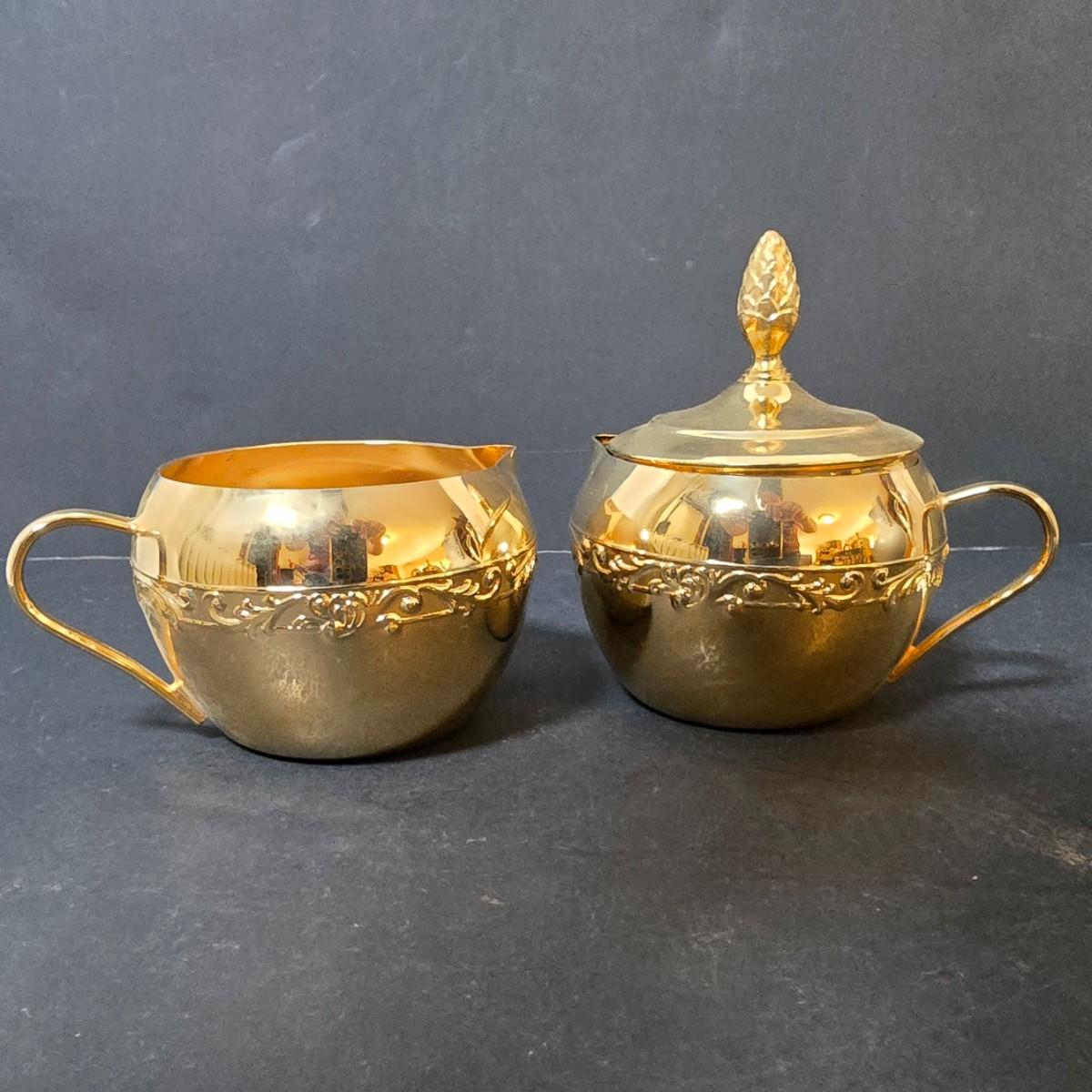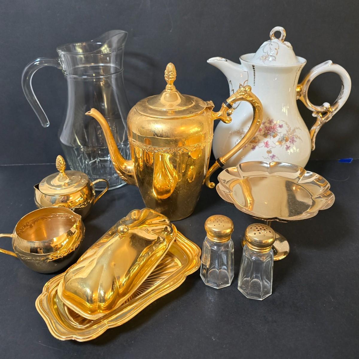 LOT 109: Vintage China Teapot, 24k Gold Plated Leman Butter Dish, Gold Tone Teapot, Sugar Bowl w/Creamer & More