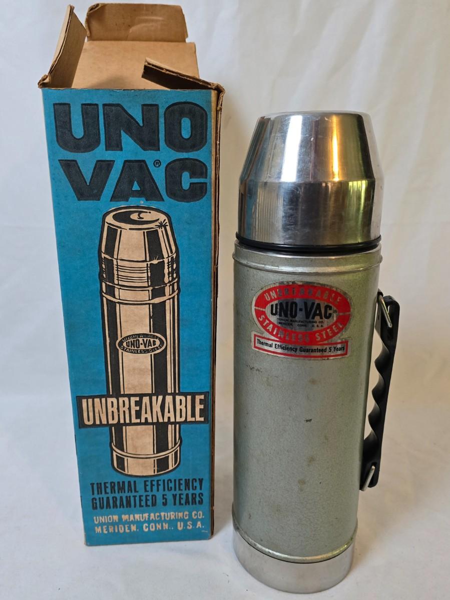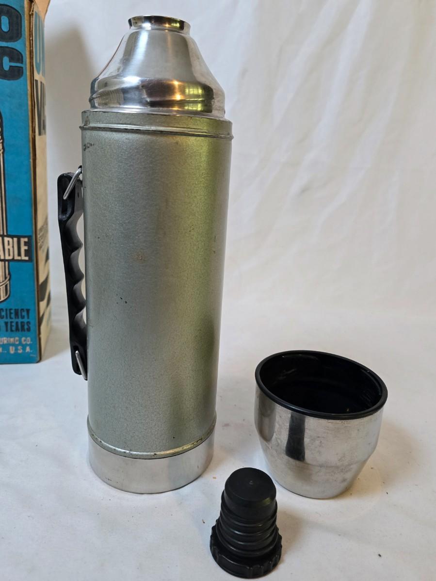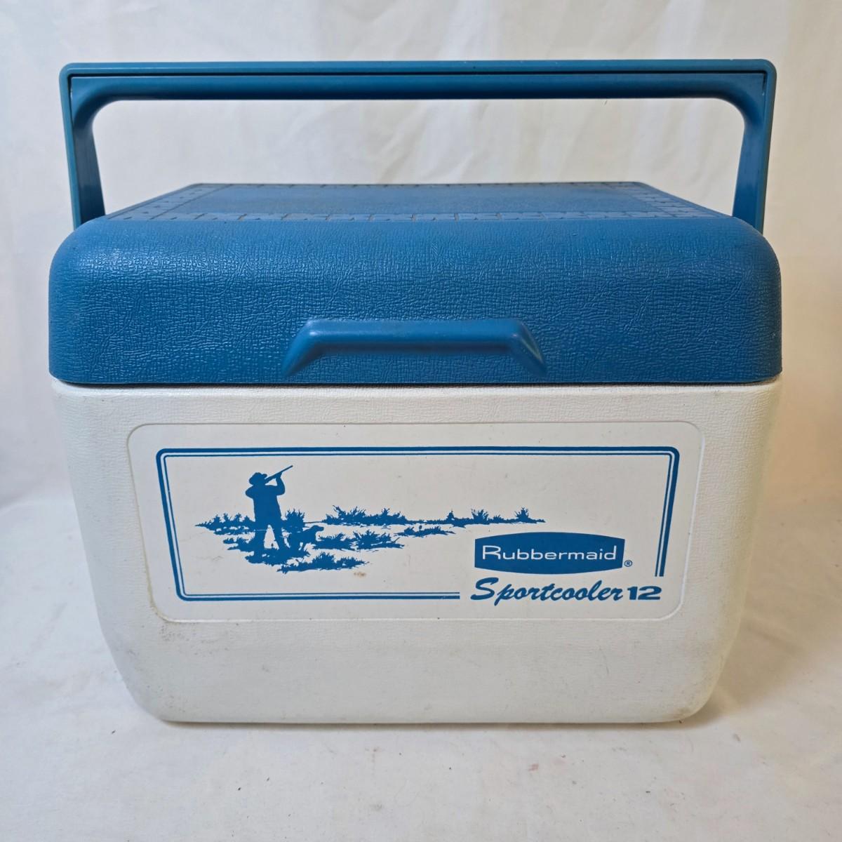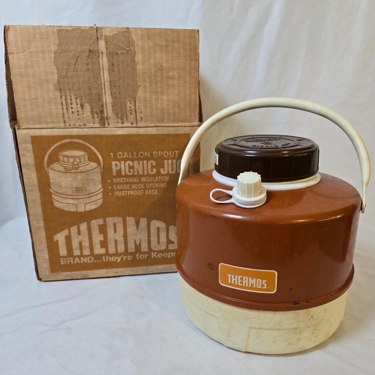 LOT 114: Rubbermaid Cooler, Thermos Picnic Jug, Thermos and UnoVac Vacuum Bottles