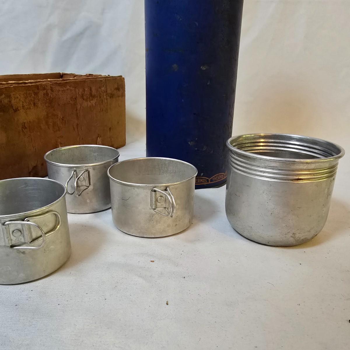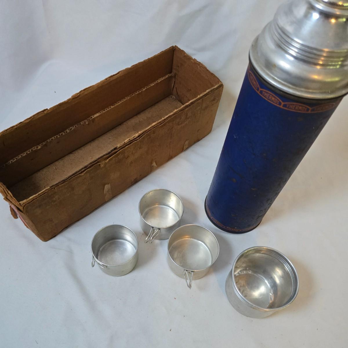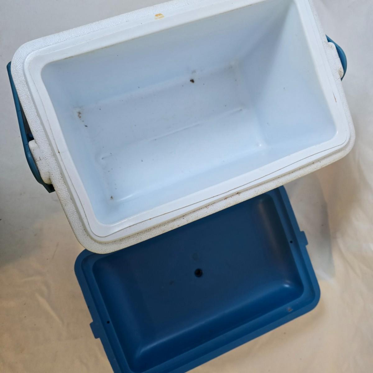 LOT 114: Rubbermaid Cooler, Thermos Picnic Jug, Thermos and UnoVac Vacuum Bottles