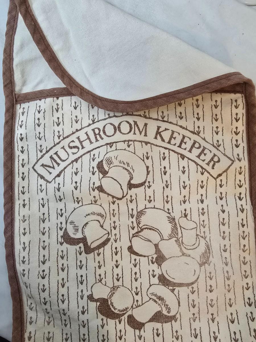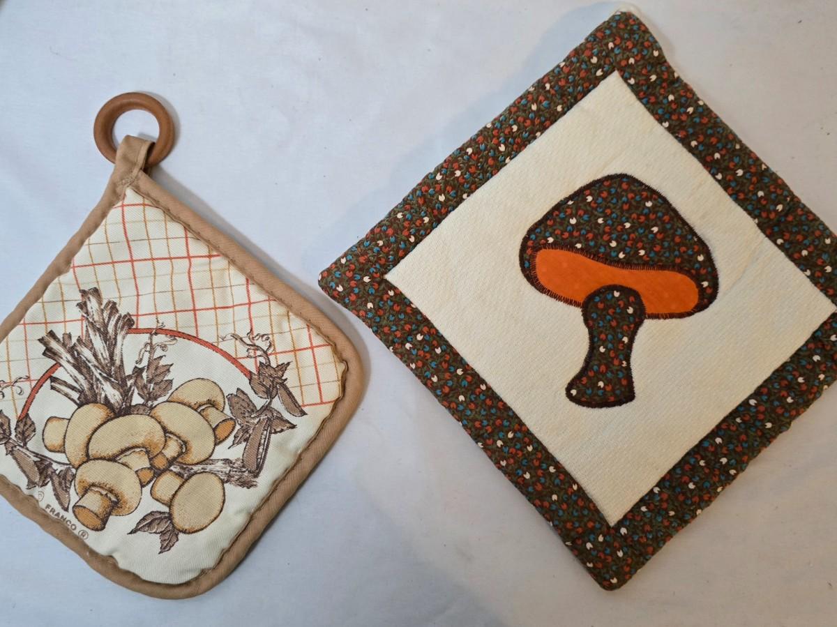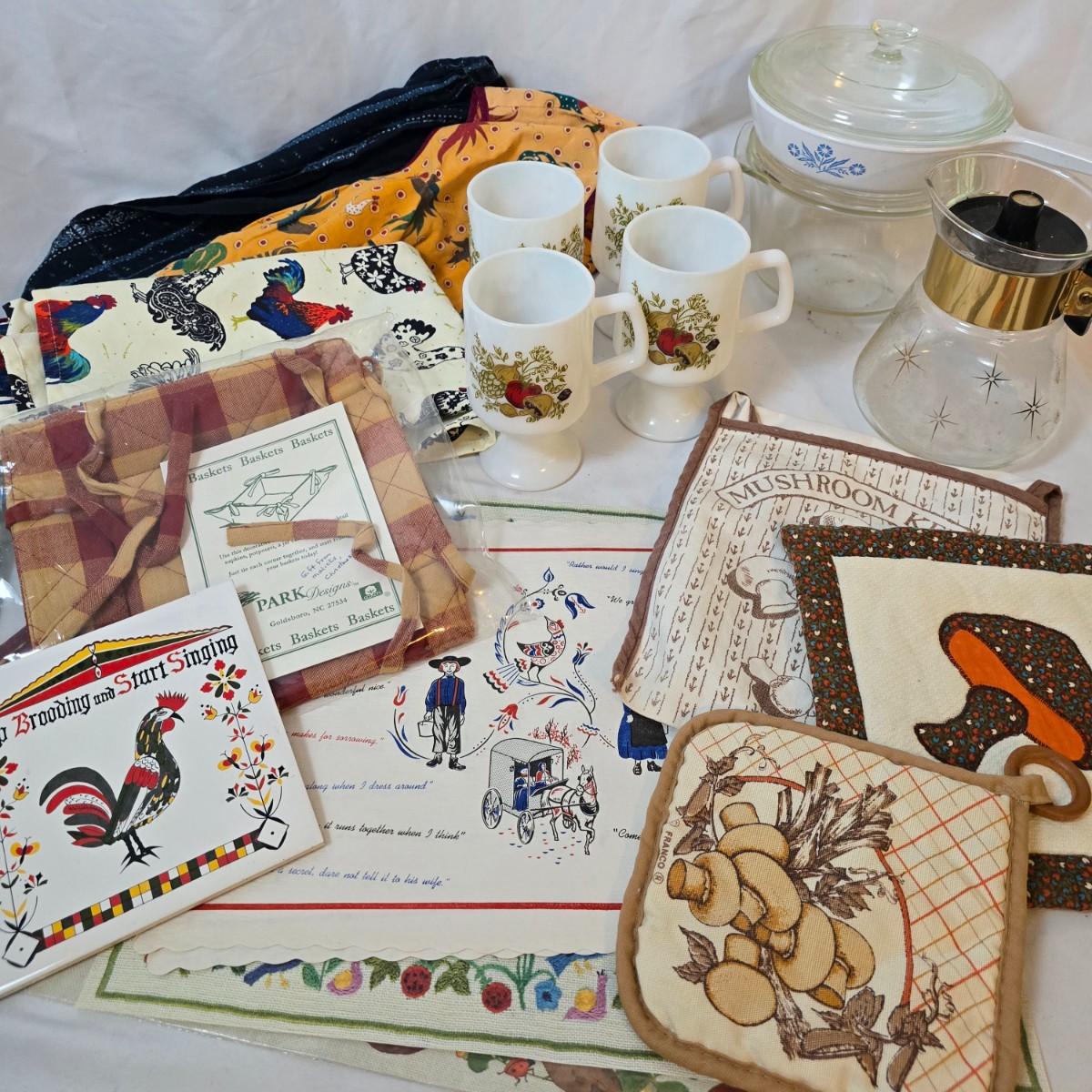 LOT 121: Retro Mushroom Decor with Corning Ware, Pyrex and Milk Glass Mugs, and Aprons