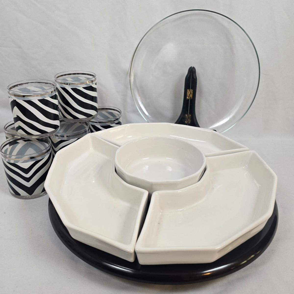 LOT 129: Pfaltzgraff Lazy Susan and MCM "Zebra" Print Glasses