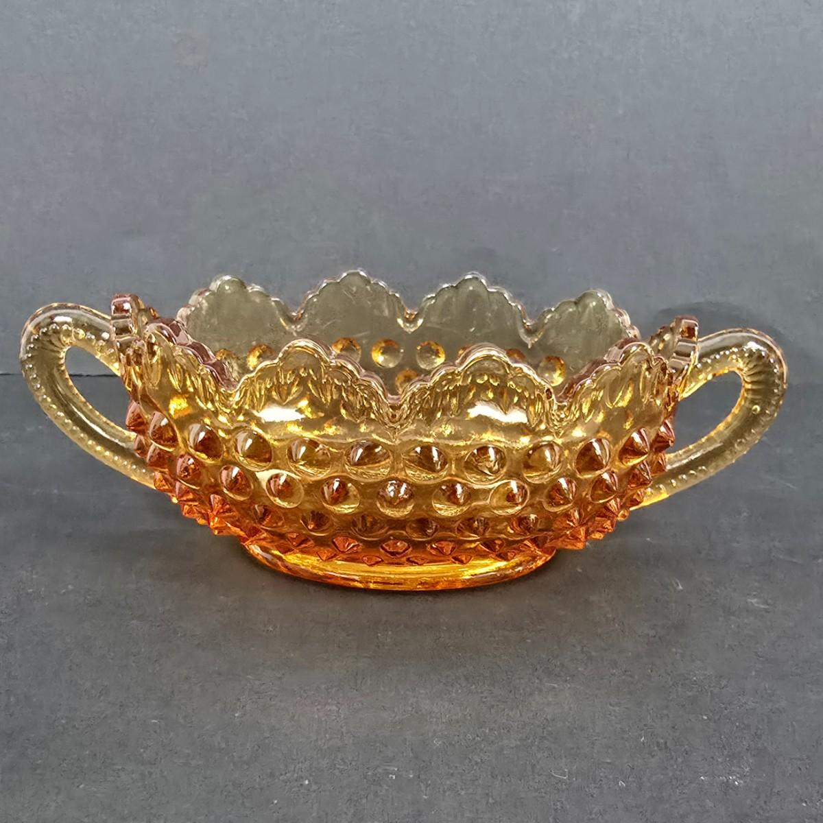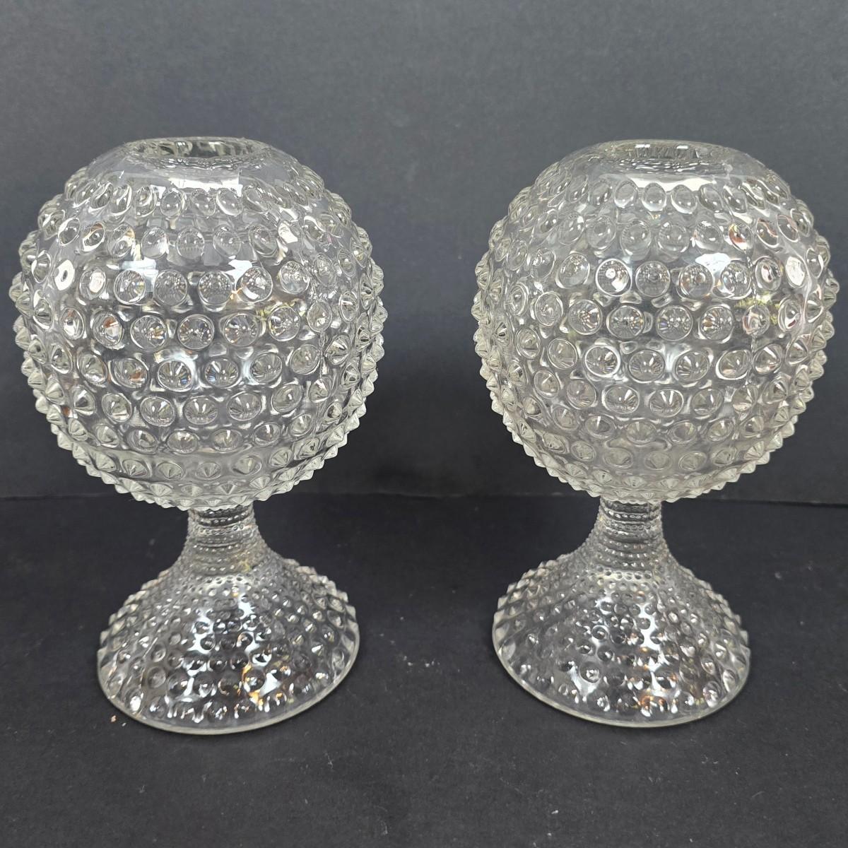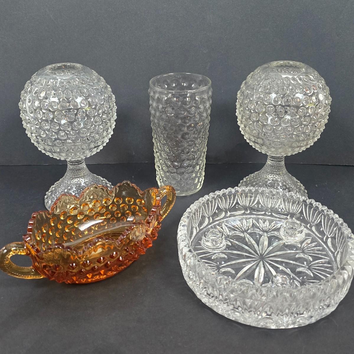 LOT 133: Vintage Hobnail Duncan Miller Footed Clear Glass Ball Vases, Amber Hobnail Candy Dish and Crystal 3 Taper Candle Holder