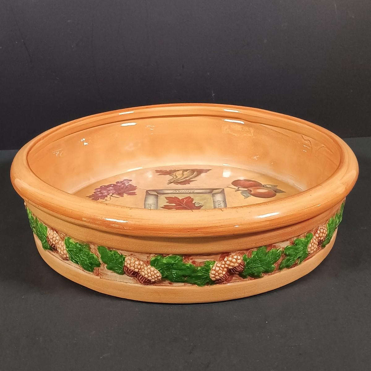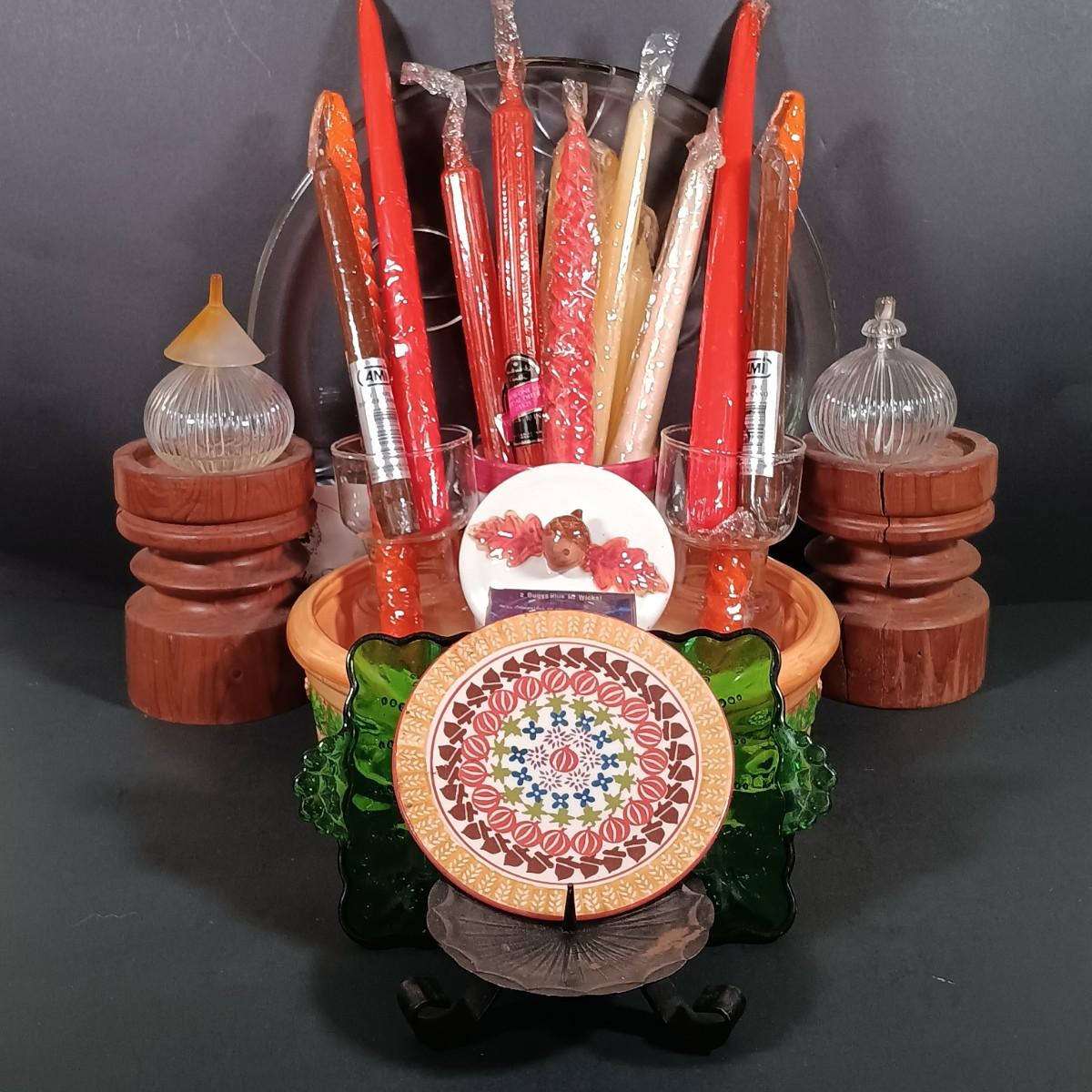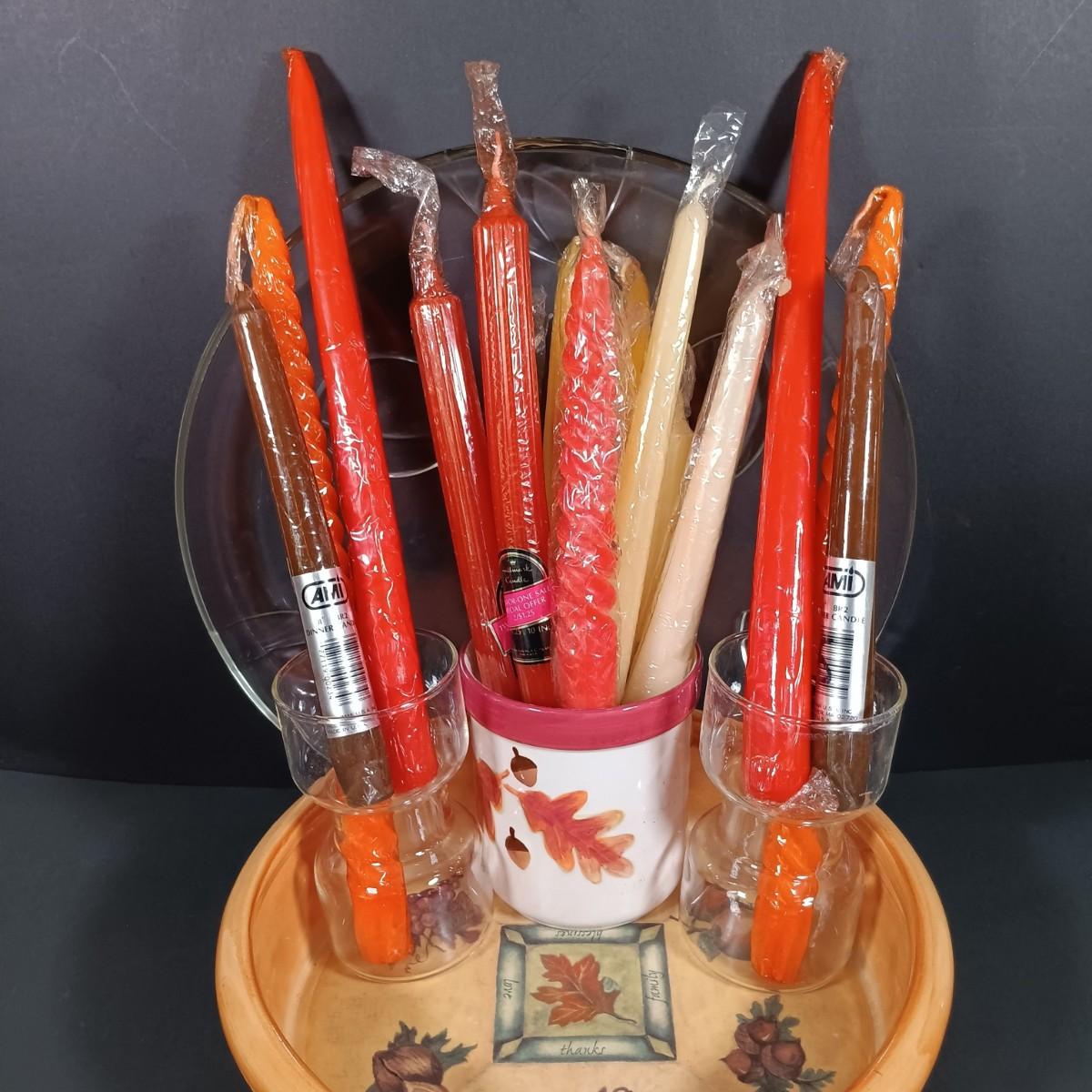 LOT 140: Fall Decor and More with Candles, Candle Holders, Ceramic Serving Bowl, Glass "leaf" Platter