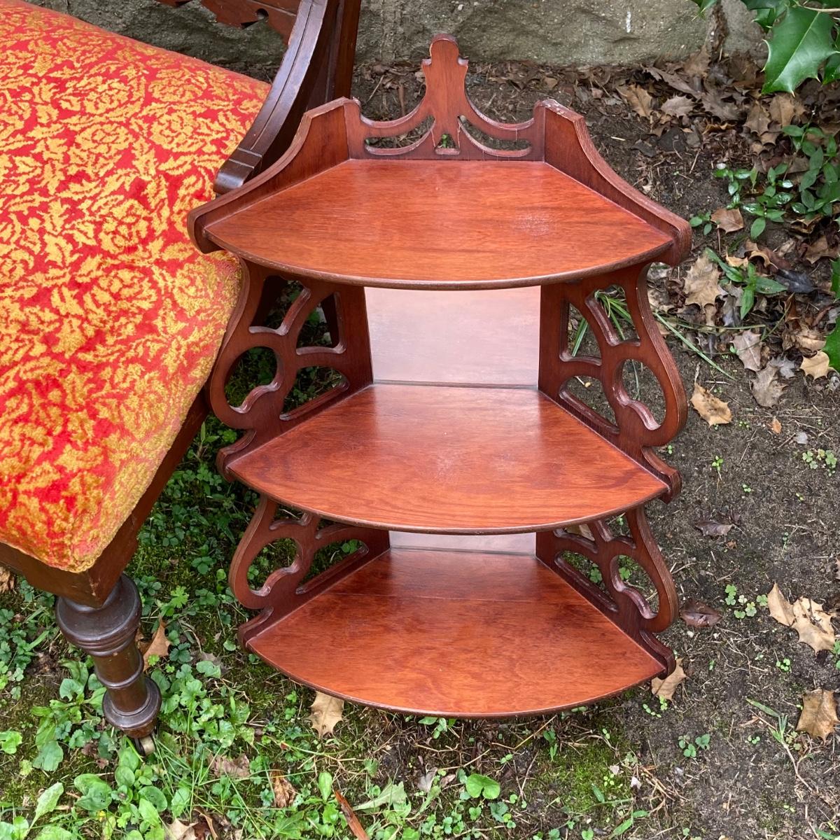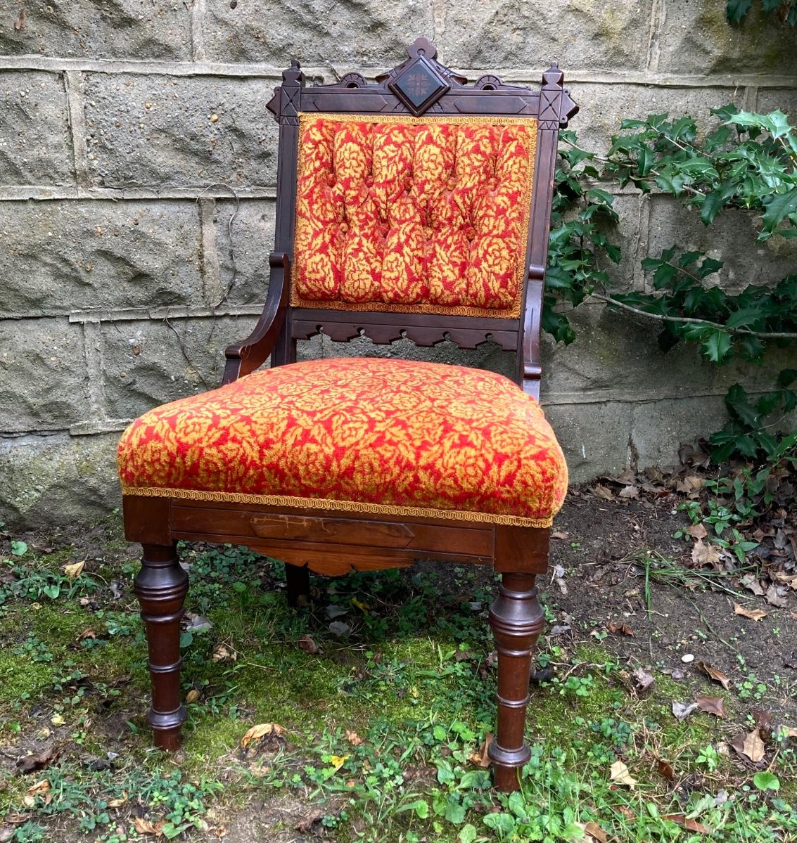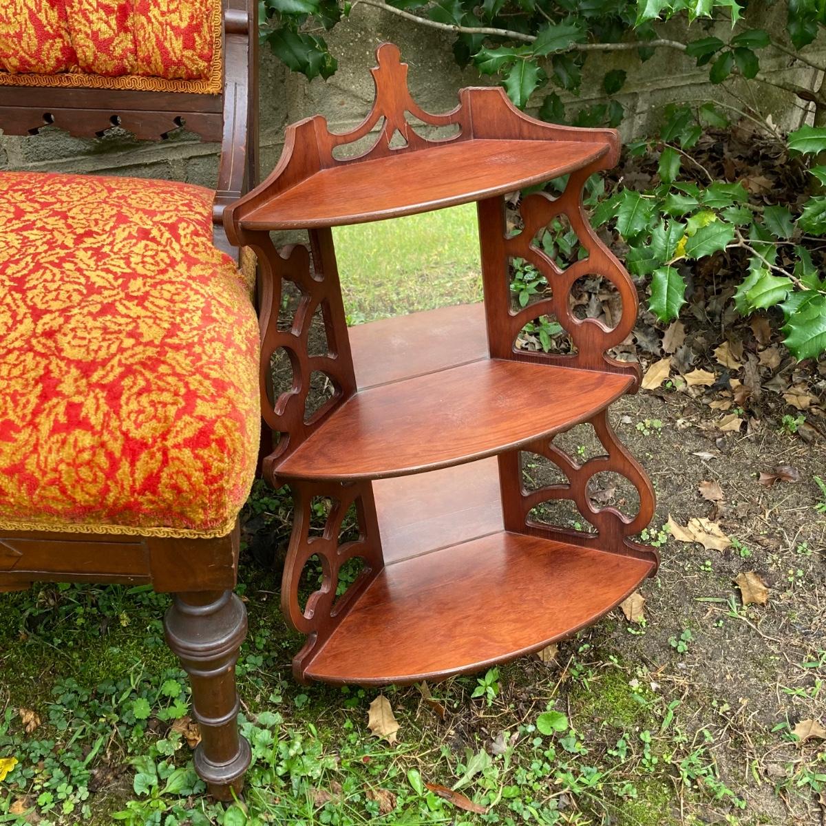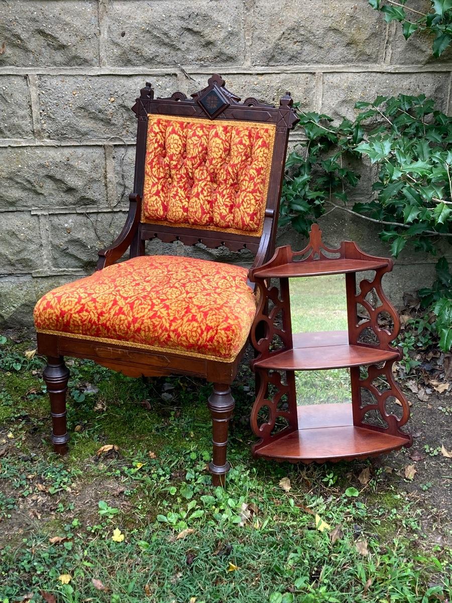 LOT 170: Carved and Upholstered Victorian Chair with Mirrored / Wood Corner Shelf