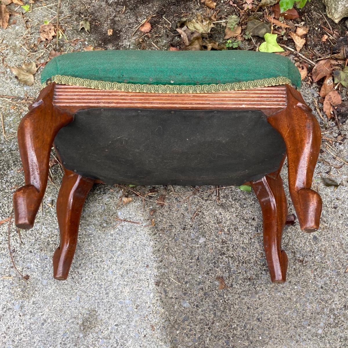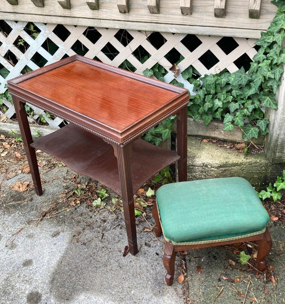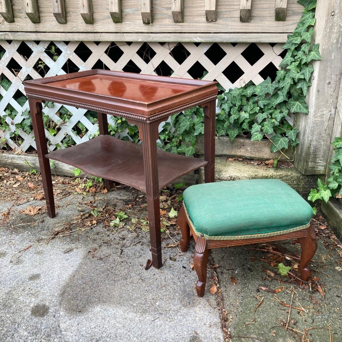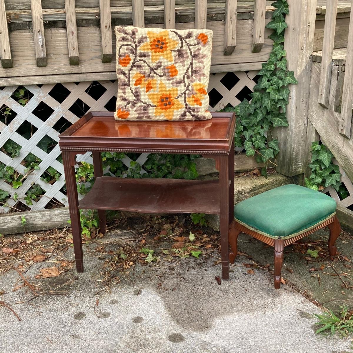 LOT 173: Vintage Ornate Wood Table with Foot Stool and Accent Pillow