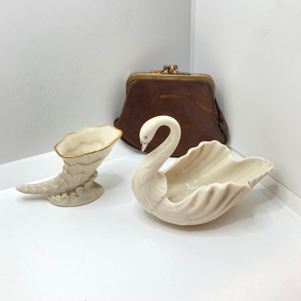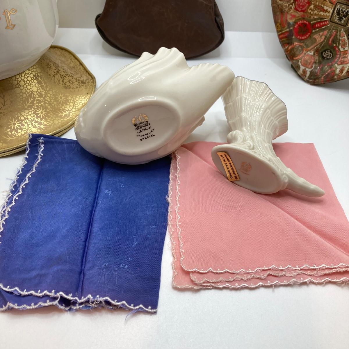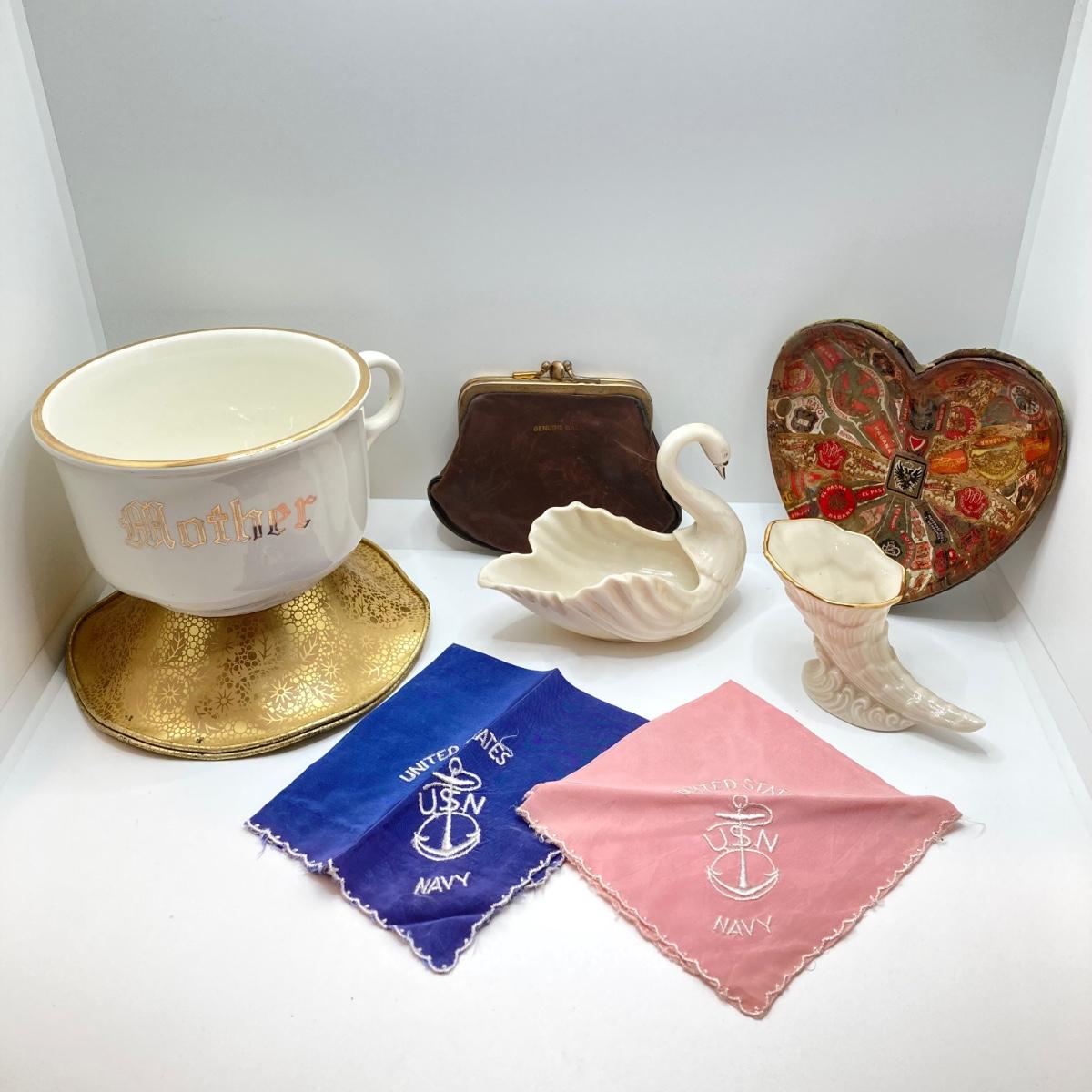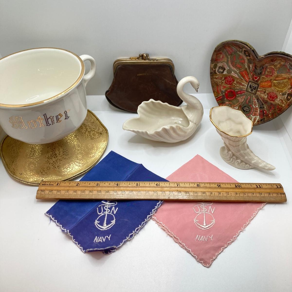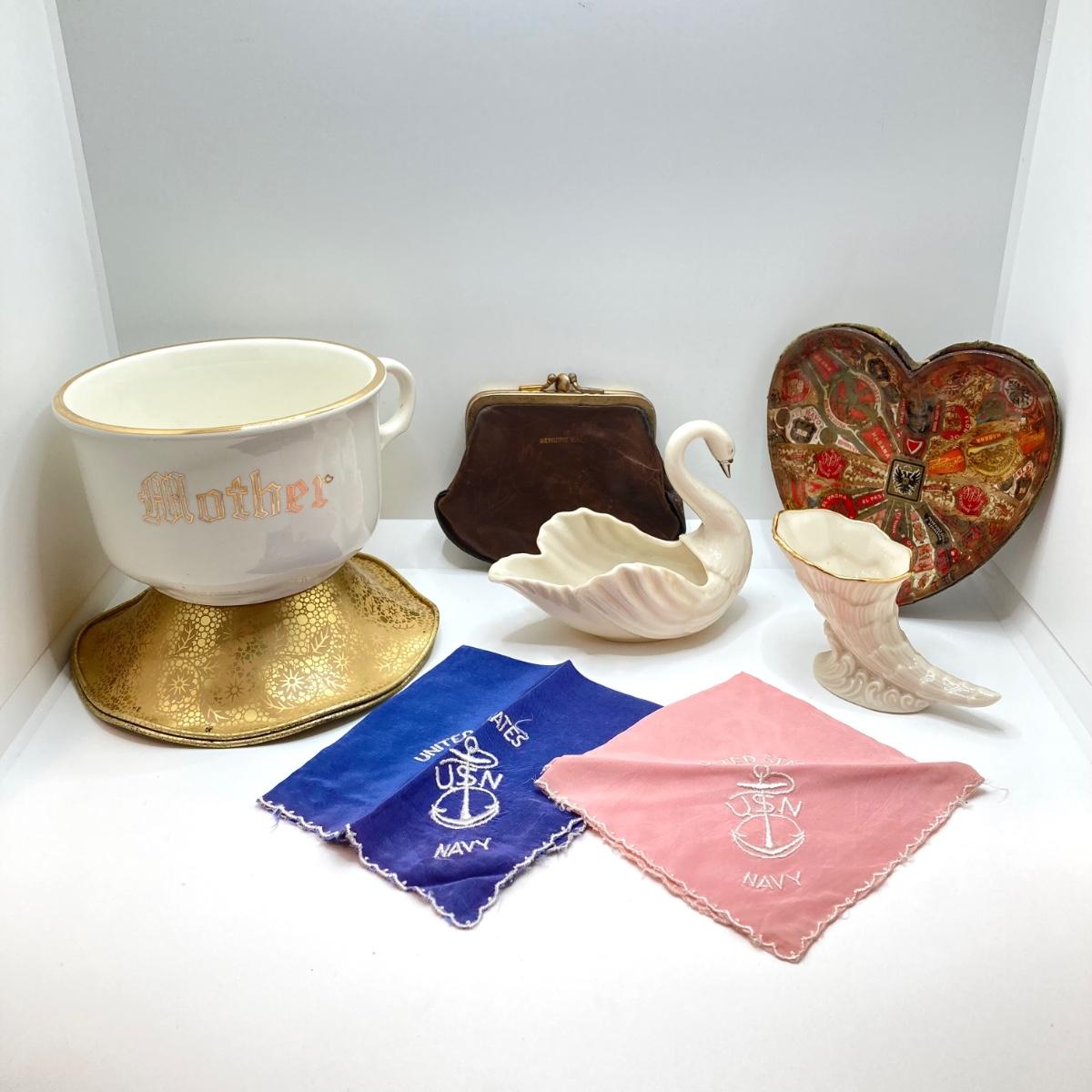 LOT 175: Antique / Vintage Ladies' Collection - Beautiful Heart Shaped Trinket Dish, Lenox China Swan / Cornucopia, USN Navy Handkerchiefs, Mother Cup, Leather Change Purse and More