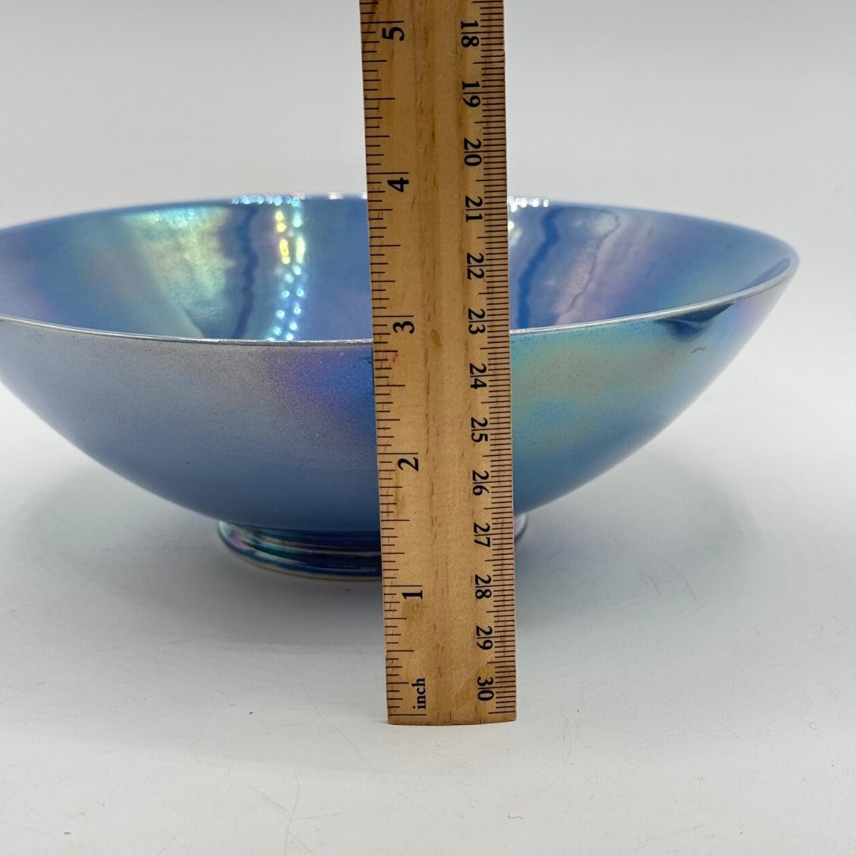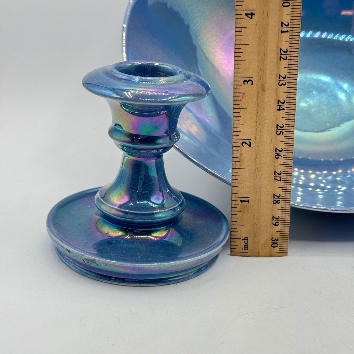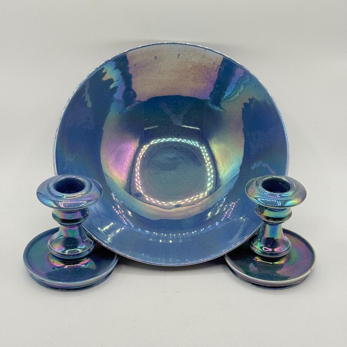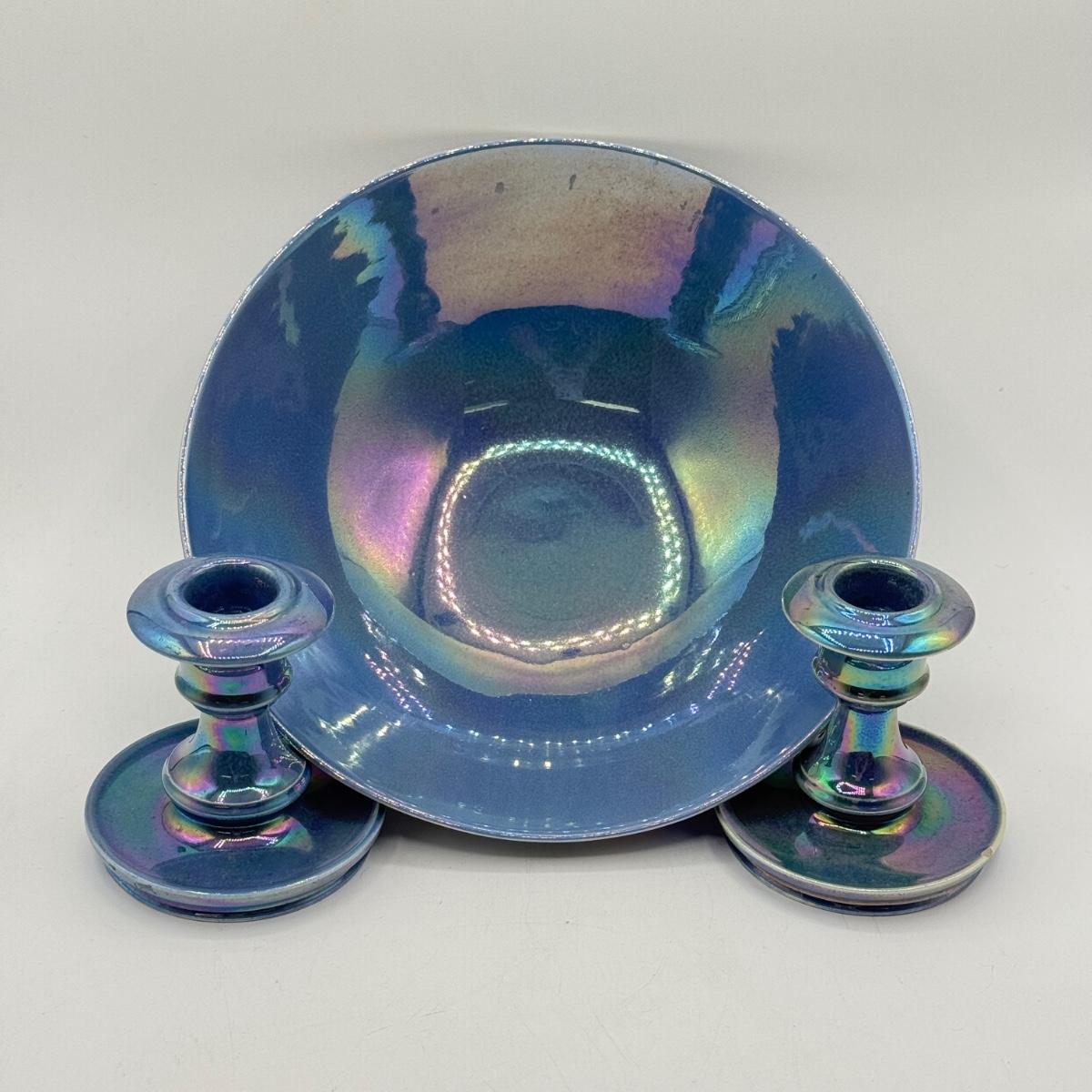 LOT 10: Cowan Pottery Blue Iridescent Bowl & Matching Pair of Candle Holders
