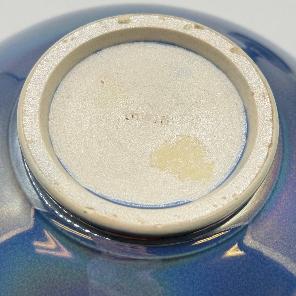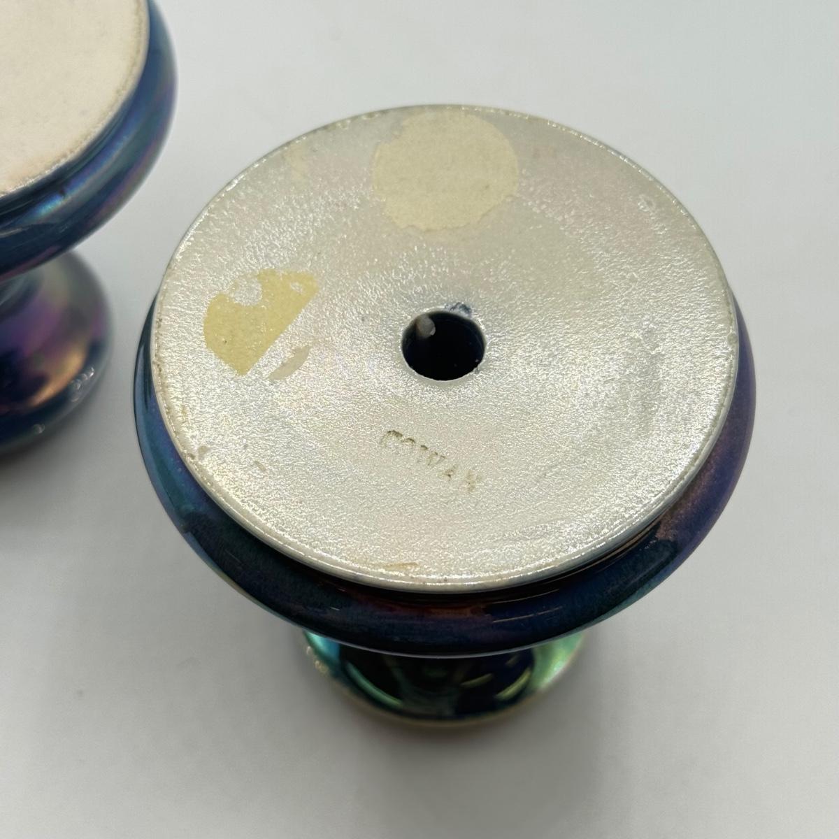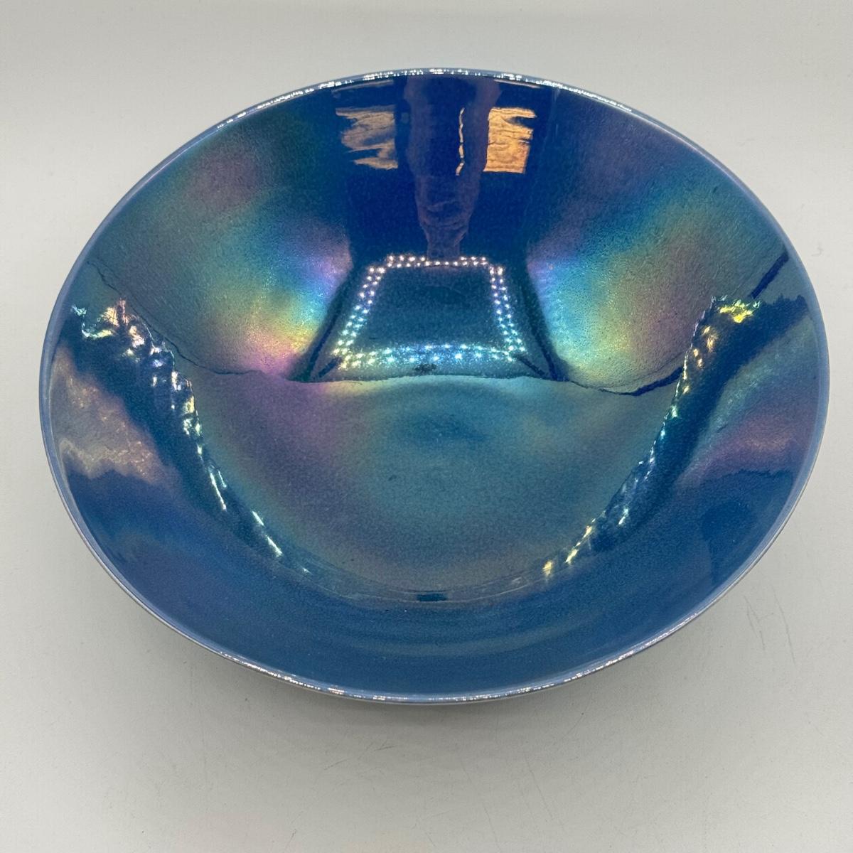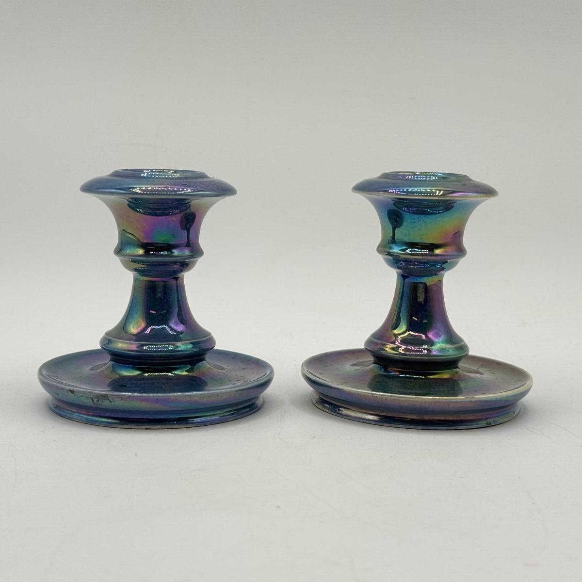 LOT 10: Cowan Pottery Blue Iridescent Bowl & Matching Pair of Candle Holders
