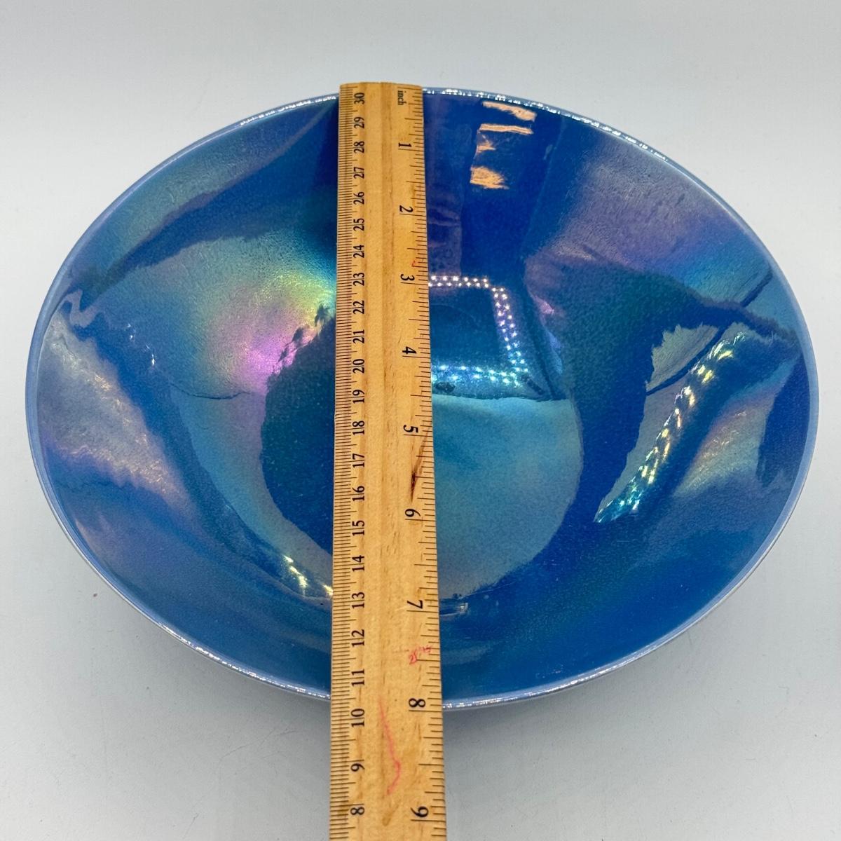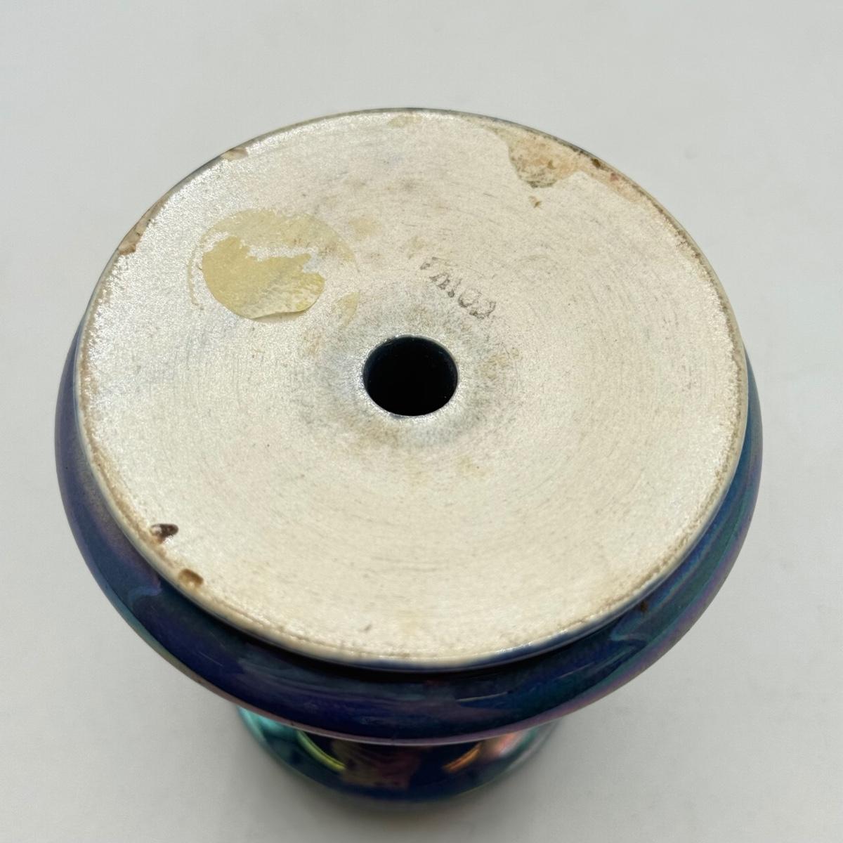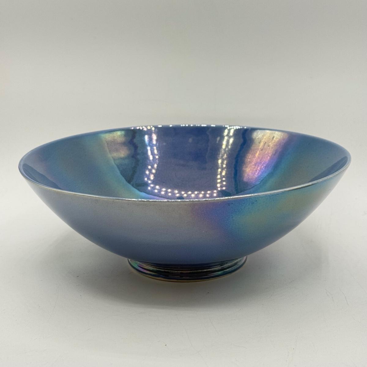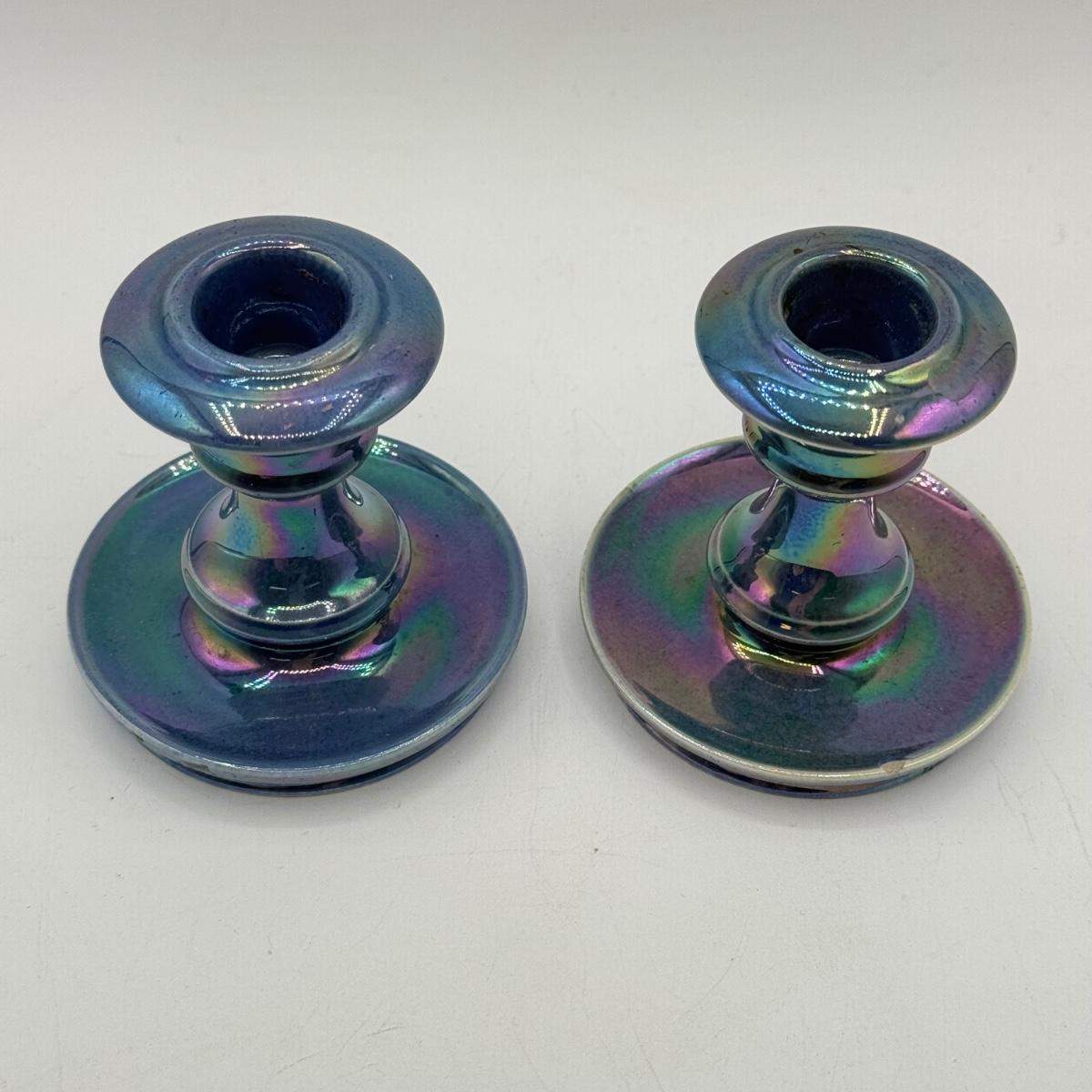 LOT 10: Cowan Pottery Blue Iridescent Bowl & Matching Pair of Candle Holders