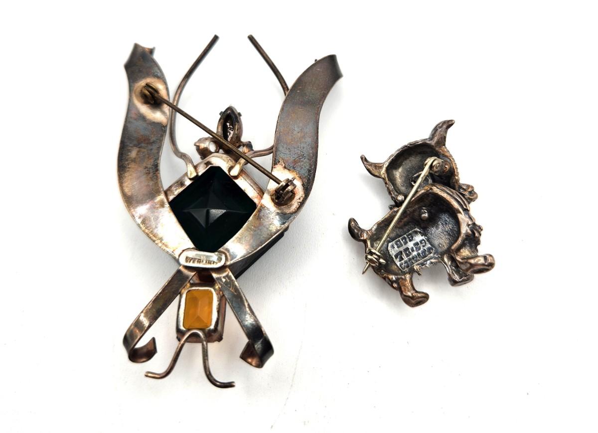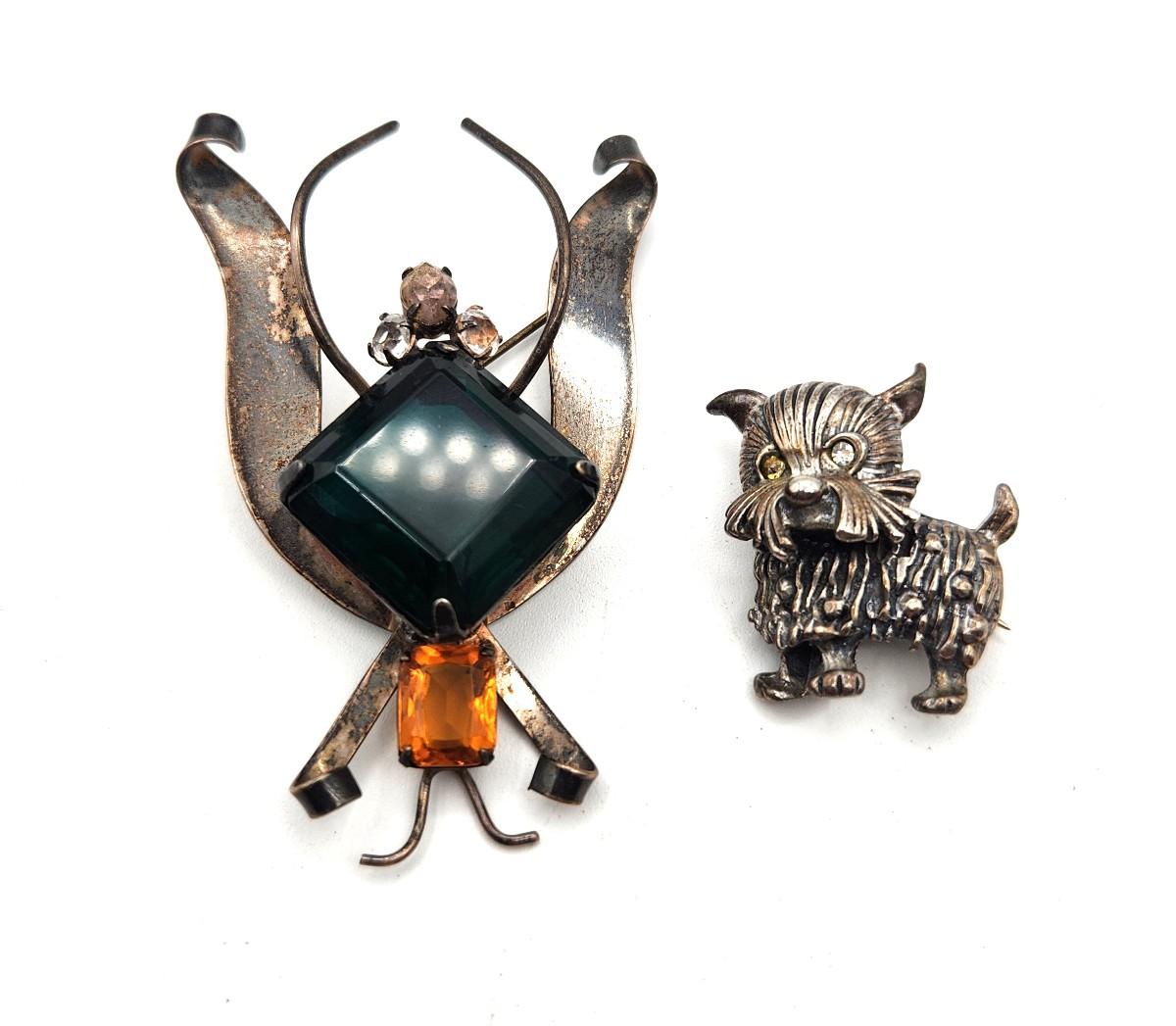Lot of 2 vintage sterling (marked) brooches - large insect with prong set faux stones and a cute little puppy. For scale, the bug is 3" tall. Could use a polish - otherwise, good condition.