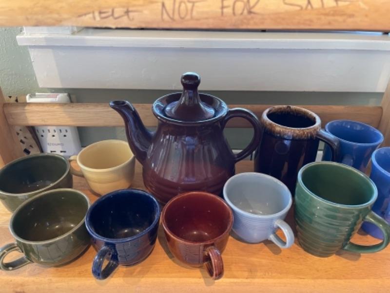 Lot 116K. Assortment of pottery mugs, cups, bowl, teapot--$50