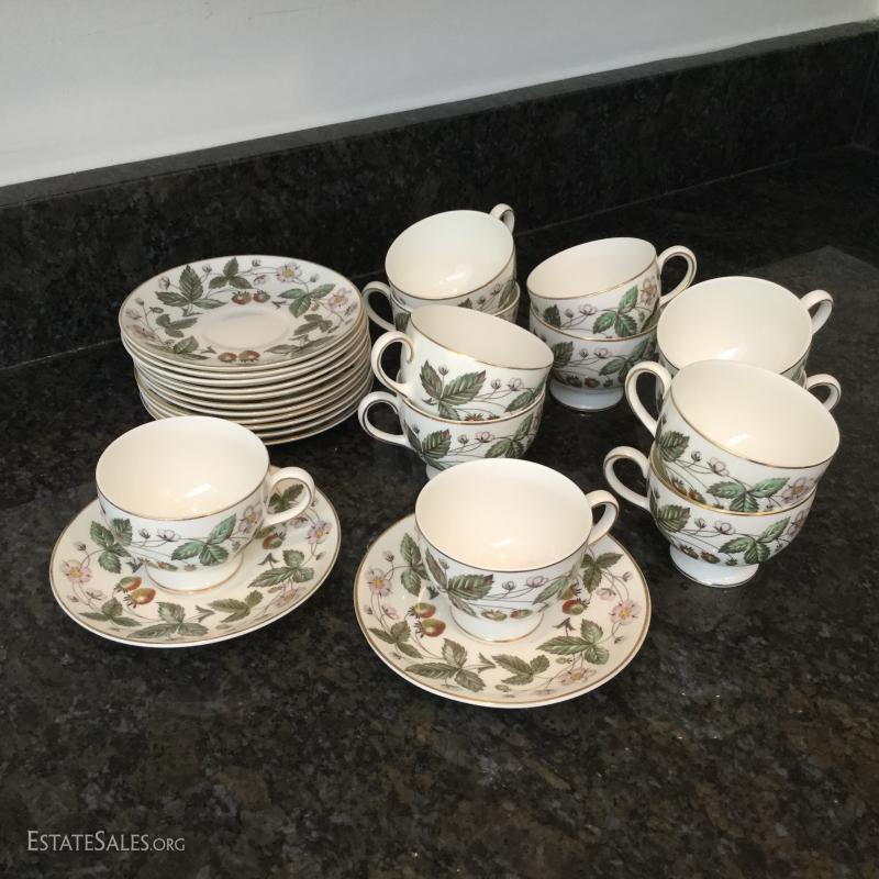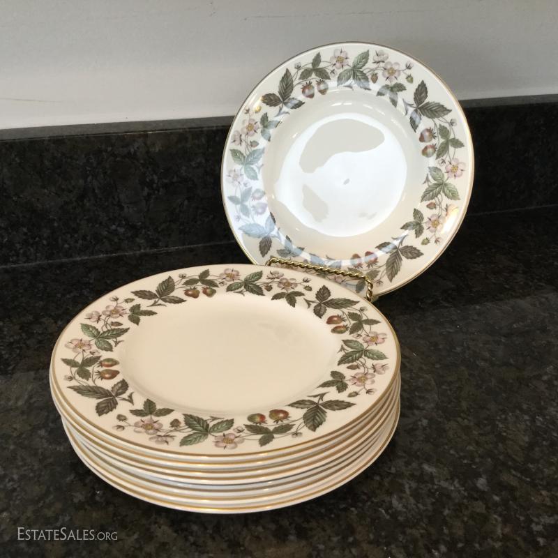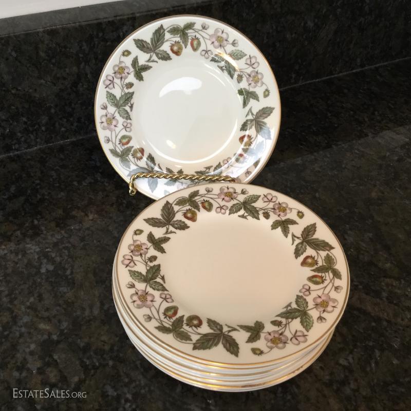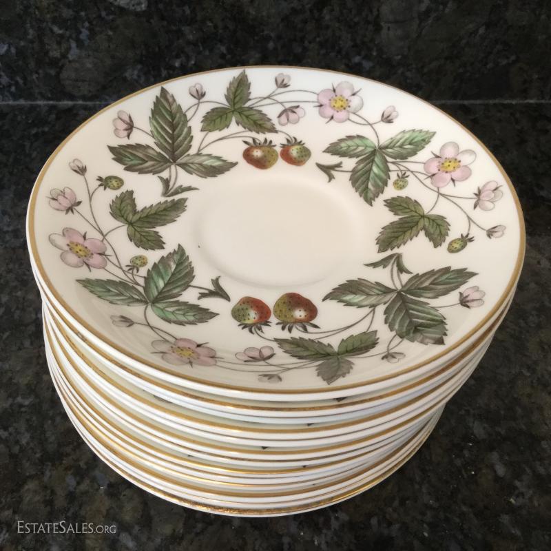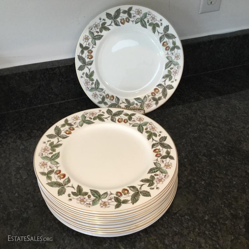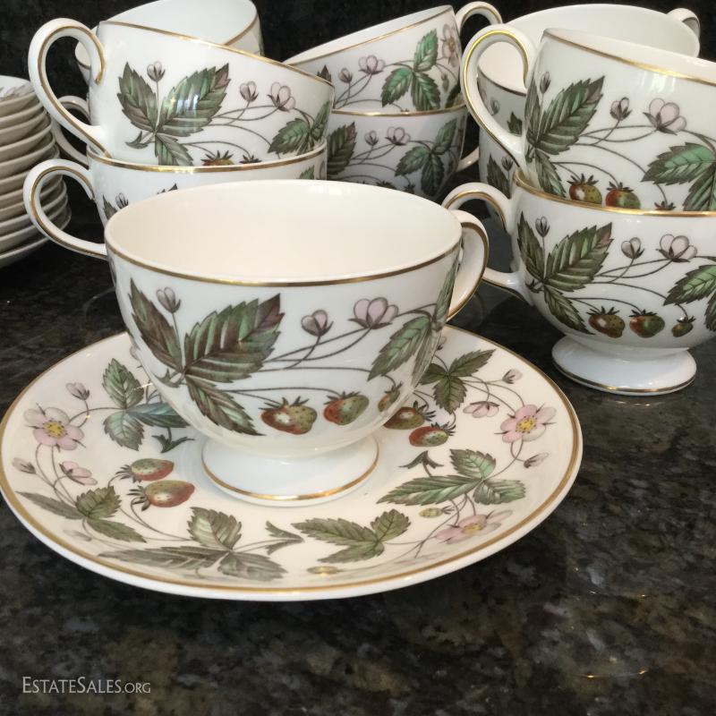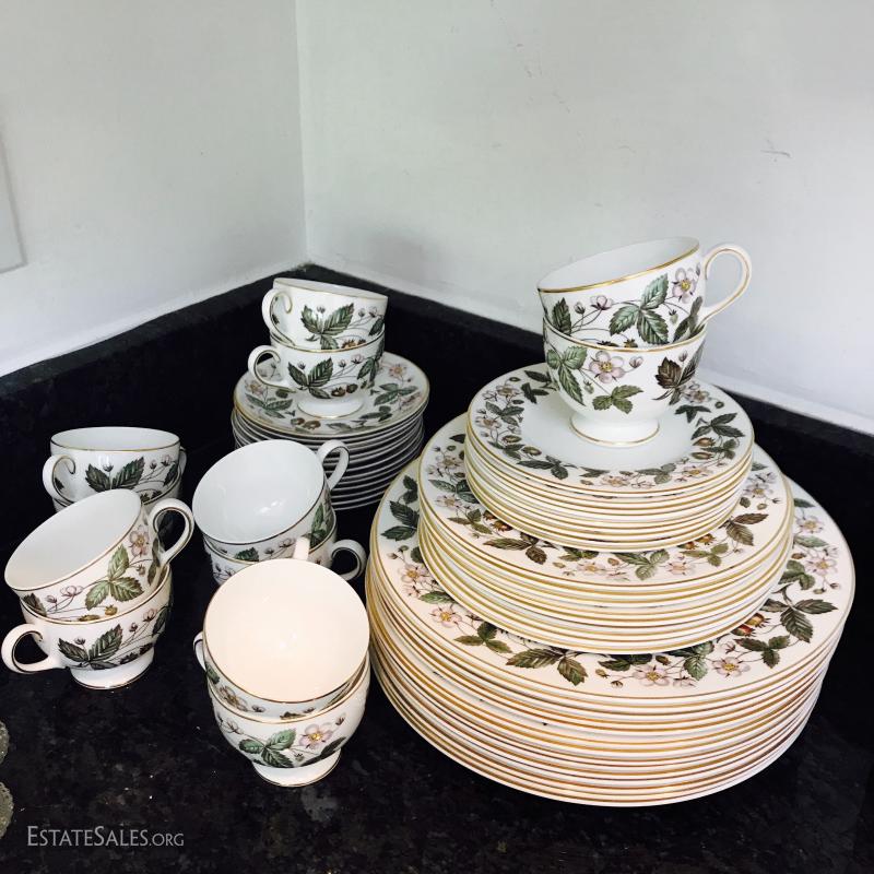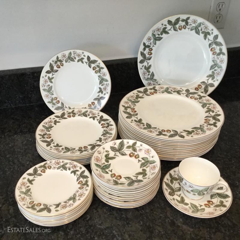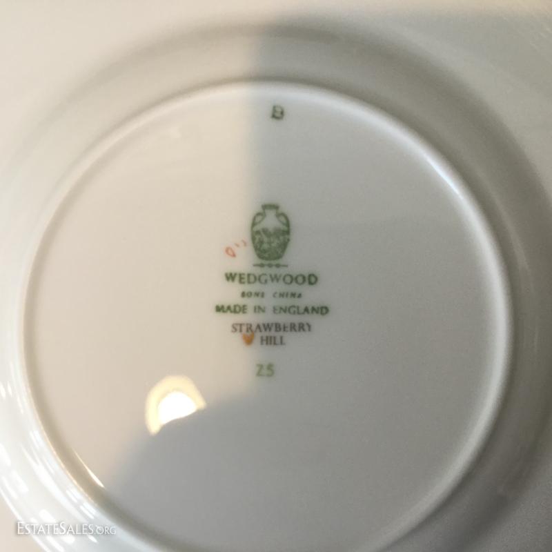 Gorgeous Wedgwood china set in Strawberry Hill pattern. 57 pieces. One of the saucers has a slight difference in logo and size. See photos. Shipping available or local pick up in Flat Rock, NC.