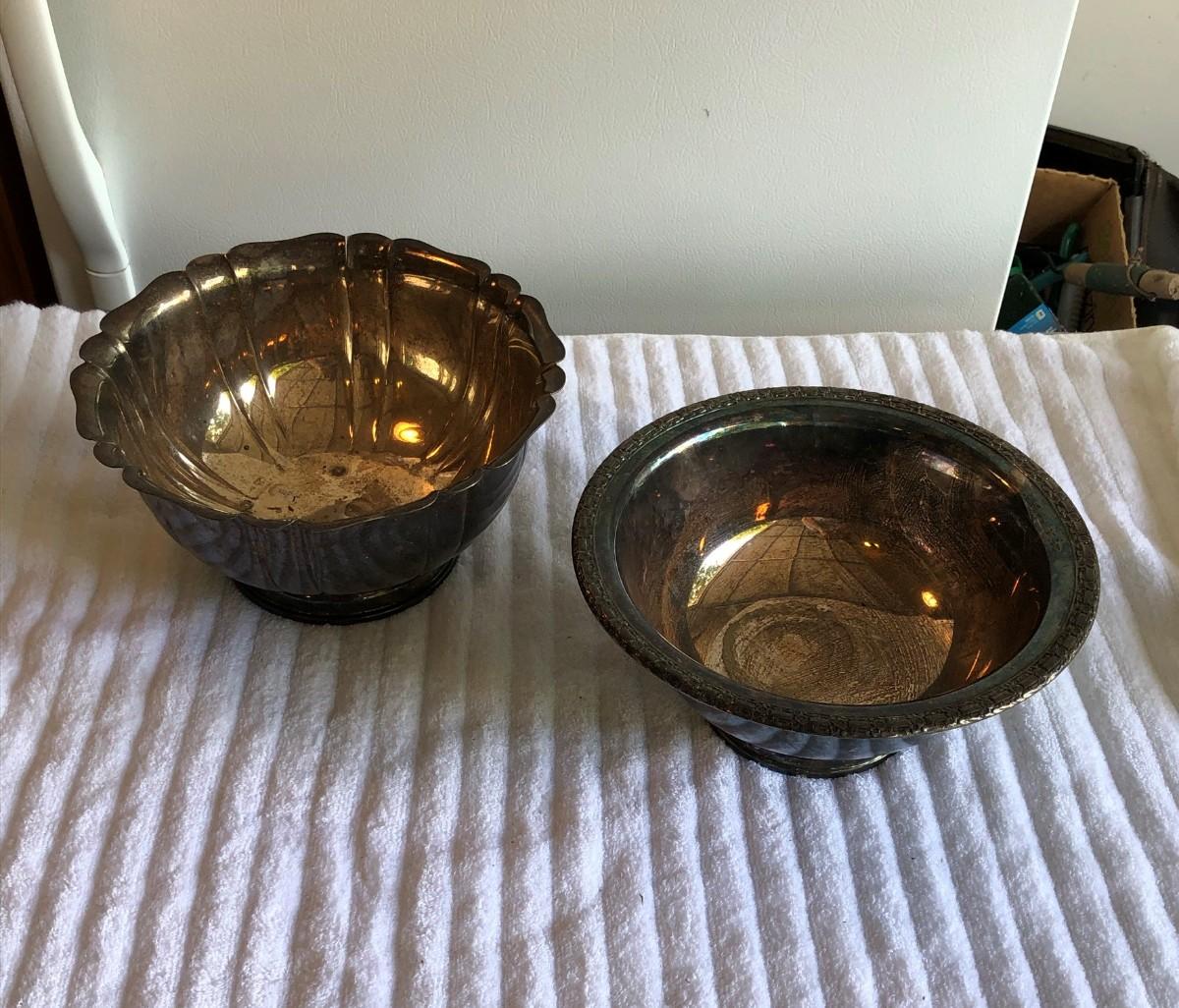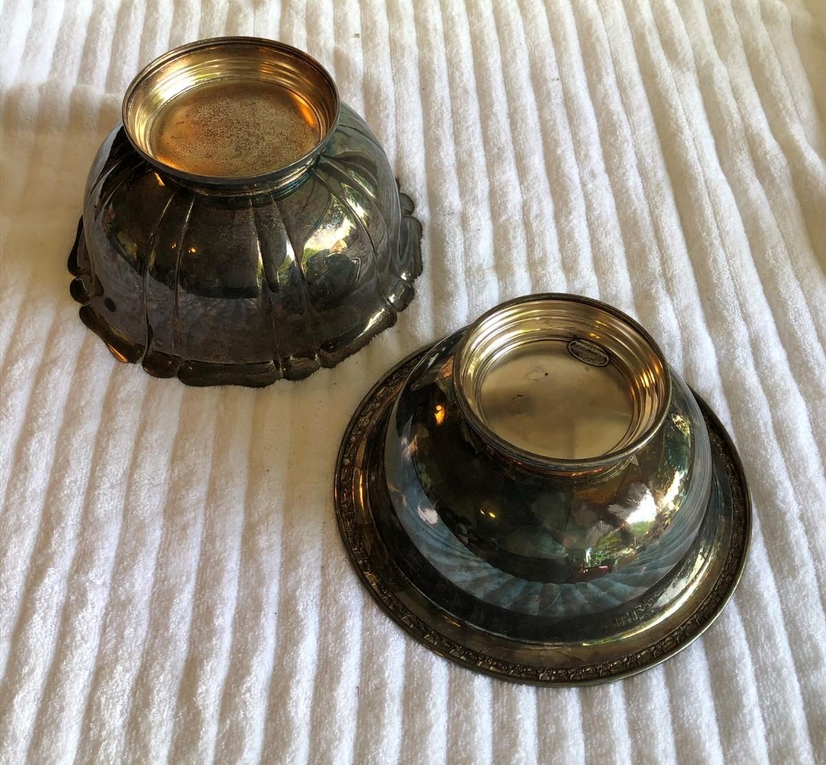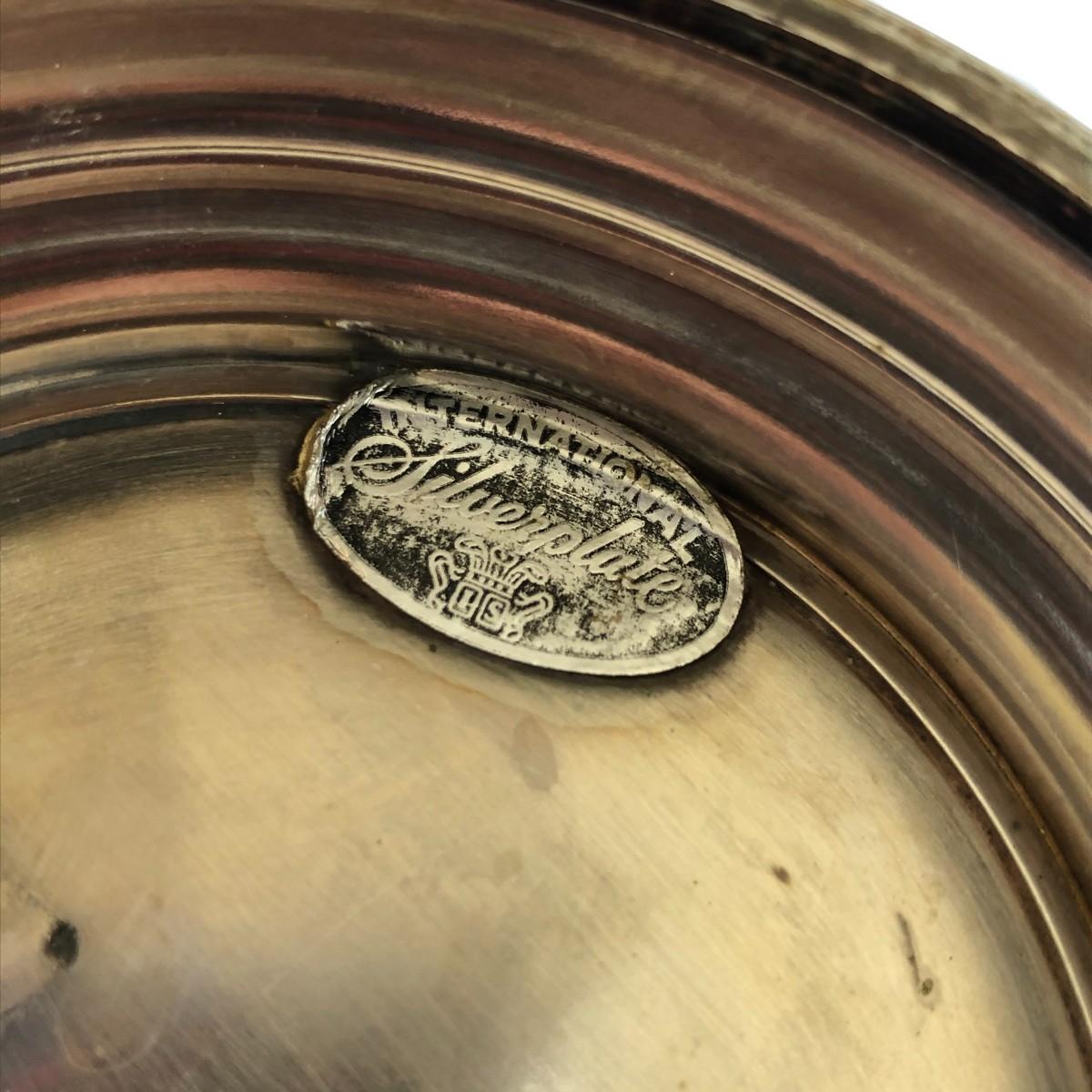 Both look like they just need a good polishing. The one has a sticker identifying it as International Silverplate.