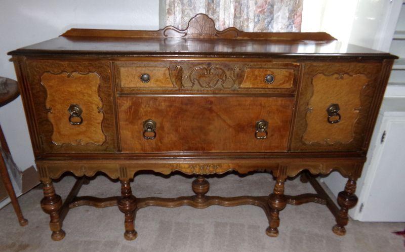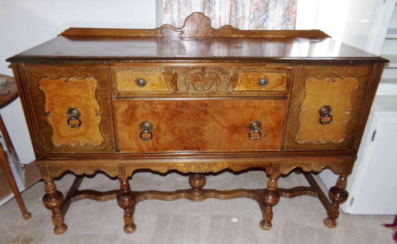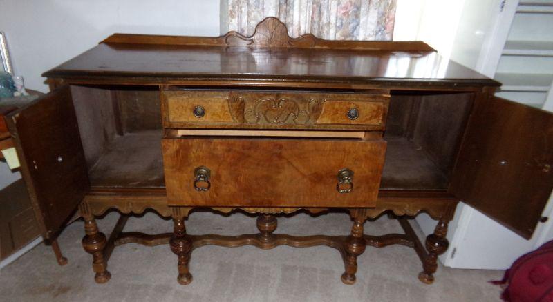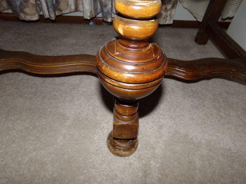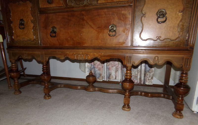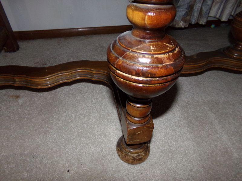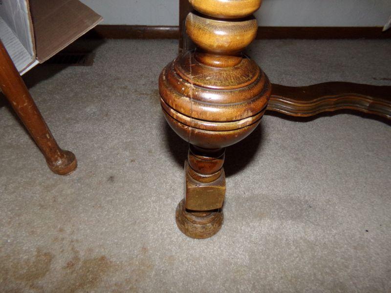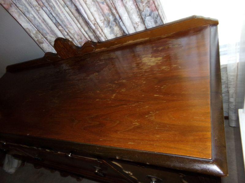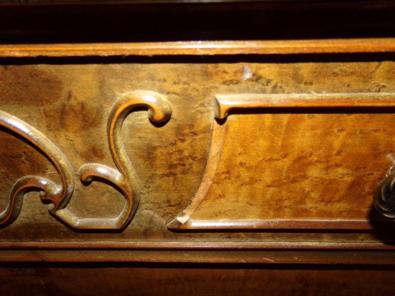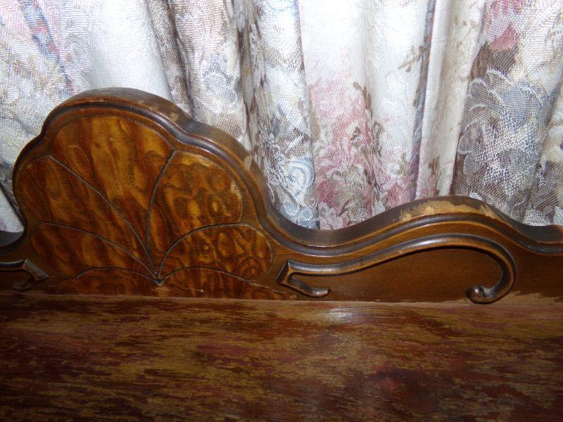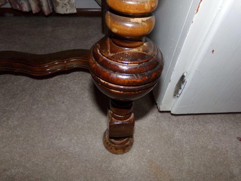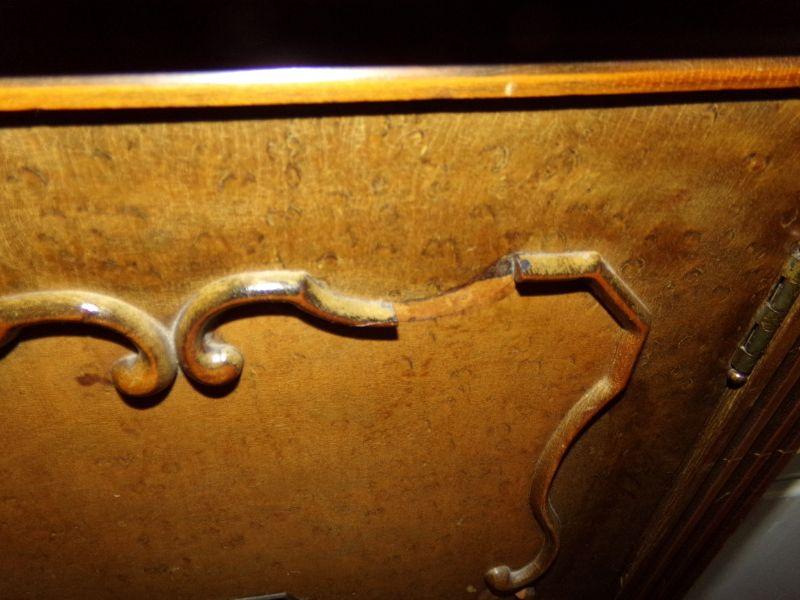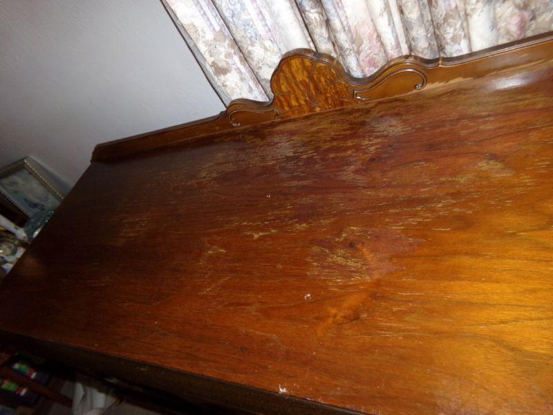 THIS PIECE IS BEAUTIFUL BUT NEEDS SOME WORK. THE TOP NEEDS TO BE REFINISHED, SOME OF THE WOOD TRIM IS MISSING AND THE LEGS ARE NICKED AND GOUGED.