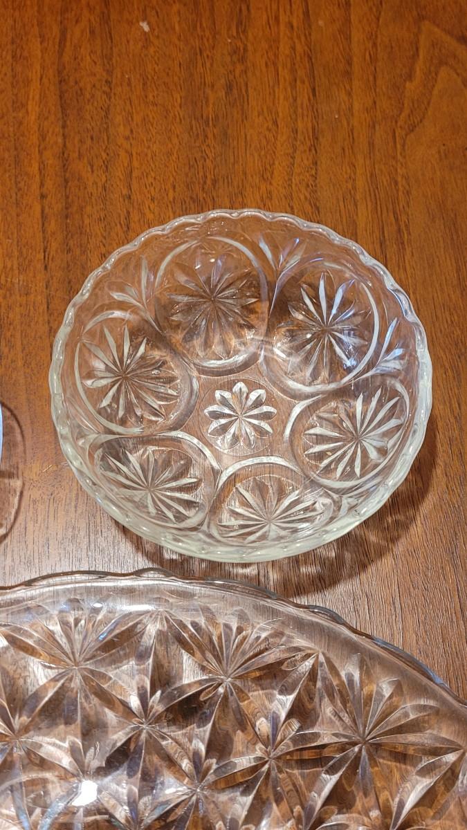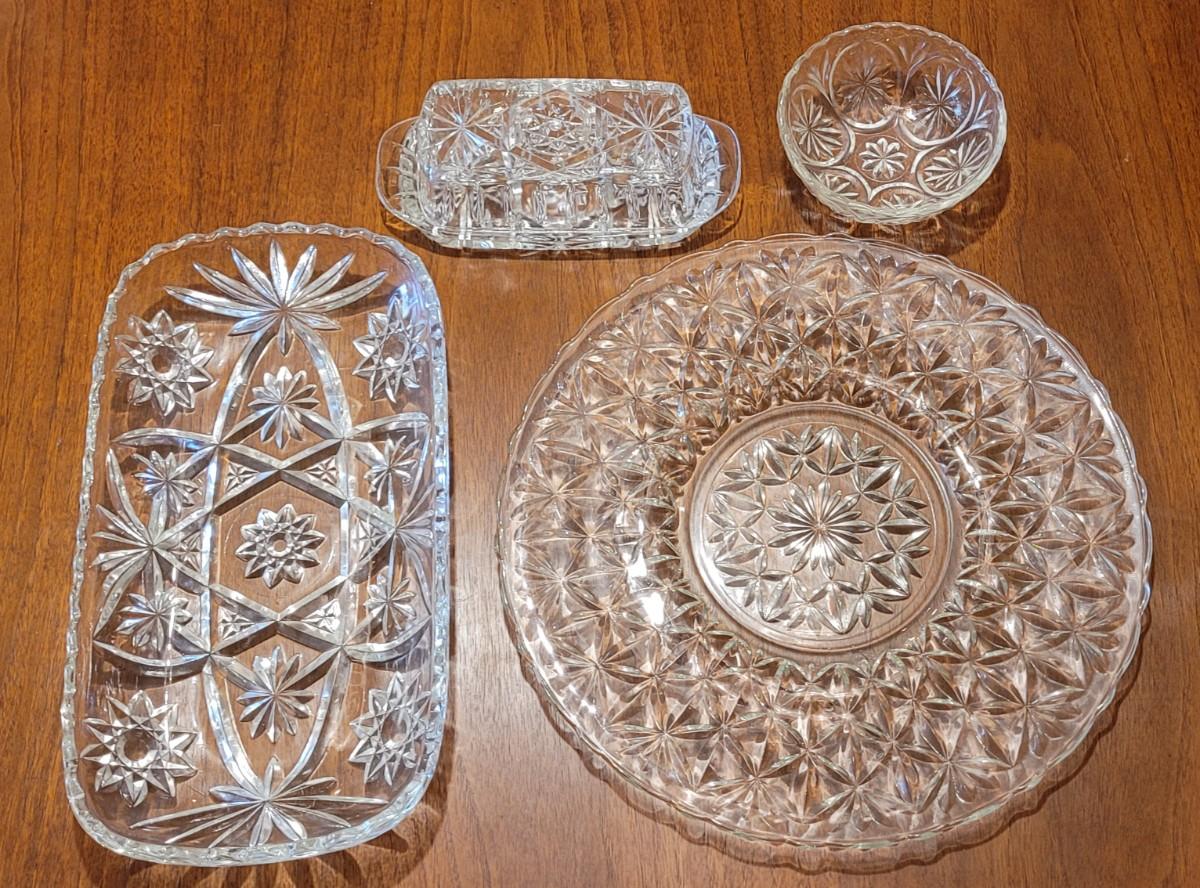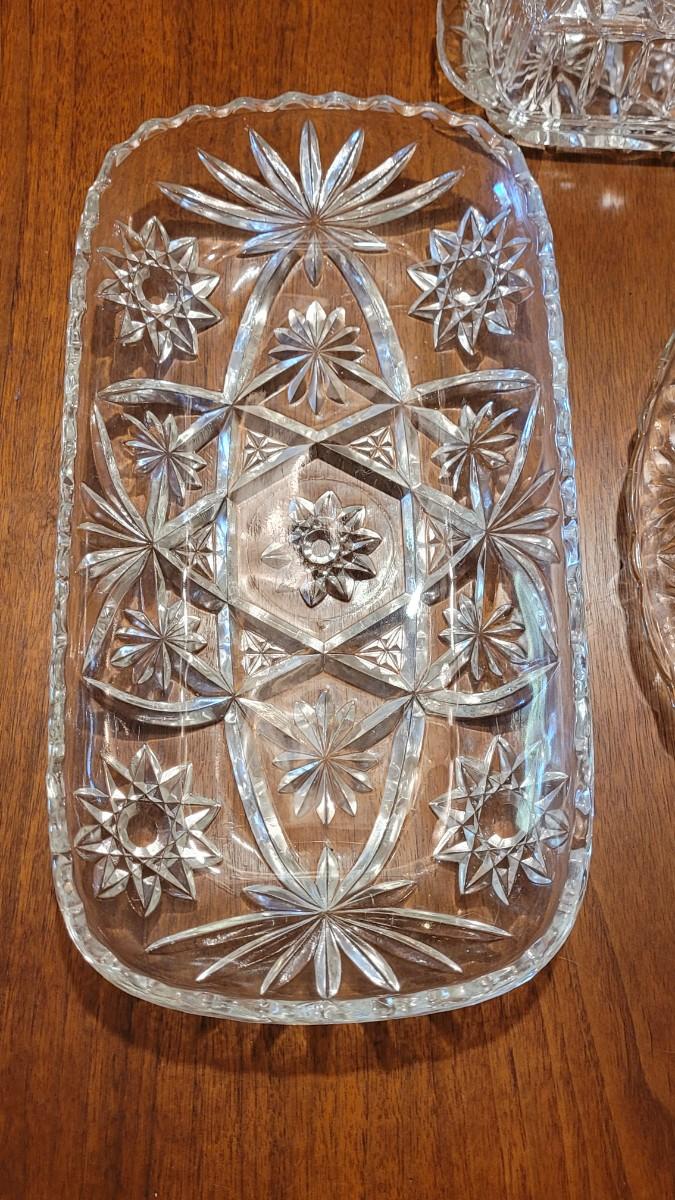 Lot 112: Butter Dish, Round & Rectangle Crystal Platters & Crystal Nut Bowl