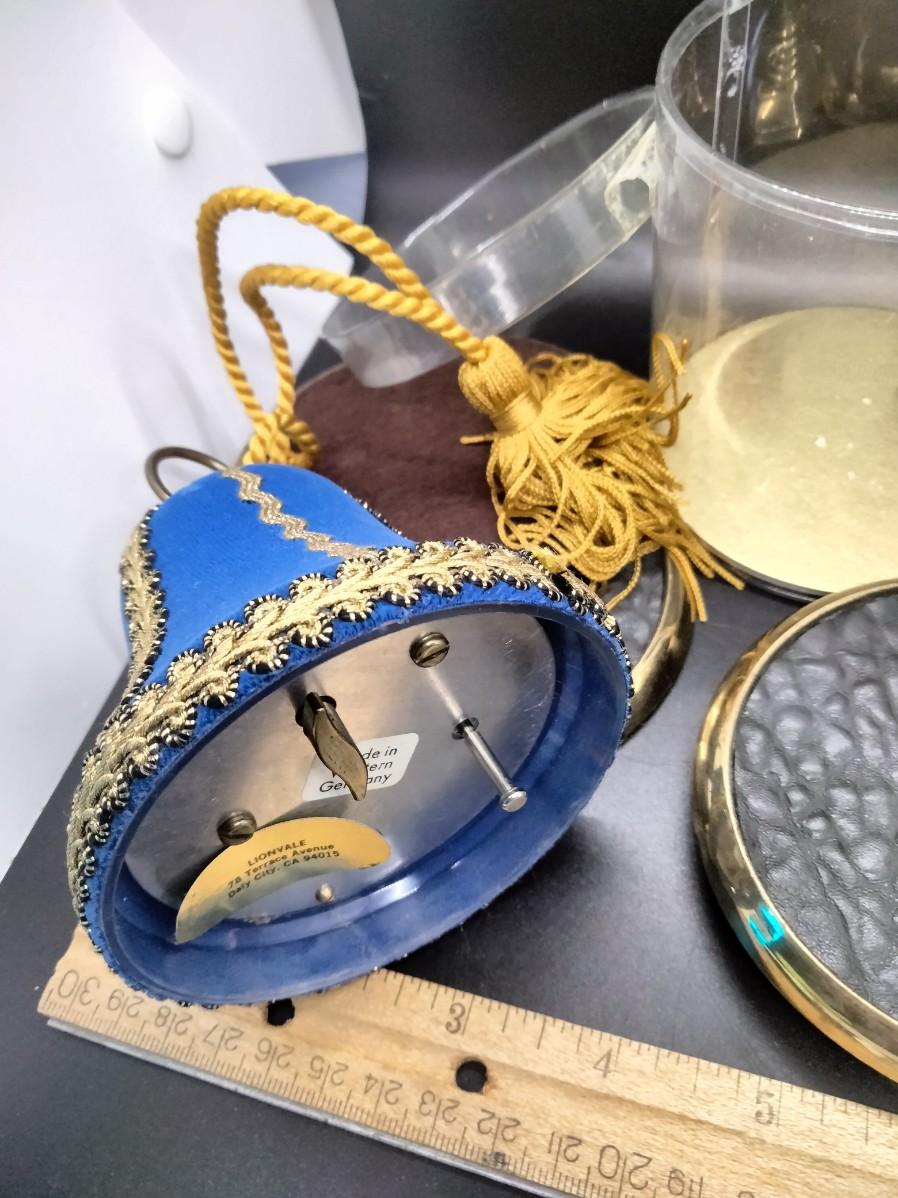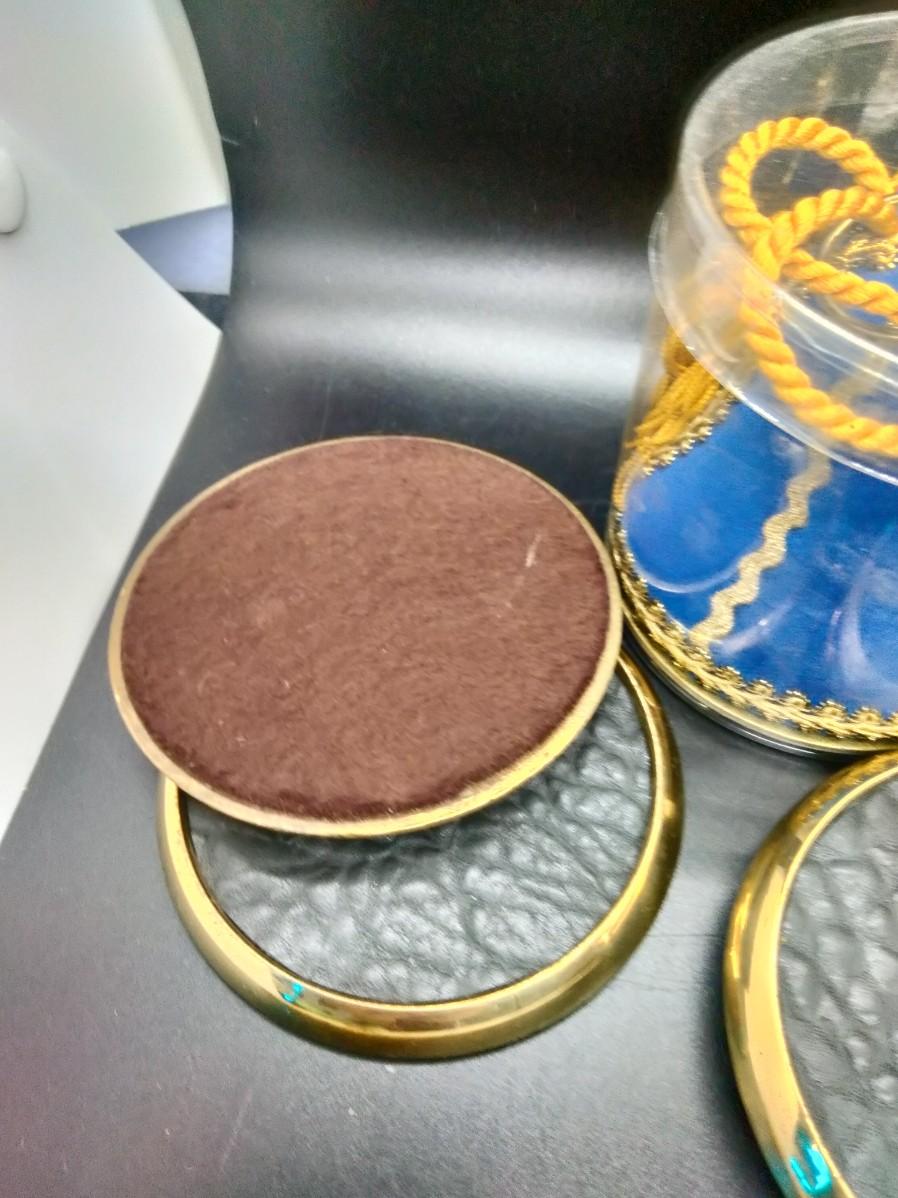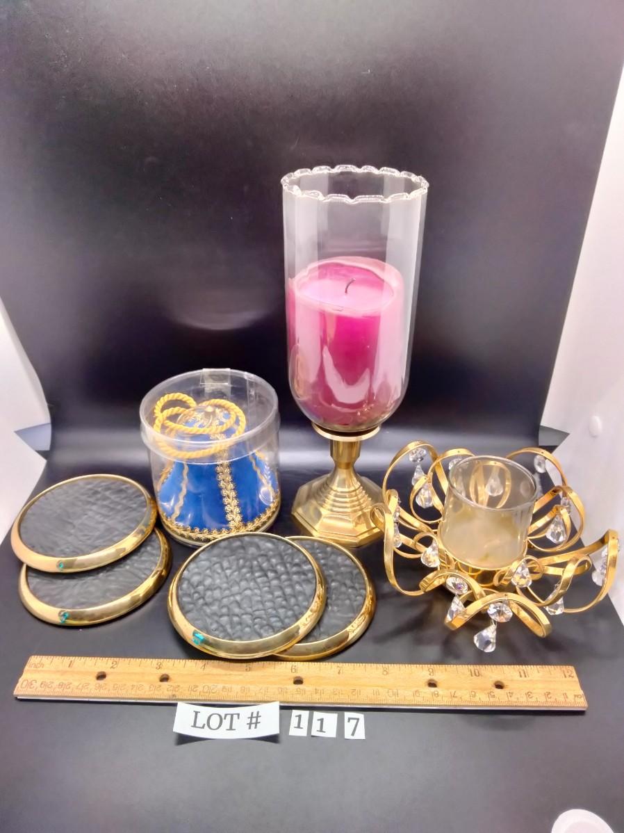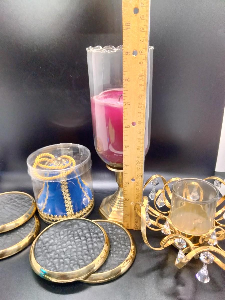 music bell, works. 4 Brass and faux leather coasters, brass and crystal candleholder, brass candleholder with glass sconce