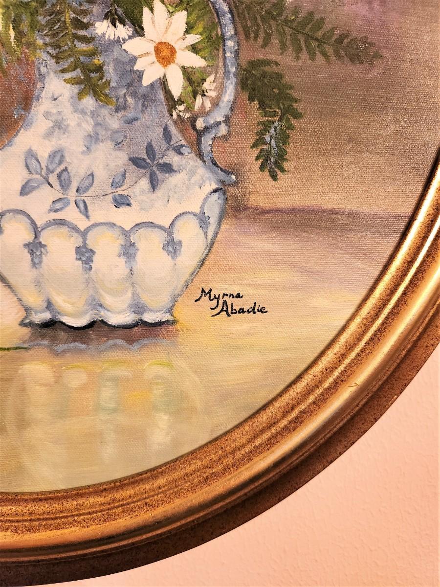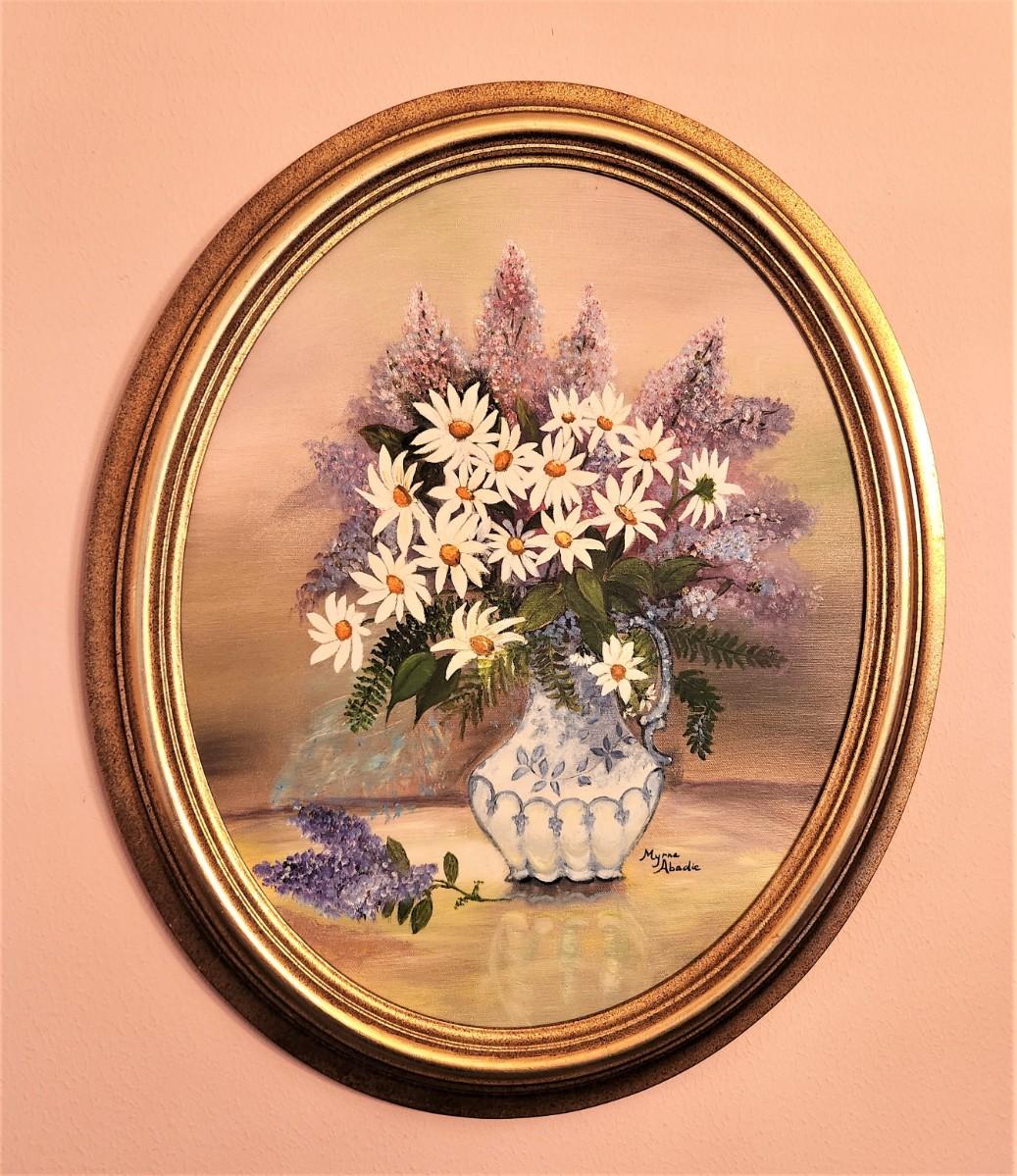 Signed "Myrna Abadie" - oval painting of wisteria and daisies - 23" x 19.5" - good condition.