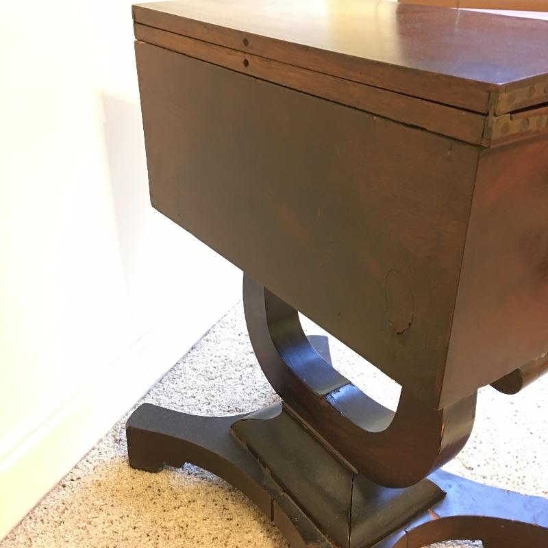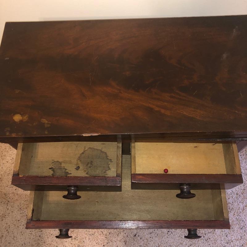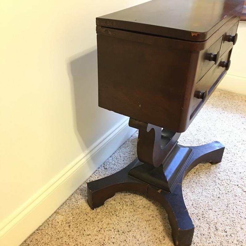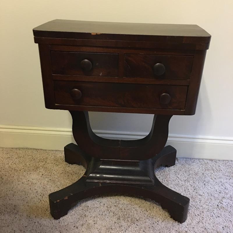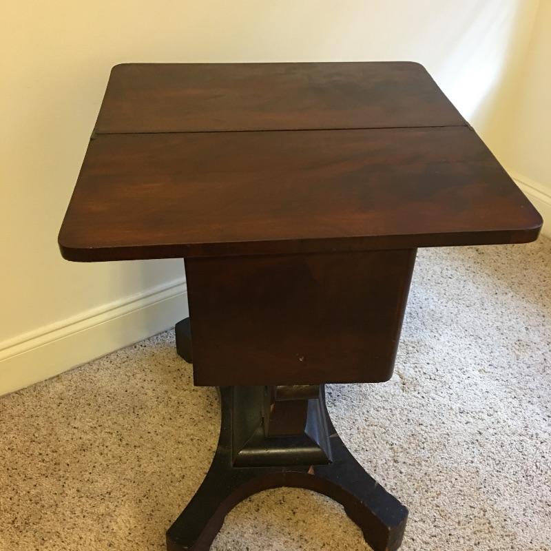 Antique side table. Table has three dovetailed drawers and a top that swivels and unfolds to double its size. Table measures 16” x 21” x 27.25”. Top extends from 10.75” x 21” out to 21.5” x 21” when opened.