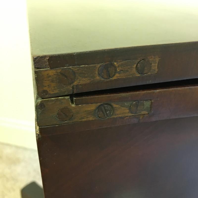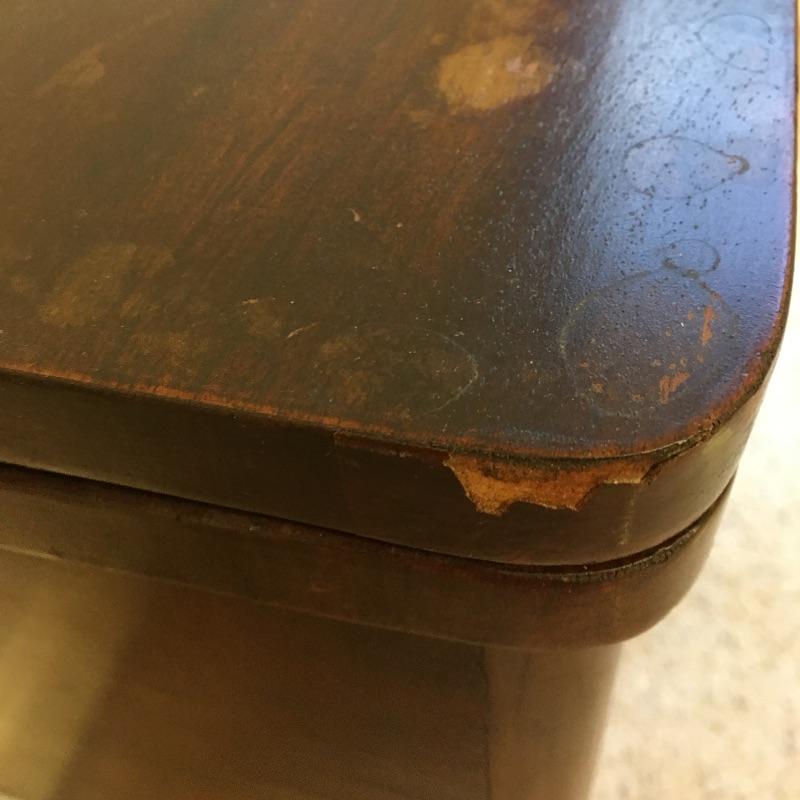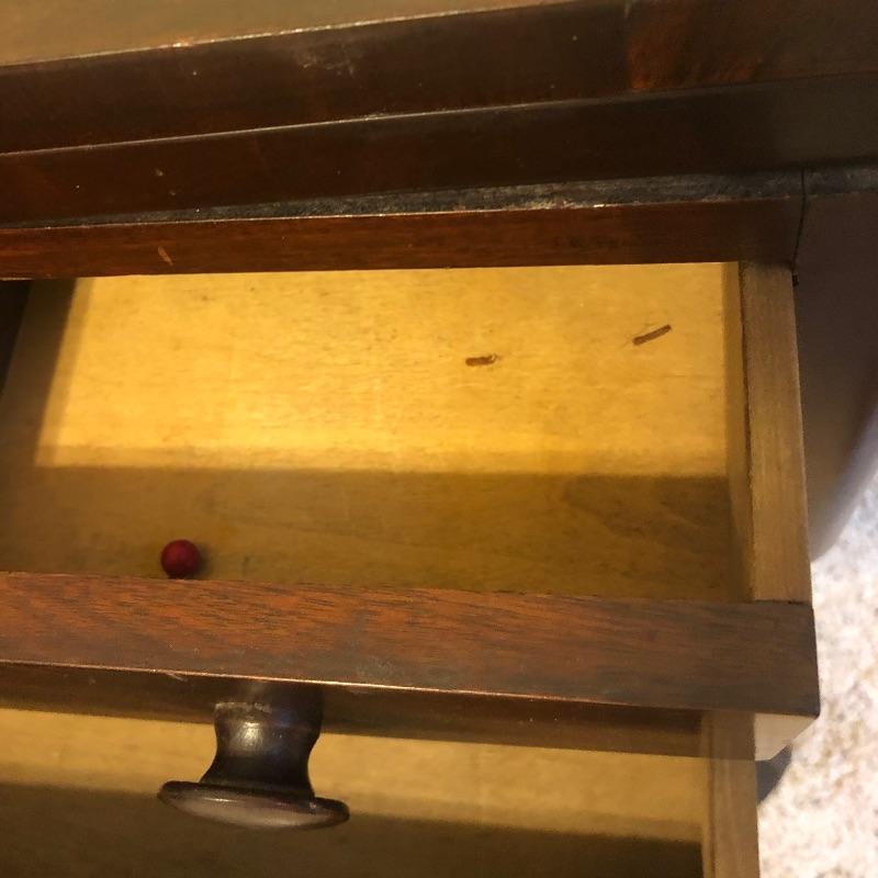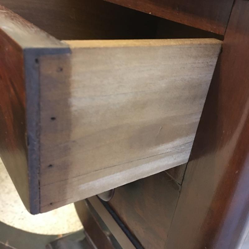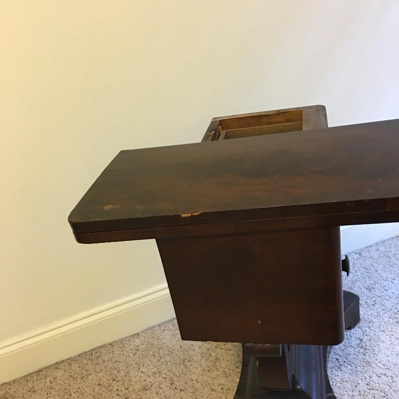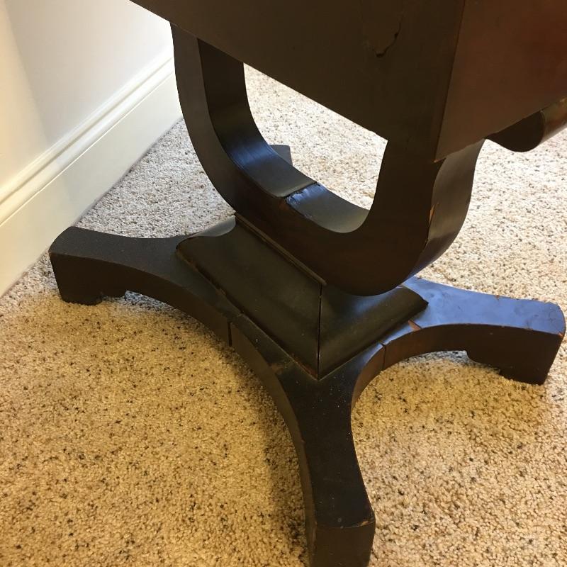Antique side table. Table has three dovetailed drawers and a top that swivels and unfolds to double its size. Table measures 16” x 21” x 27.25”. Top extends from 10.75” x 21” out to 21.5” x 21” when opened.