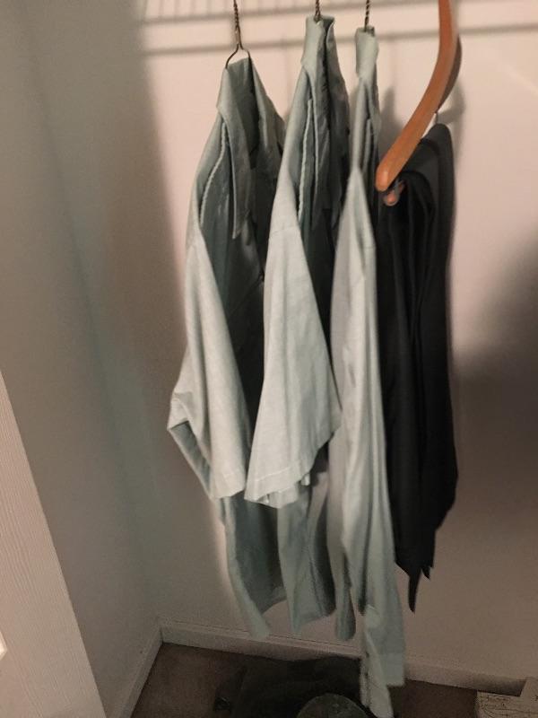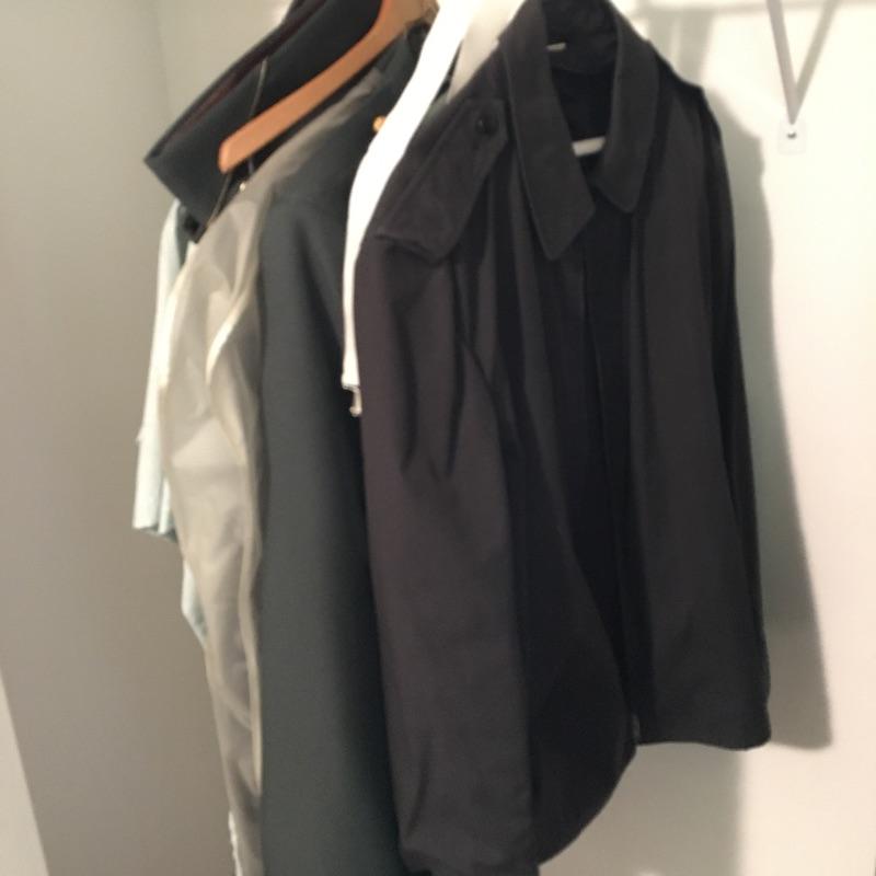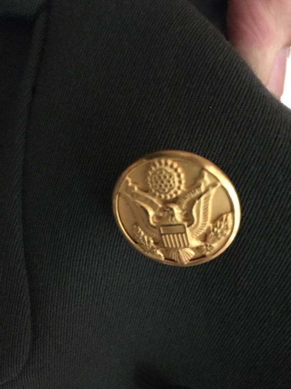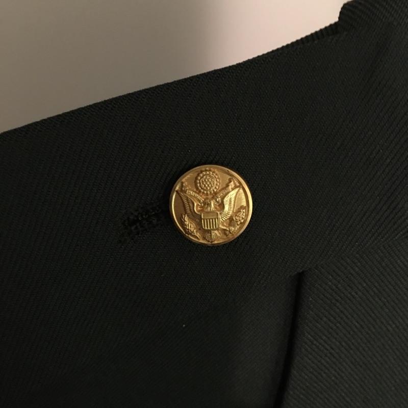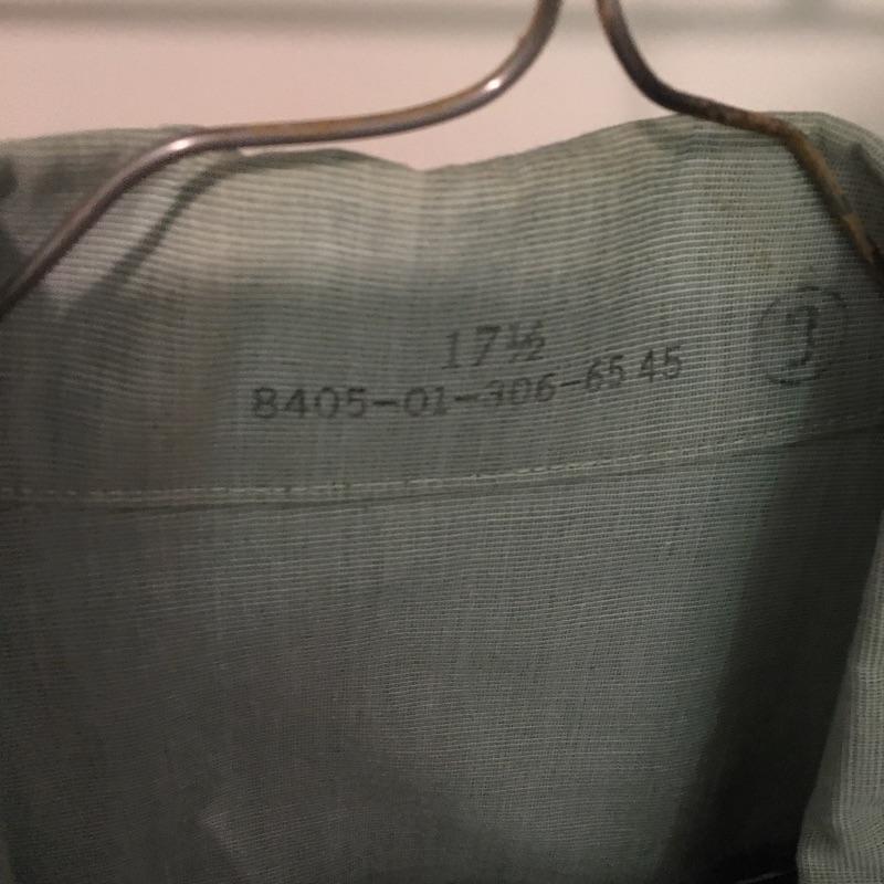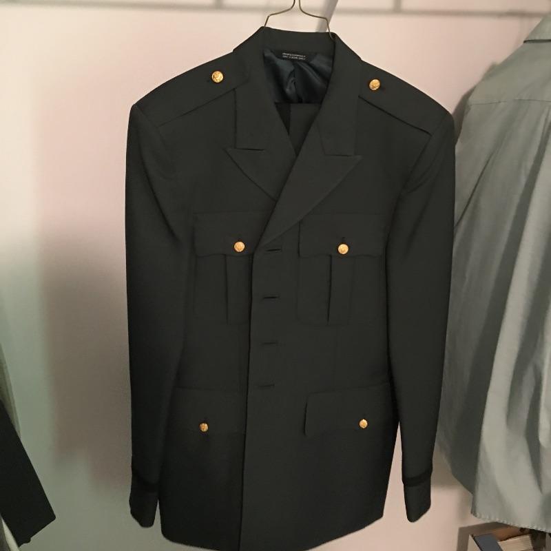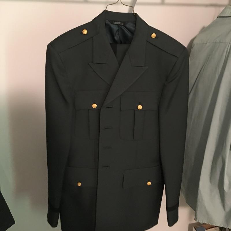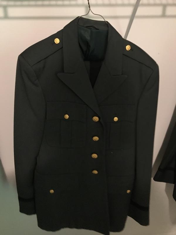 Army class A uniform. Lot includes two coats, five pairs of pants, three short sleeved shirts one long sleeved shirt, two hats size 7.25 and a water repellant jacket. Shirts are marked 17-17.5, the rest are not marked.