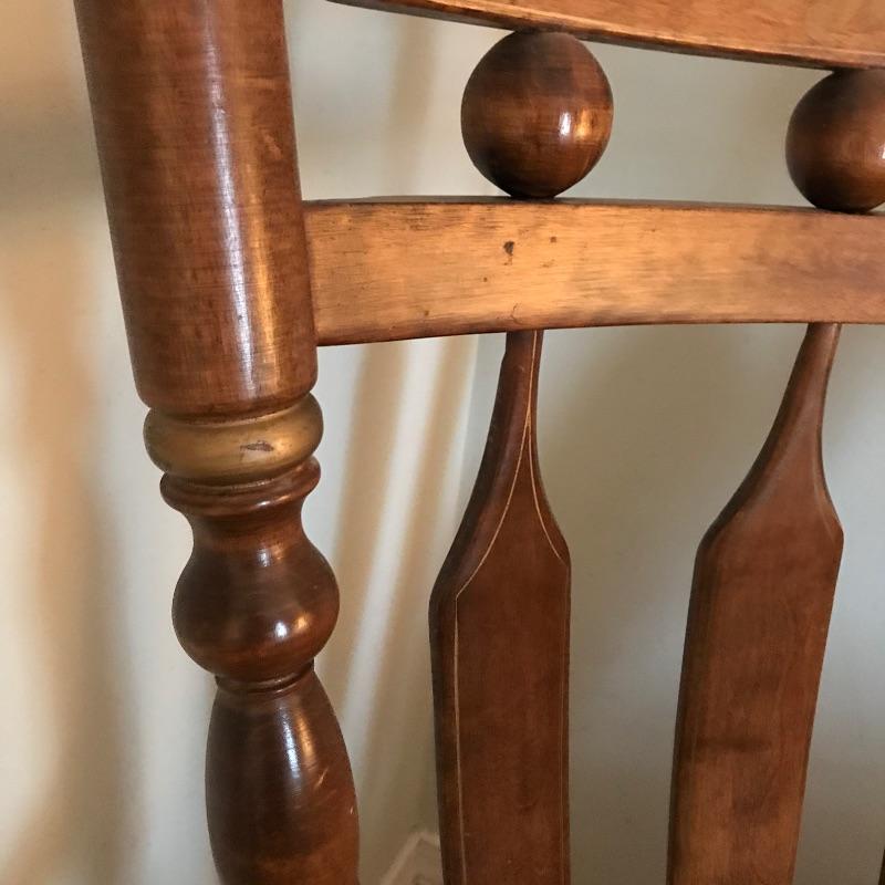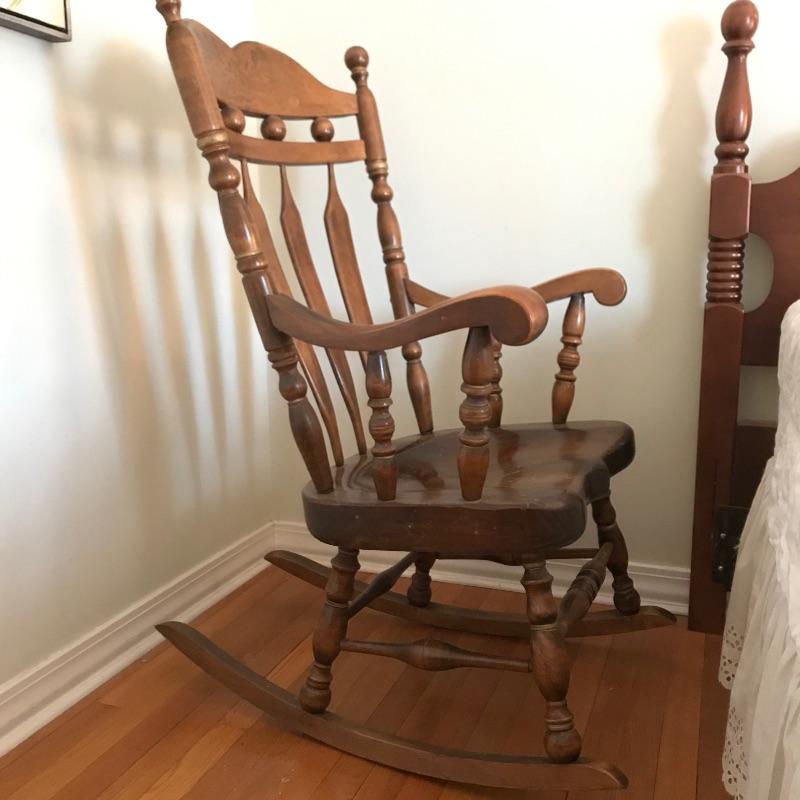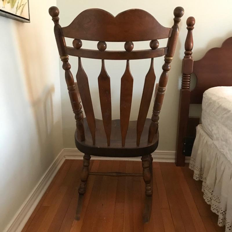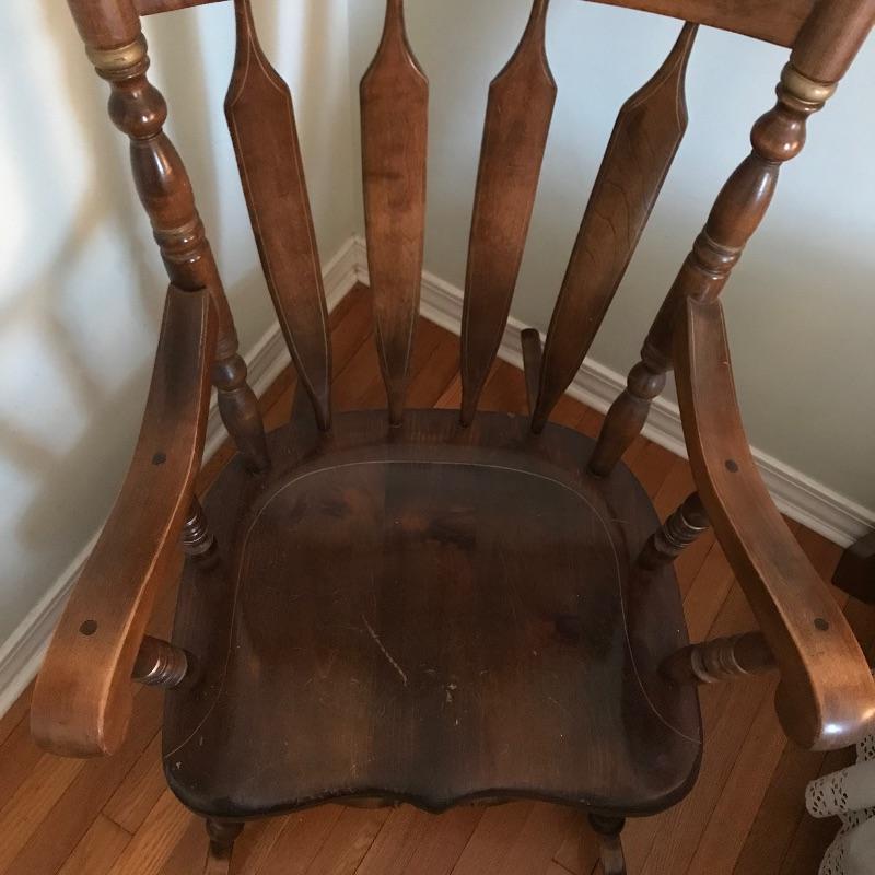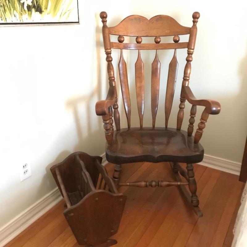Large framed wooden rocking chair with handsome features. Painted gold accents on the back slats and sides, see photos. Some wear is noticeable, piece looks amazing for its age. Screws are found joining the legs to the seat. Piece measures approximately 22.5” x 35” x 44.5”. We’ve paired this sizable chair with a solid wood magazine rack. Rack is also of substantial weight for its size and appears to be quality made and measures approximately 16” x 13” x 15” See photos. No shipping.