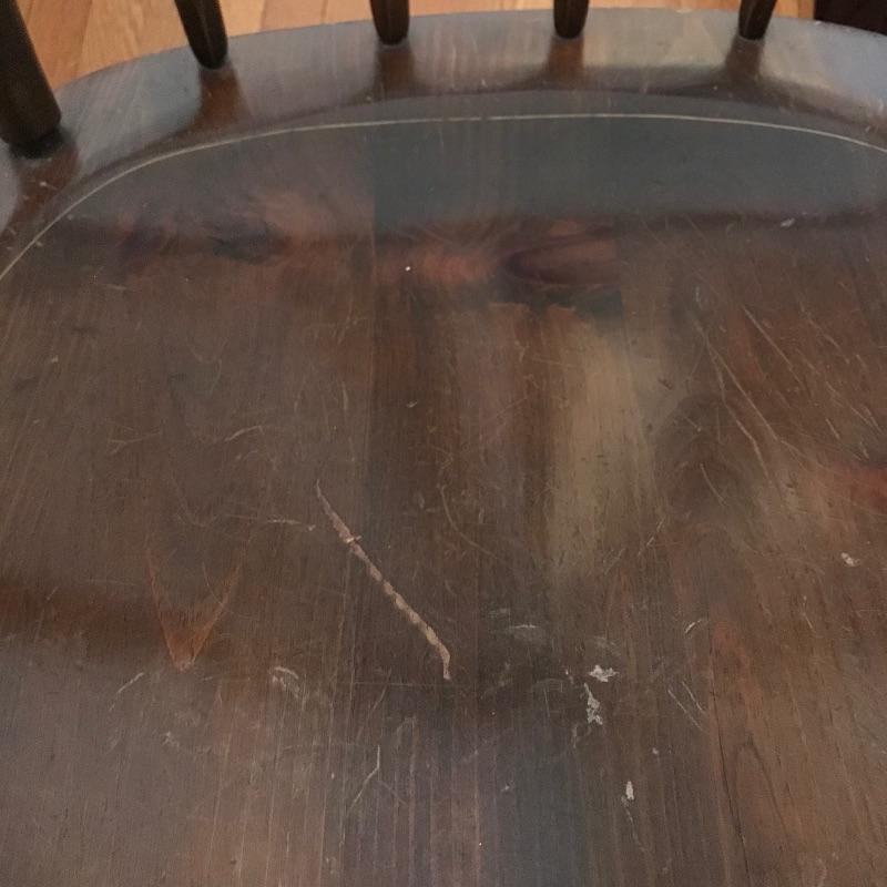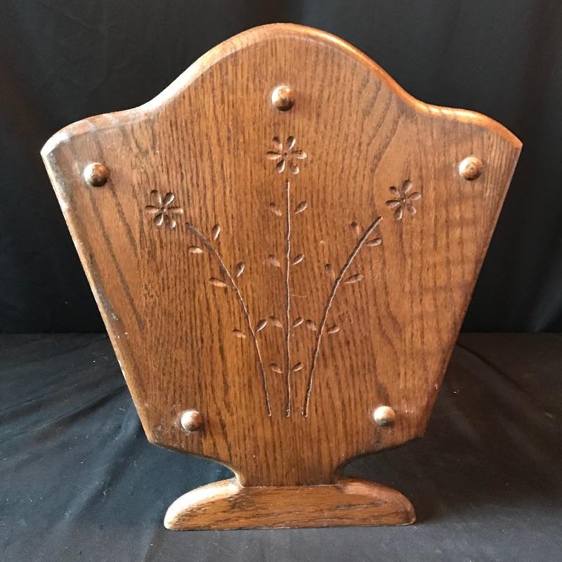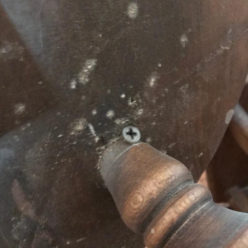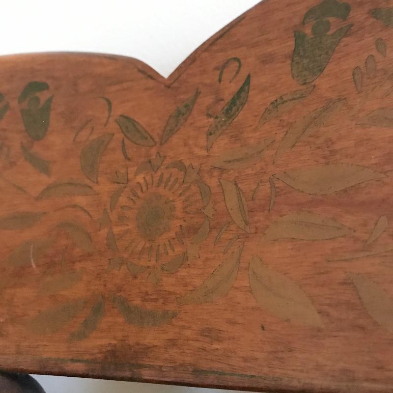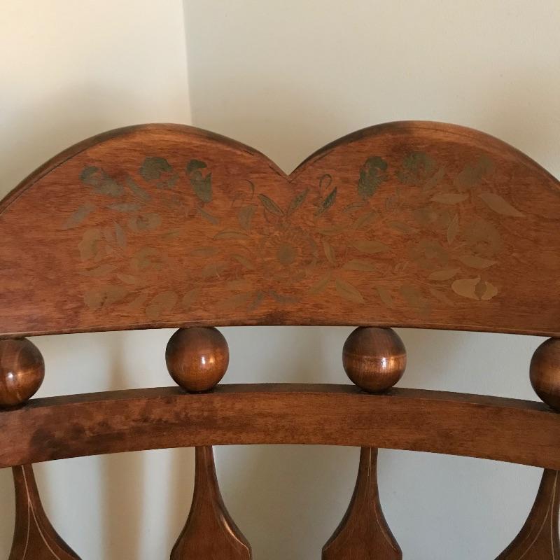 Large framed wooden rocking chair with handsome features. Painted gold accents on the back slats and sides, see photos. Some wear is noticeable, piece looks amazing for its age. Screws are found joining the legs to the seat. Piece measures approximately 22.5” x 35” x 44.5”. We’ve paired this sizable chair with a solid wood magazine rack. Rack is also of substantial weight for its size and appears to be quality made and measures approximately 16” x 13” x 15” See photos. No shipping.