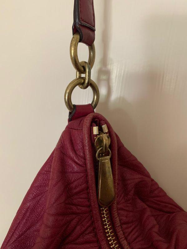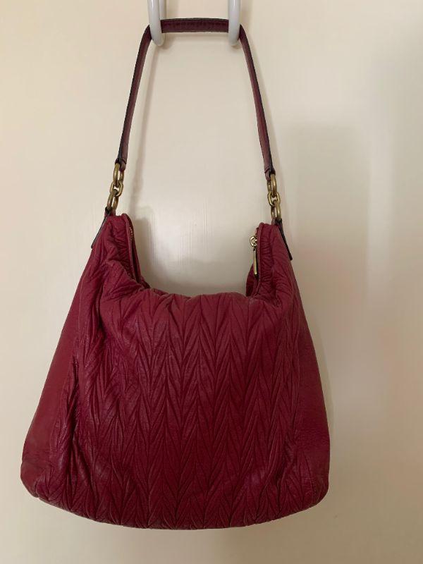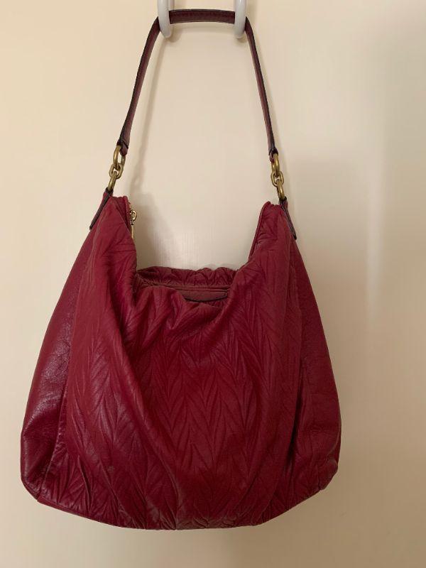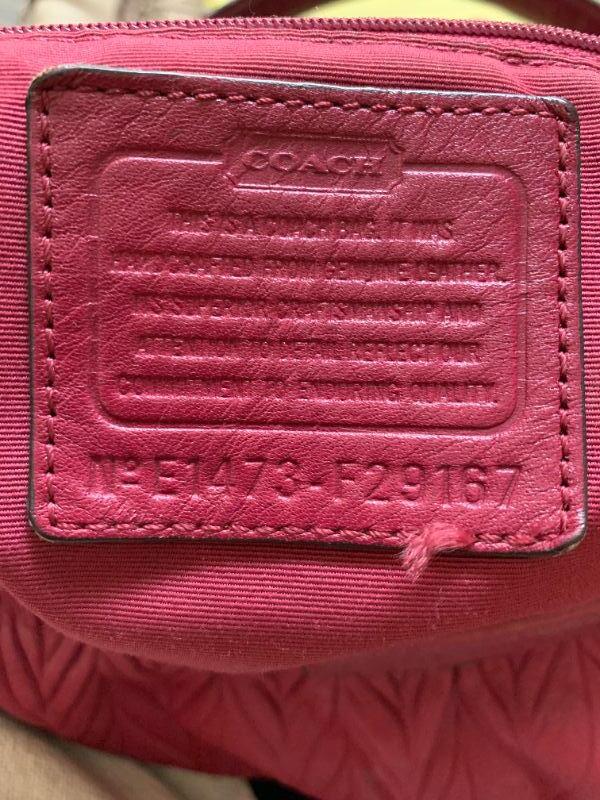 Raspberry leather gathered hobo bag by Coach zip top closure, multifunctional pockets fabric lining. 12 3/8" x 12 5/8" Short shoulder strap
