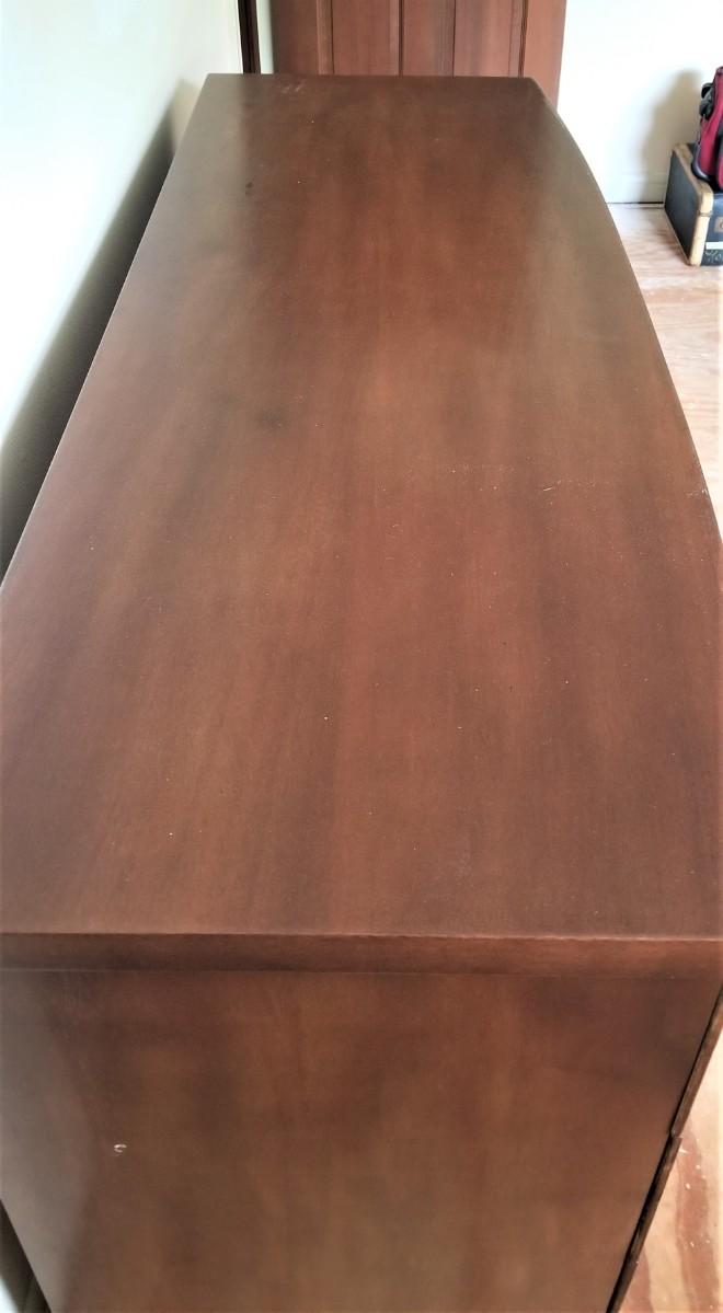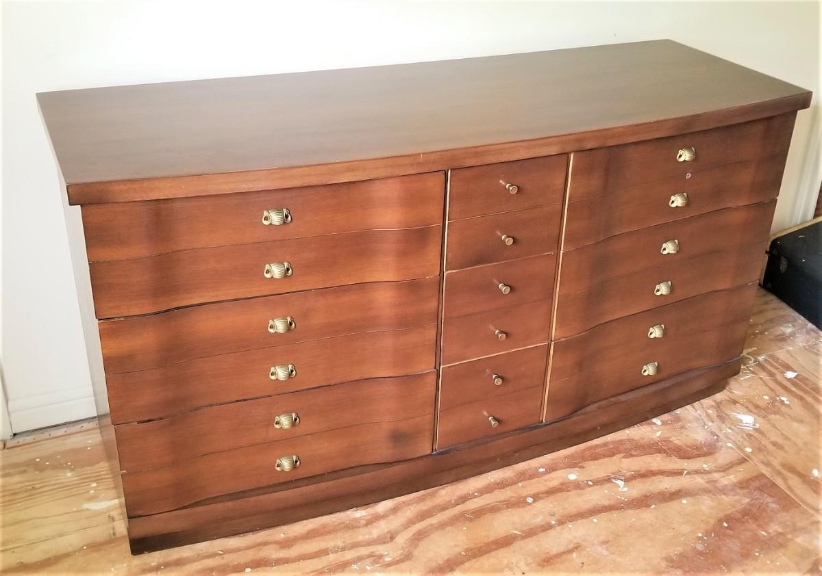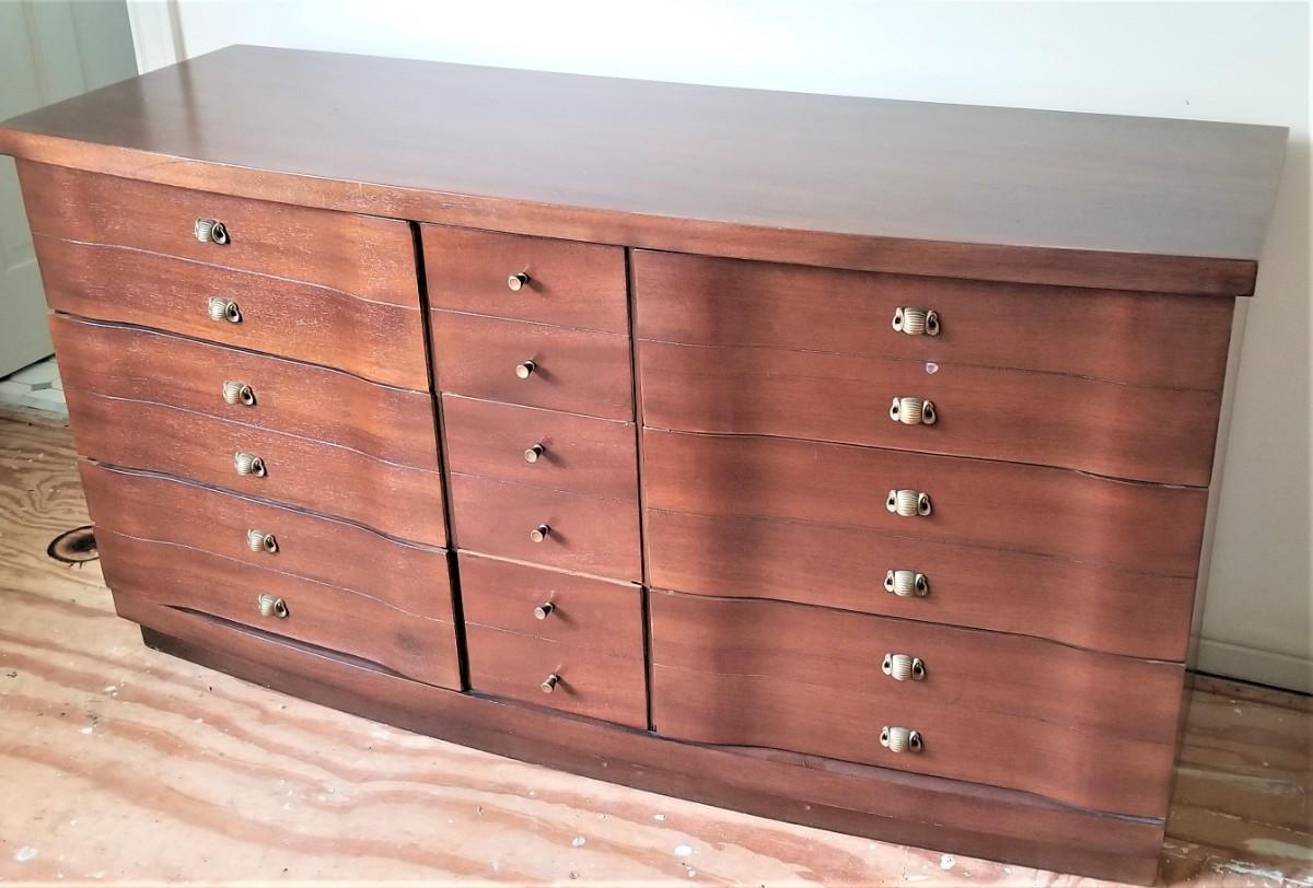 Contemporary dresser with Mid-Century lines - 9 drawers (lots of storage) - 32" tall, 20" deep, 60 " across. Has been used, some minor dings, etc, but nothing major. Still good looking. Anyone who purchases this item needs to be prepared to move and load it themselves.