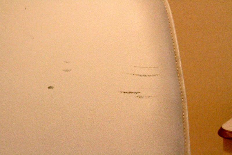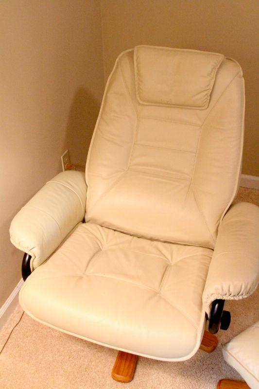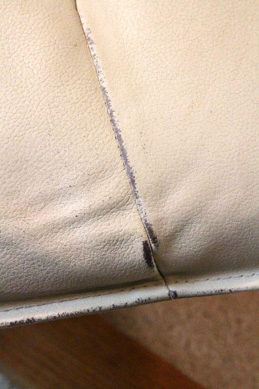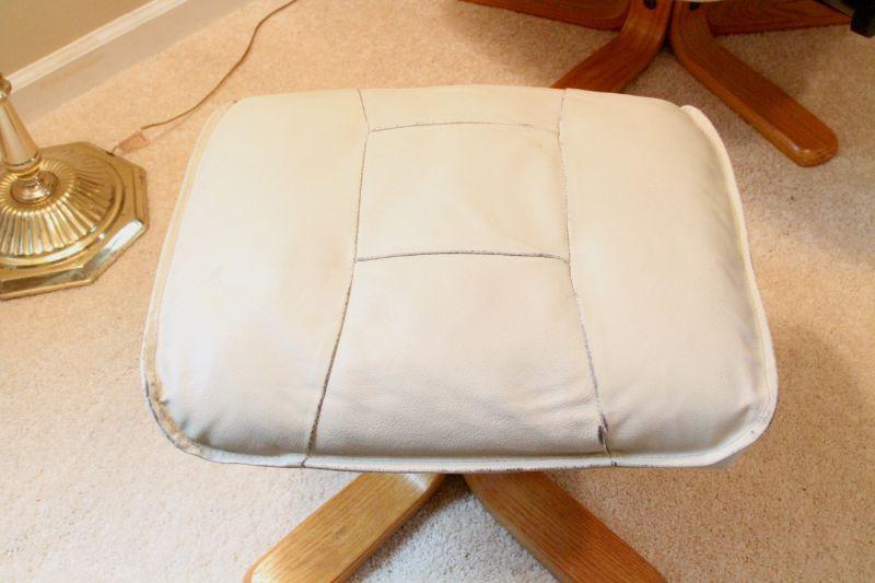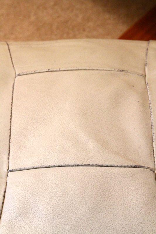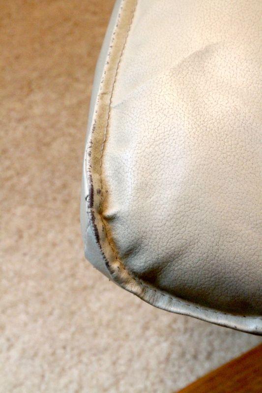 There are some worn seams and slight color variations in the leather due to age and use, especially on ottoman. Padded bonded leather cover. Overall looks sharp.