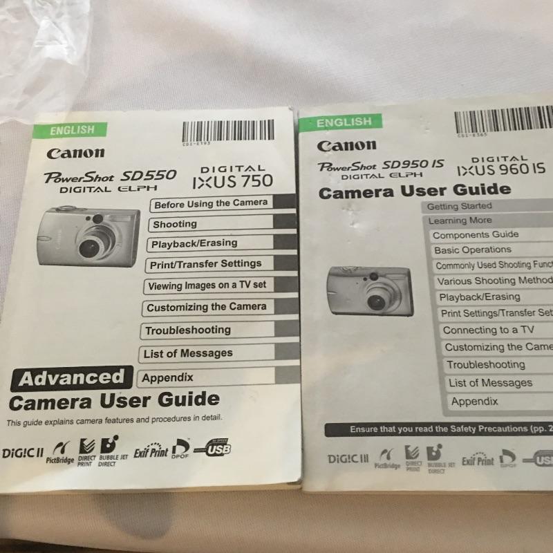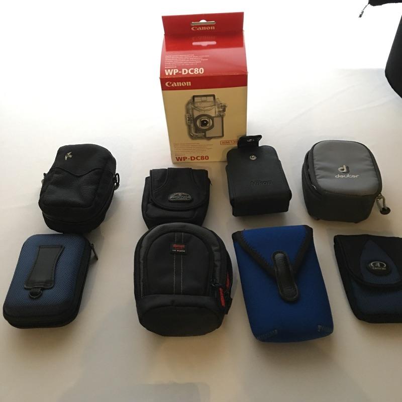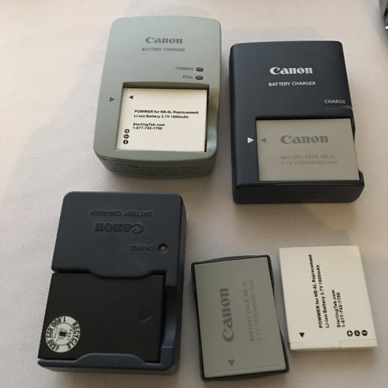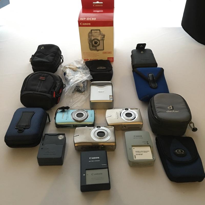 Digital camera collection. Lot includes four digital cameras with extra cases, waterproof case, chargers and batteries. Models include Canon Powershot SD550, SD980IS,SD950IS and a Nikon Nuvis S. The three Canon cameras all powered on and the Nikon was not tested as the battery is dead. It takes a 3v battery. A great gift for your kids.