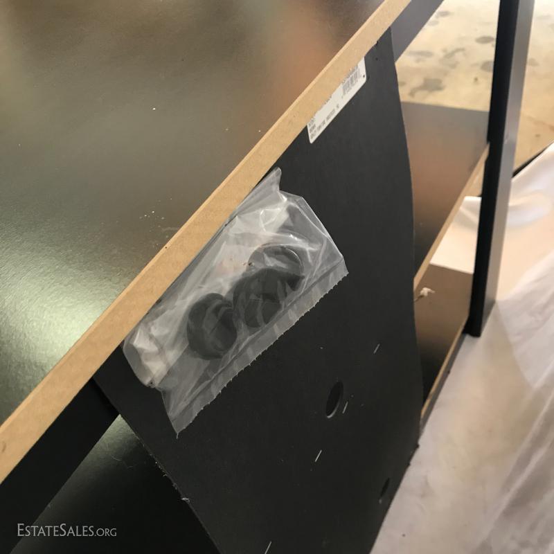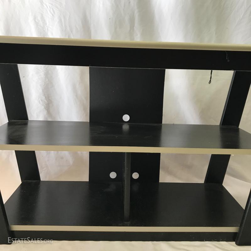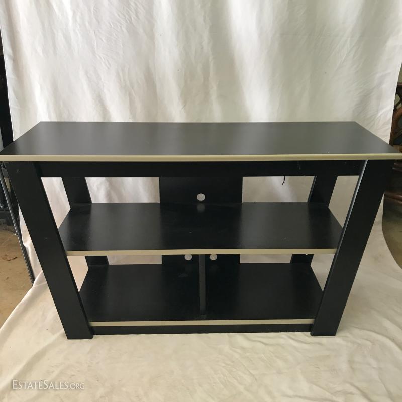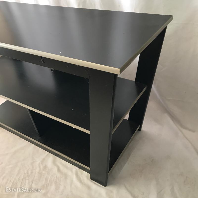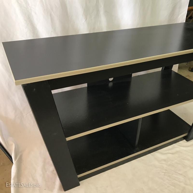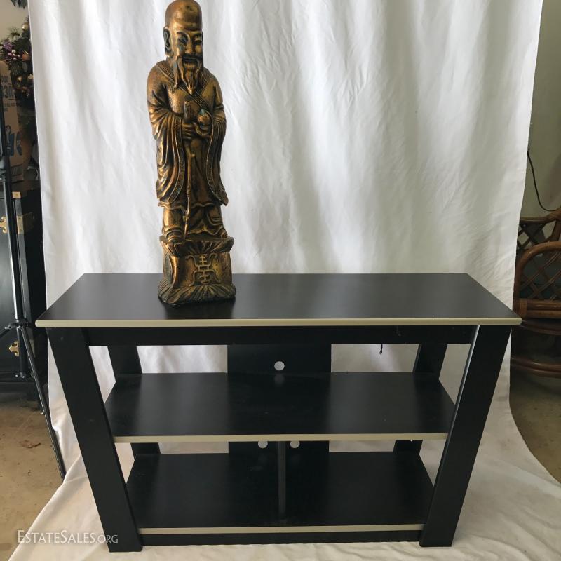 Black entertainment shelf with holes for media equipment. Angled top. Pressed wood. Purchased from Ashley Furniture. Measures 42"l x 15"w x 24"h. Also includes gold wooden statue, 25.5"h.