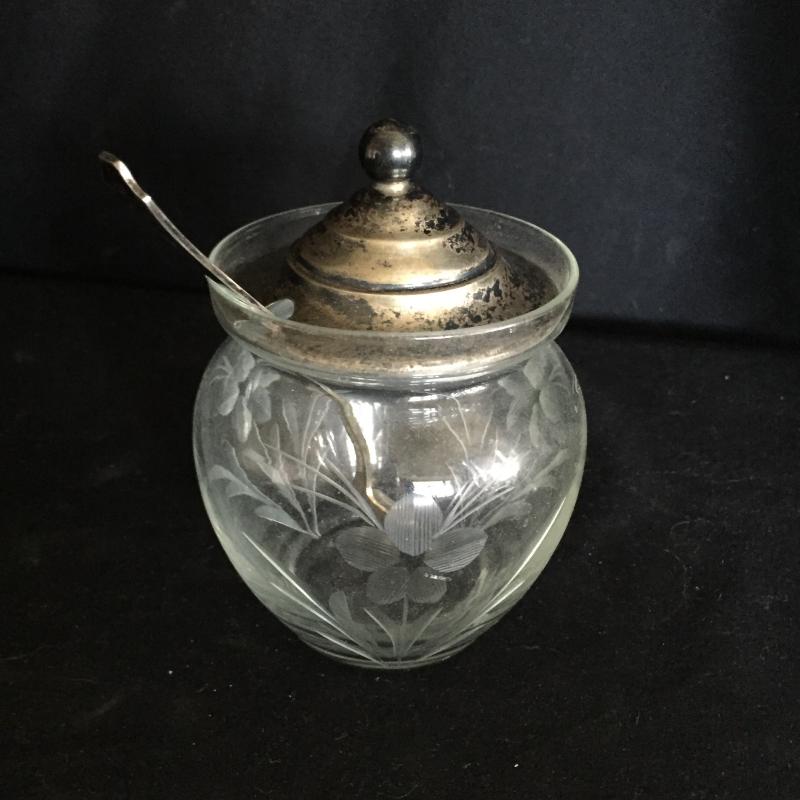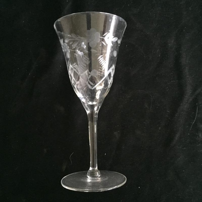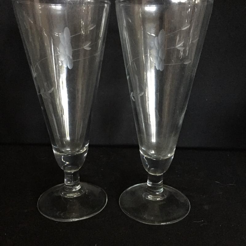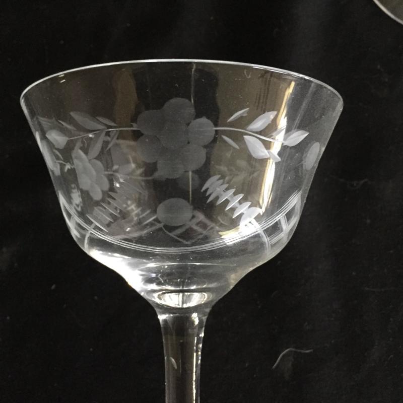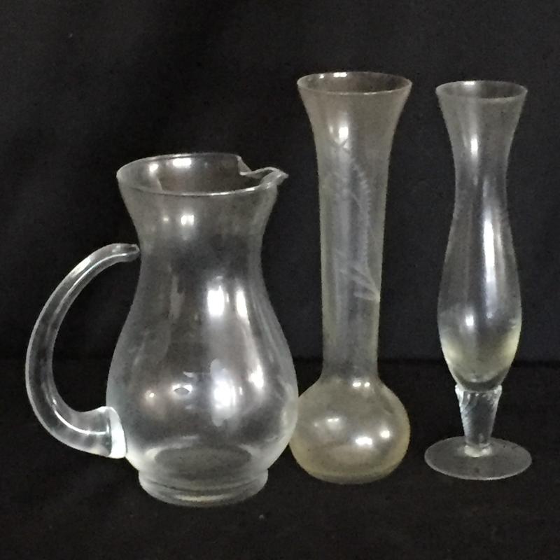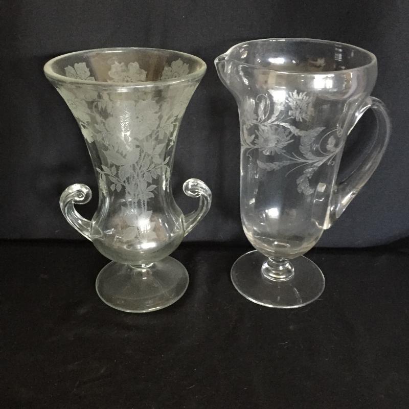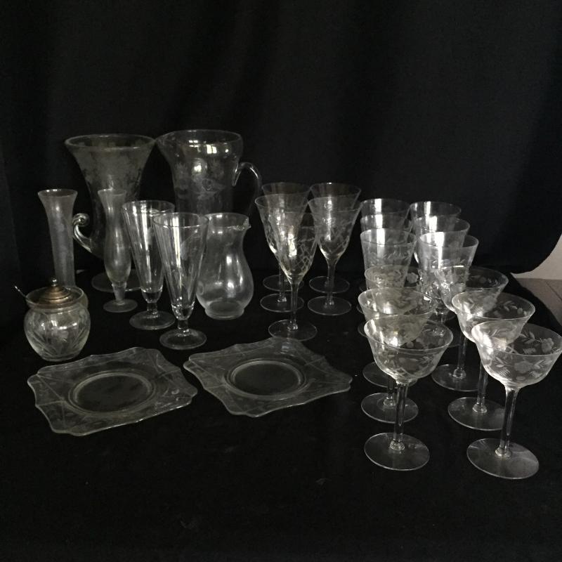 Dazzling Collection of Etched Glassware. Three sets of glasses with same pattern,Sugar Bowl With Sterling Top and Spoon,Pitcher and More. Pitcher Measures 10.75” Tall.