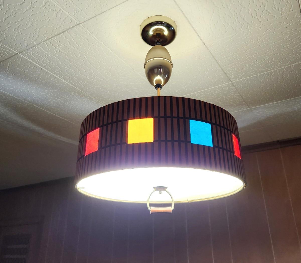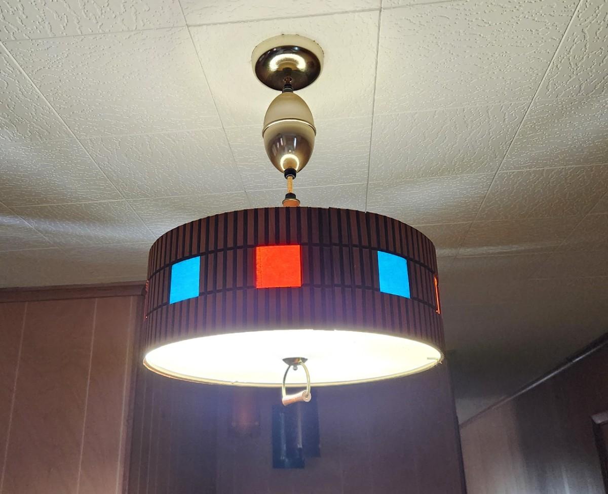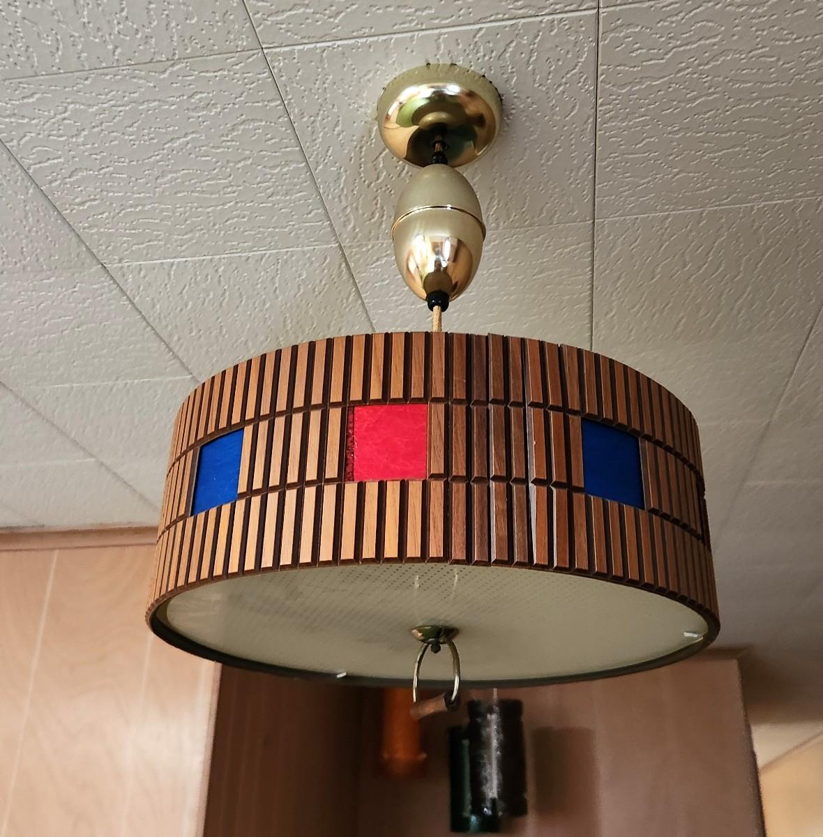 This MCM light fixture is original to the home and in good working condition. Made in the 1960's by Brice Industries of Philadelphia - first to do the "color window." Slatted walnut construction, frosted glass diffuser at the bottom - colors are orange, blue, yellow, red. 16.5" wide, hangs 21" from ceiling. You'll probably never see another one.