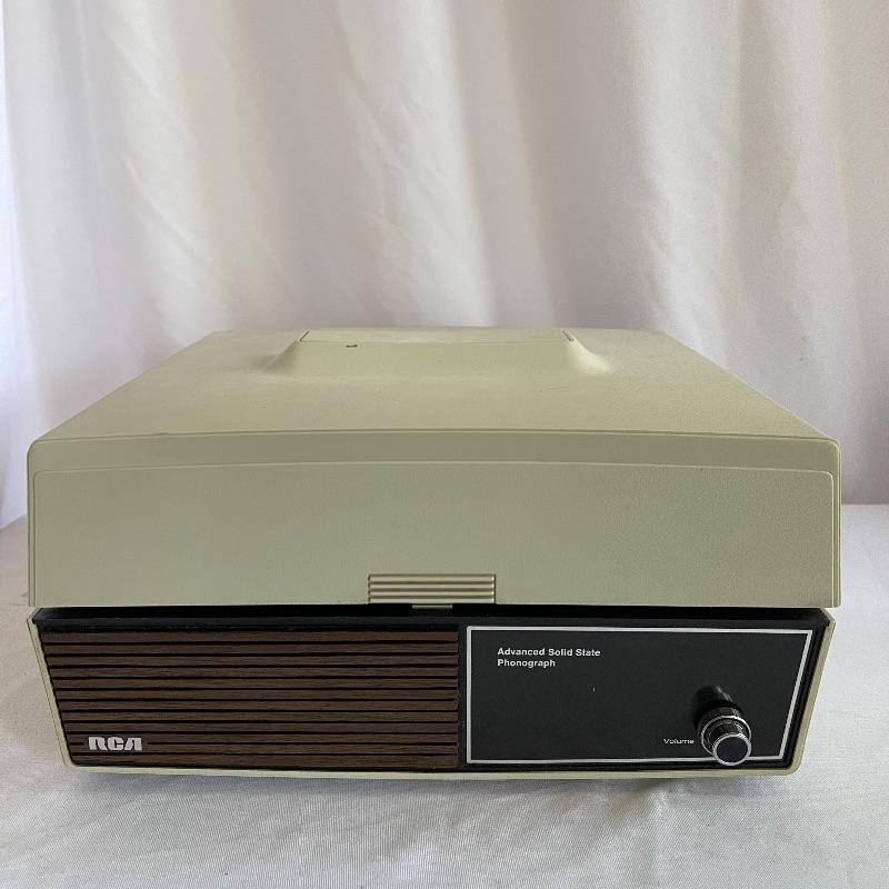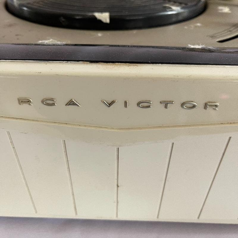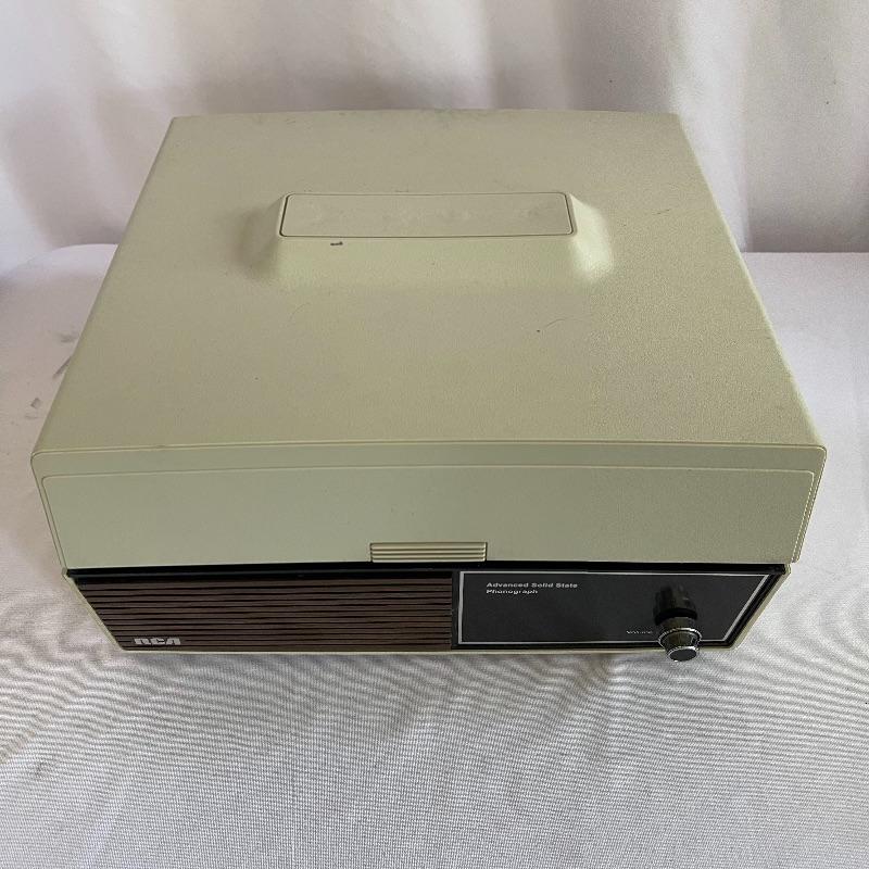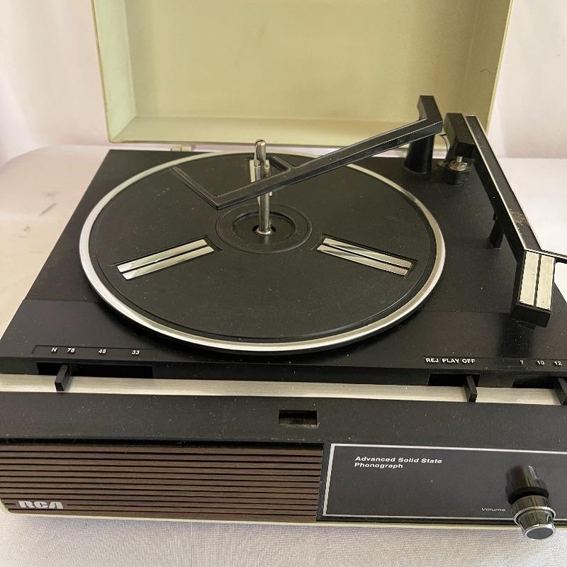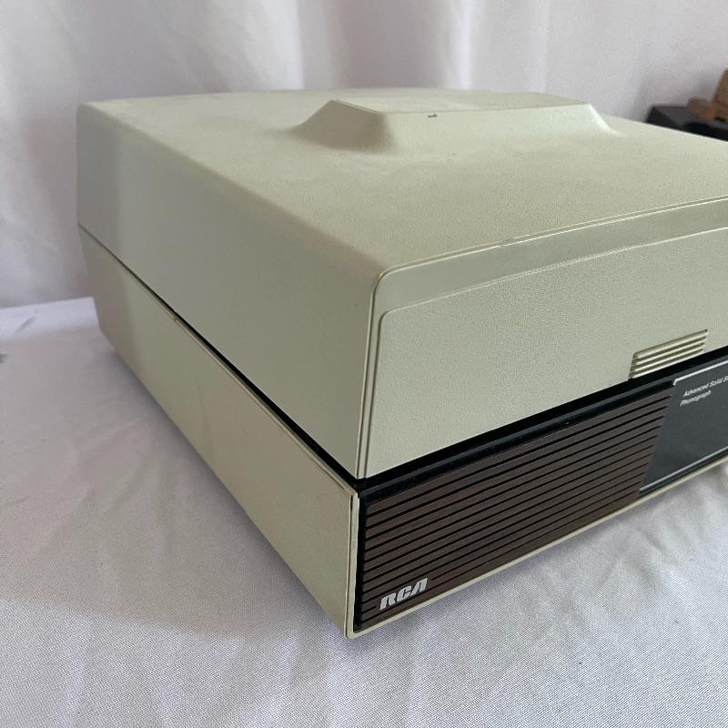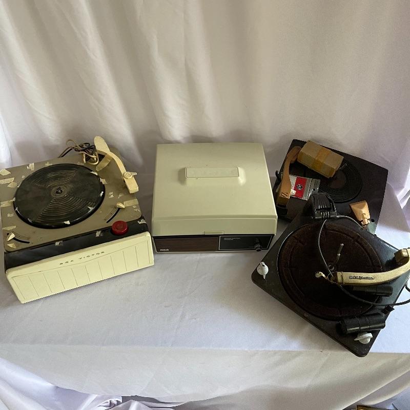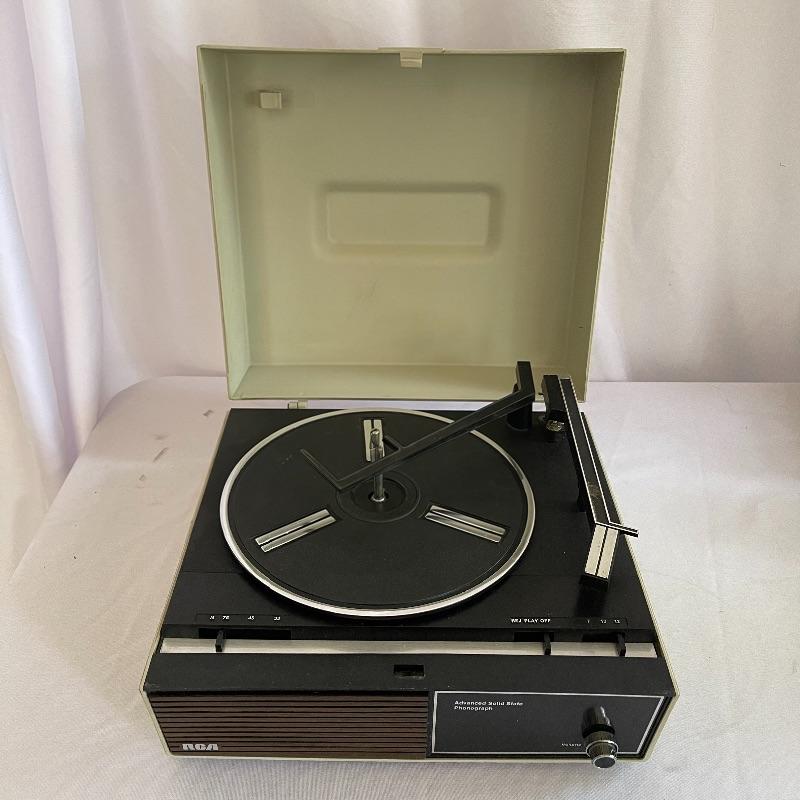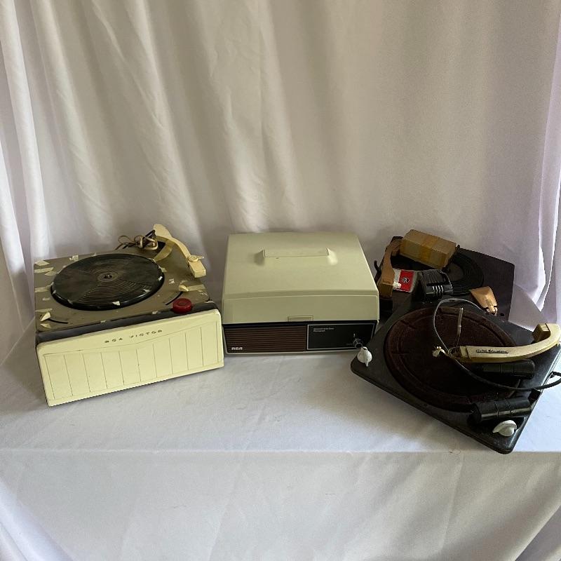 Four various RCA turntables. The first is an RCA Victor with model number 9-JD-1DE and did not power on. The second, an advanced solid state phonograph with model year of 1974 and model number of 31624831 and powered on when tested. The third is a victor with the numbers 960282-1, S274, and 021 on the underside. The last turntable is also a victor with hard to read numbers stamped on the underside. The last two were not tested.