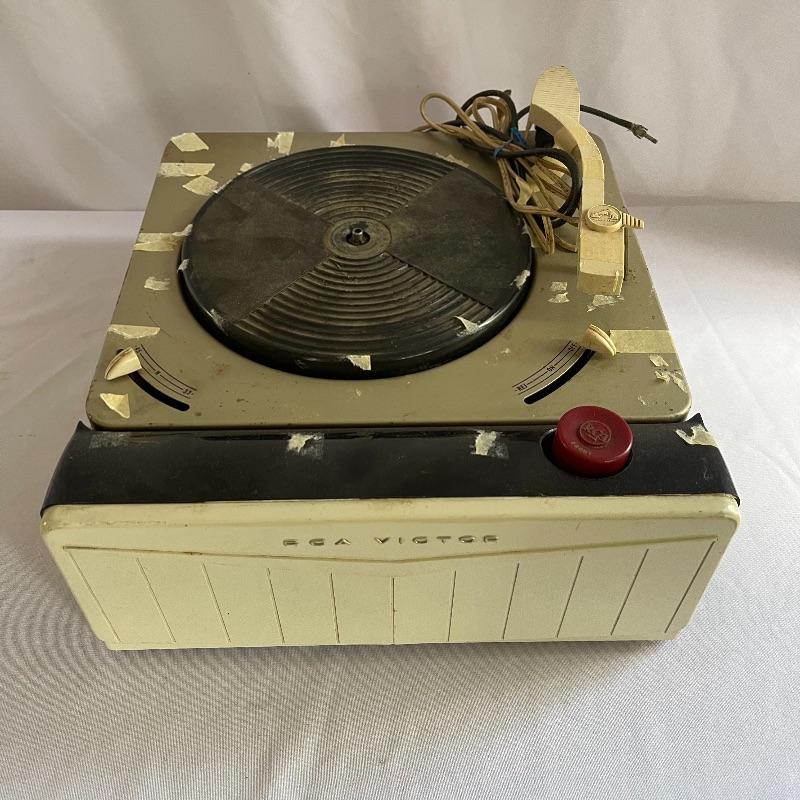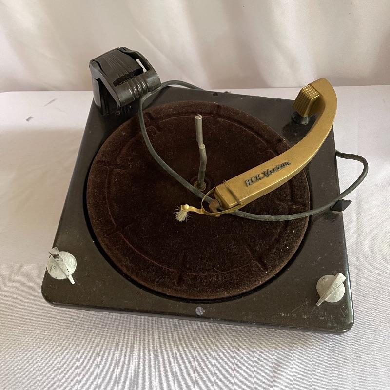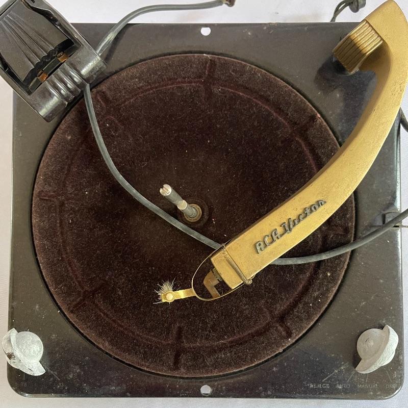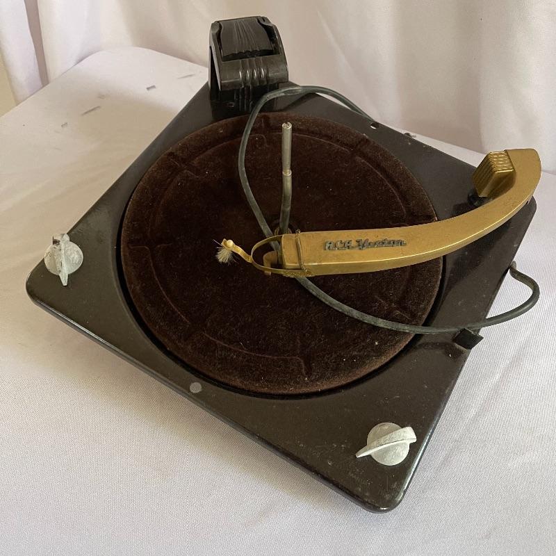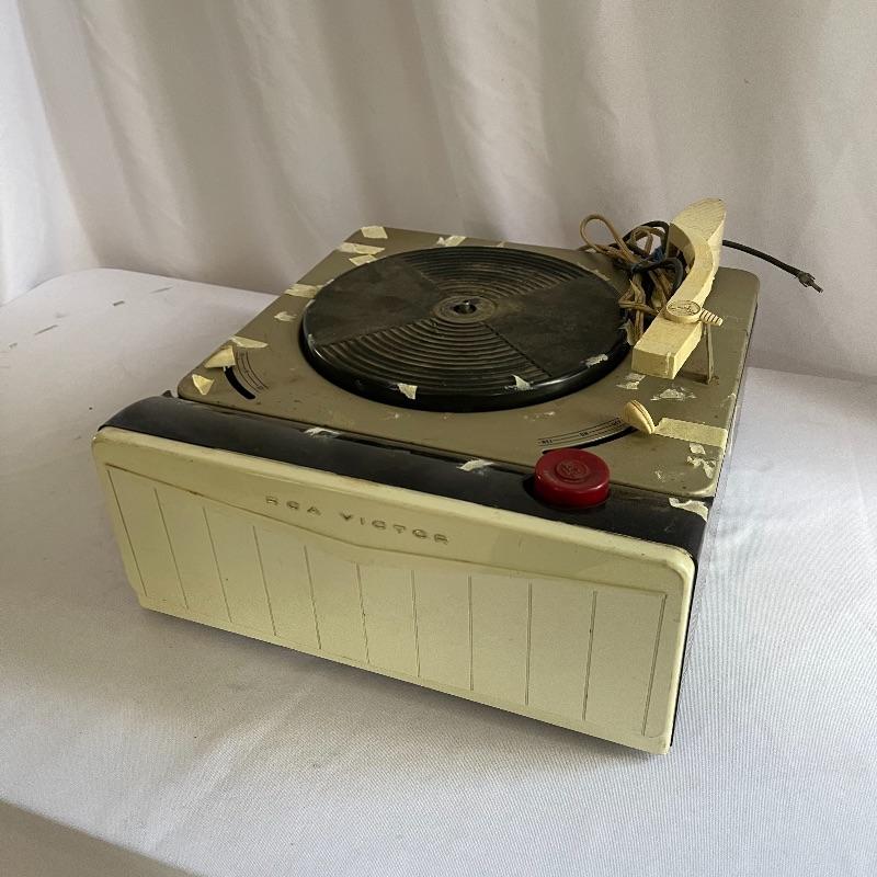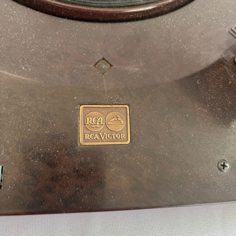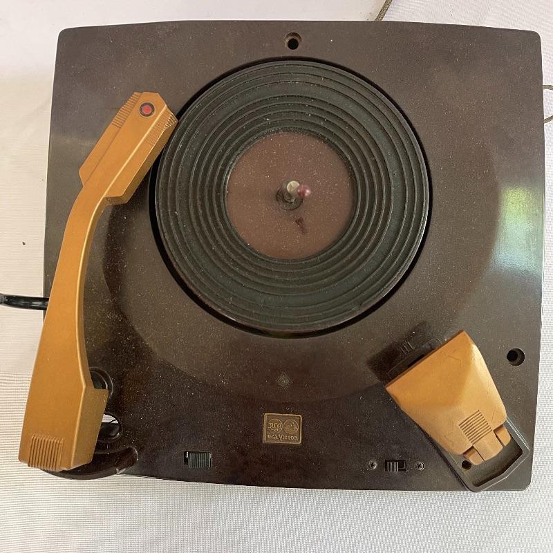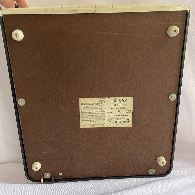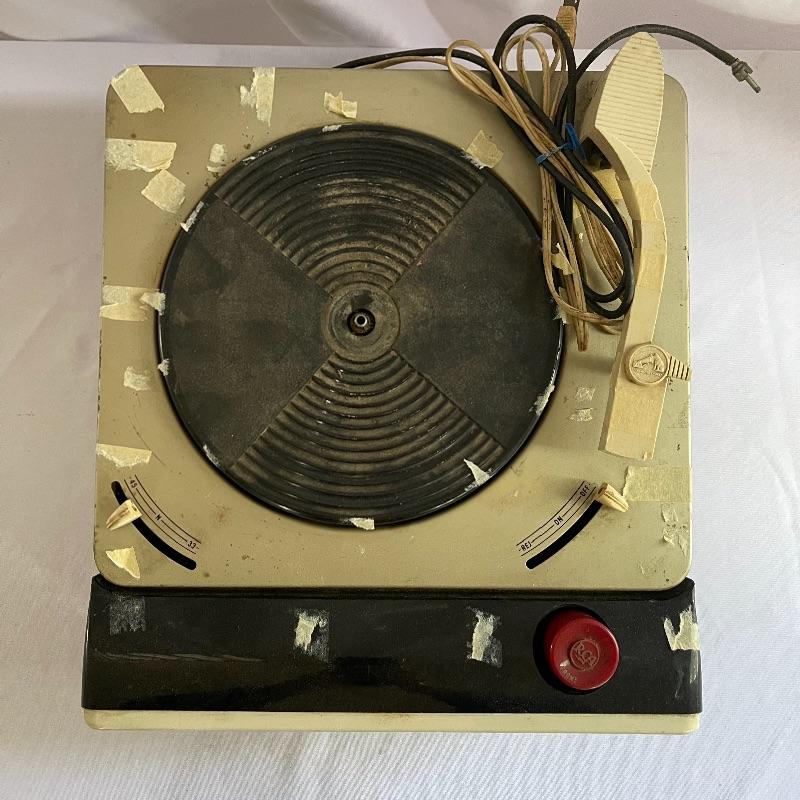 Four various RCA turntables. The first is an RCA Victor with model number 9-JD-1DE and did not power on. The second, an advanced solid state phonograph with model year of 1974 and model number of 31624831 and powered on when tested. The third is a victor with the numbers 960282-1, S274, and 021 on the underside. The last turntable is also a victor with hard to read numbers stamped on the underside. The last two were not tested.