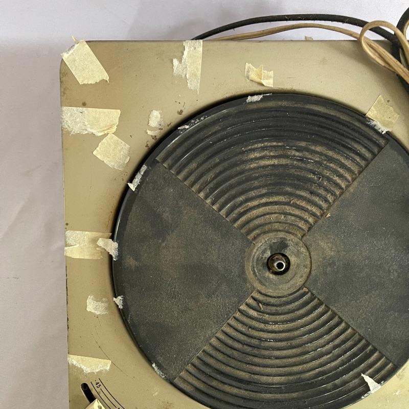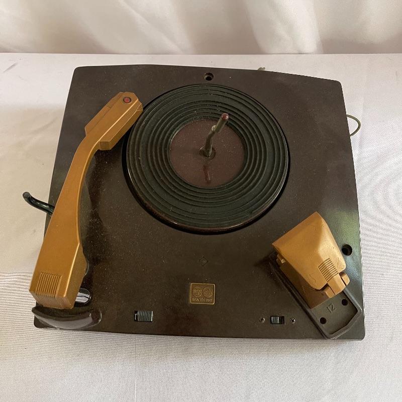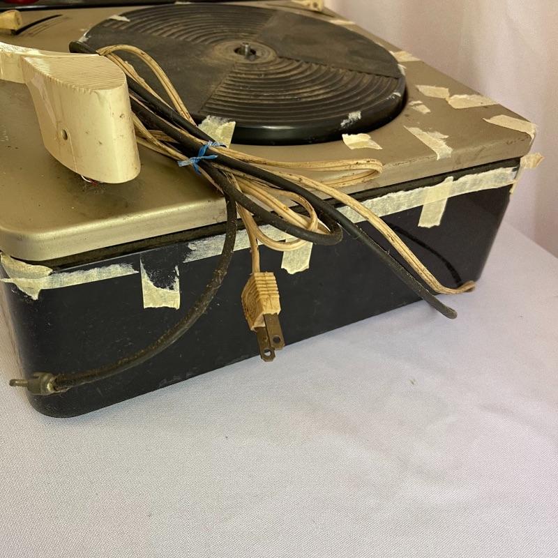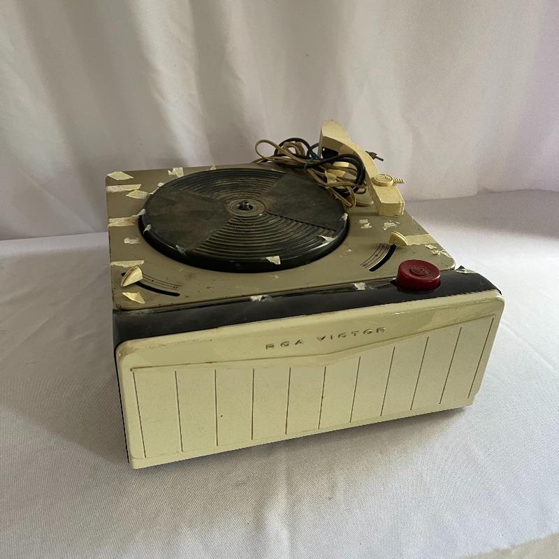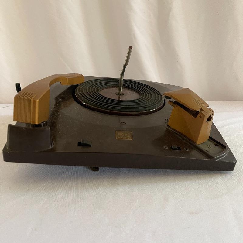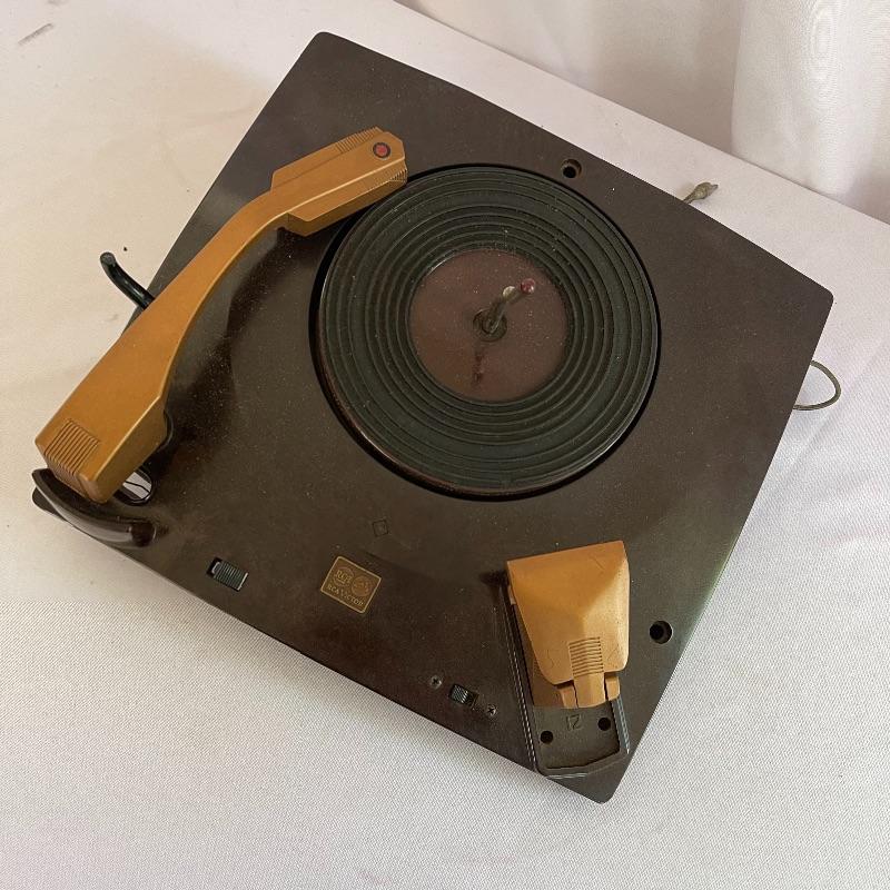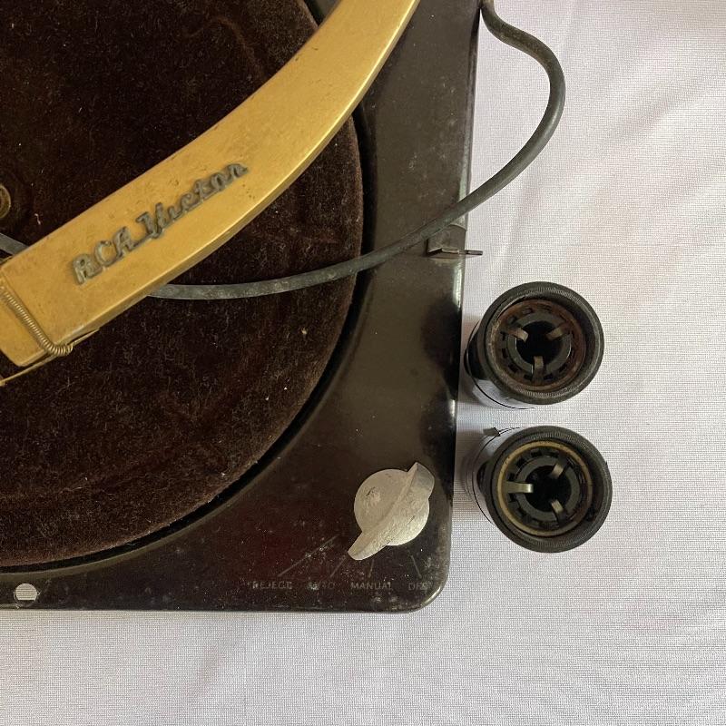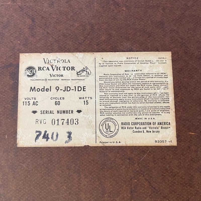 Four various RCA turntables. The first is an RCA Victor with model number 9-JD-1DE and did not power on. The second, an advanced solid state phonograph with model year of 1974 and model number of 31624831 and powered on when tested. The third is a victor with the numbers 960282-1, S274, and 021 on the underside. The last turntable is also a victor with hard to read numbers stamped on the underside. The last two were not tested.