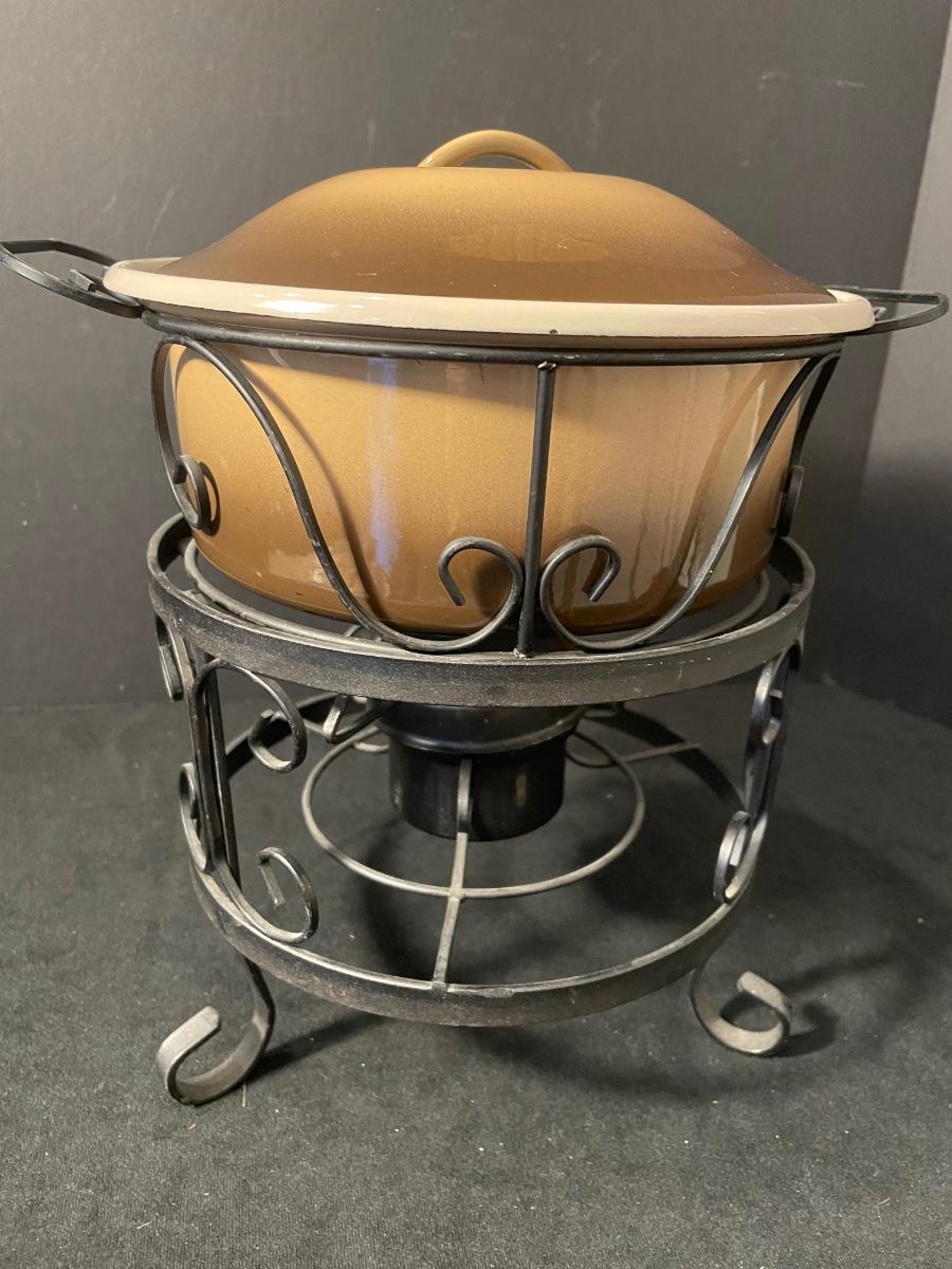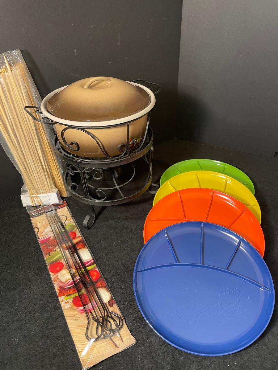 Includes fondue pot, 4 fondue plates, 4 metal skewers and bag of wooden skewers.