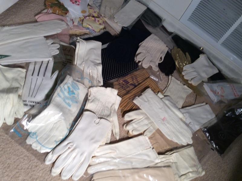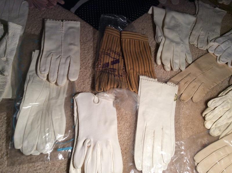Lot 117:  Women’s gloves, short and long. Leather and lace and more and vintage hankies.
