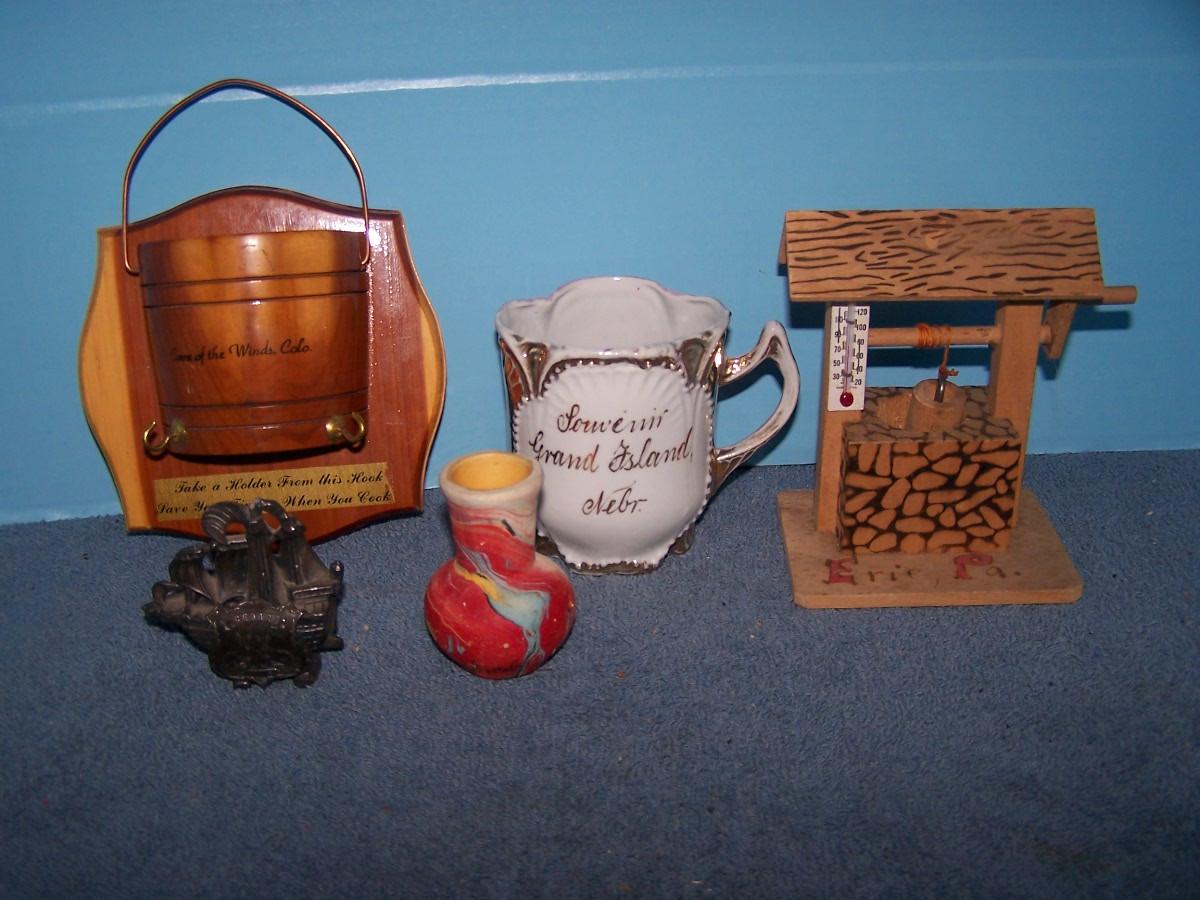 THESE ARE GREAT VINTAGE US SOUVENIRS!!! WOOD/METAL/CERAMIC.. WOODEN WISHING WELL IS 5'' TALL.. LIGHT WEAR...
