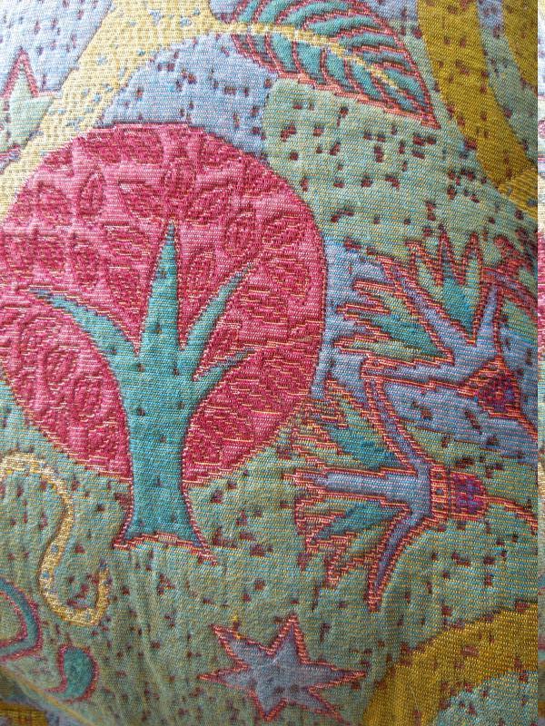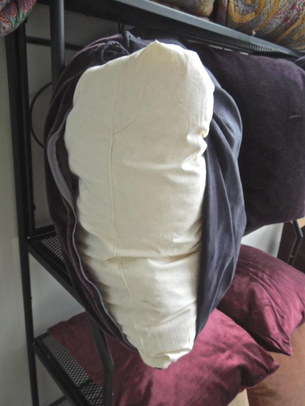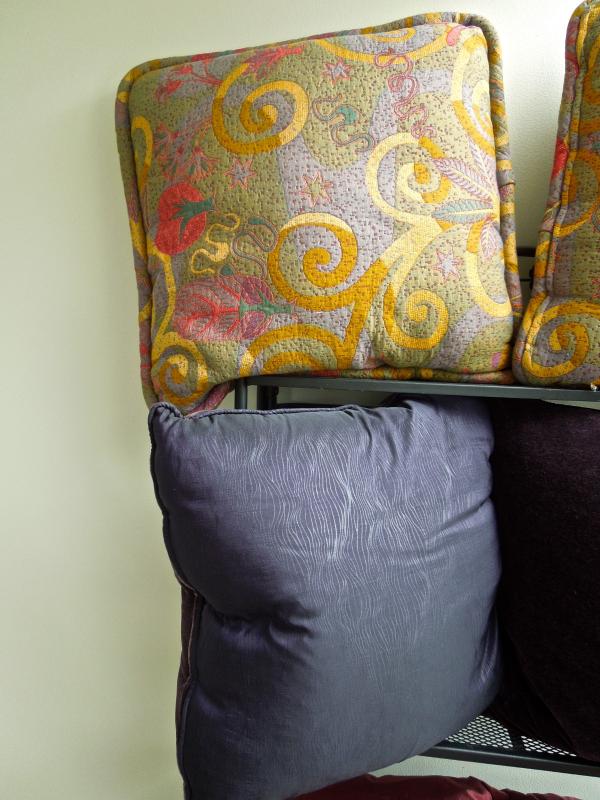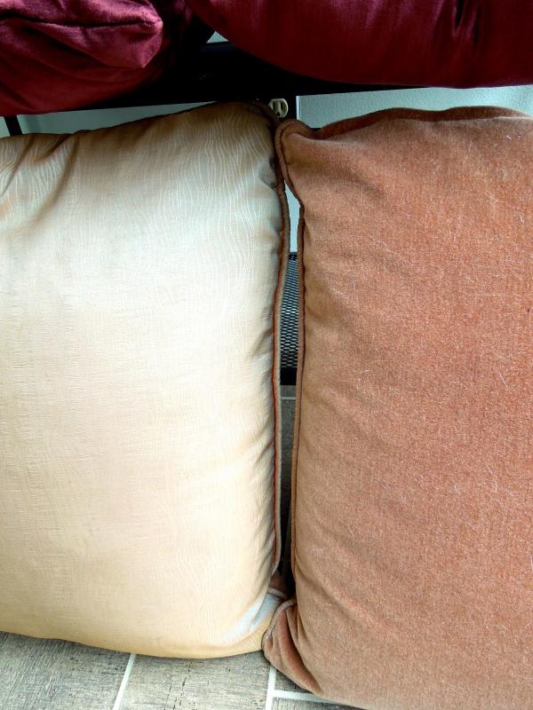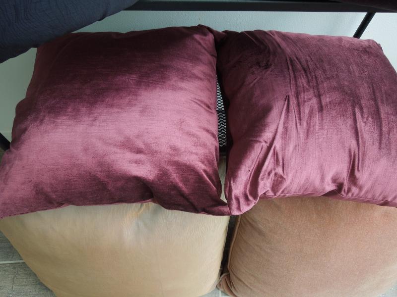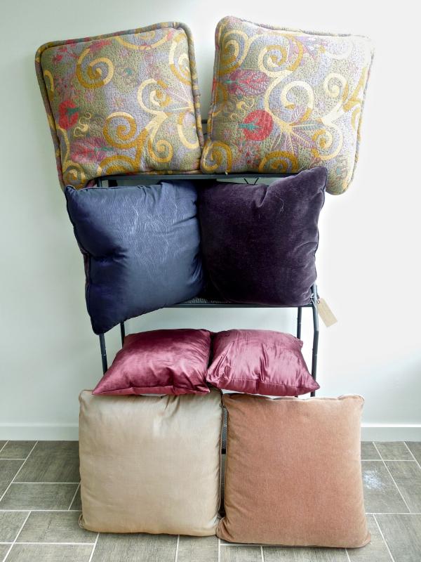 This group of 8 pillows are all downfilled and have fabric covers. The purple and dusty rose pillows have removeable zippered covers. Sizes are 25" x 25", 27 x 27" and 18 x 18" The multicolor pillows are covered in a woven cotton blend.. No rips or loose seams. Dusty rose pillows show some sun fading.