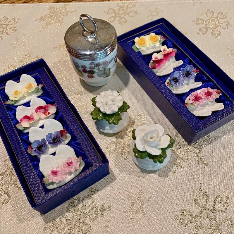 Boxed sets of flower place card holders. Petite floral salt & pepper shakers and porcelain egg cup. Made in England