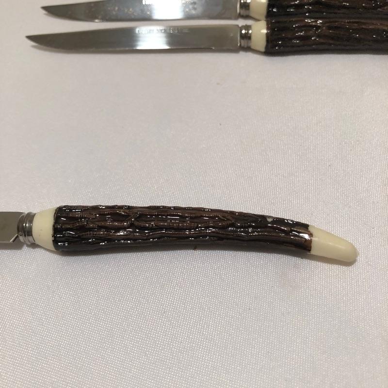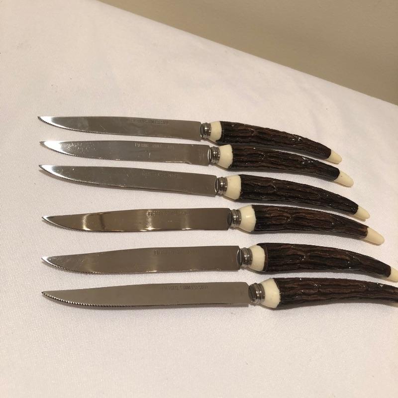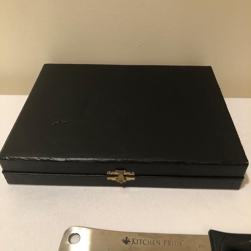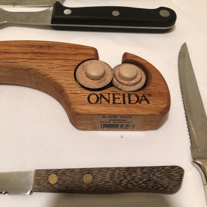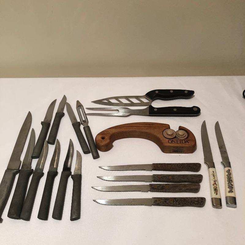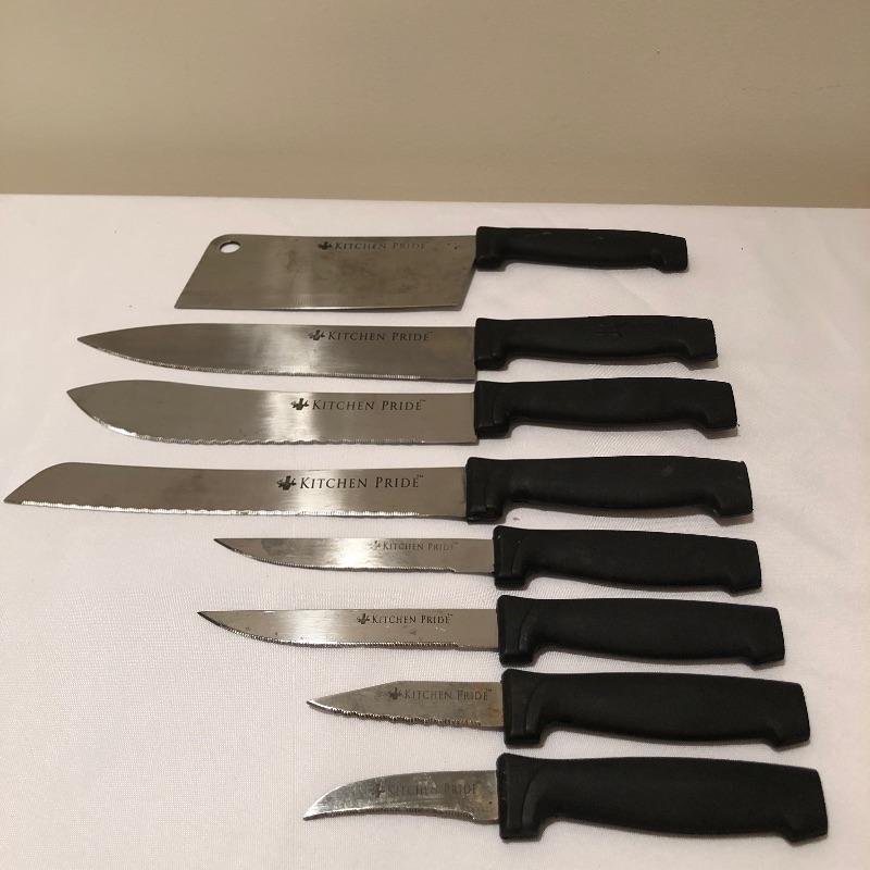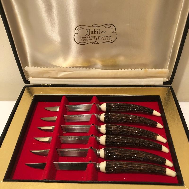 This is an excellent collection of knife sets and more. The Jubilee set of stainless steel knives have what appears to be imitation bone handles and this six piece set comes with a box. Also included is an eight piece set of Kitchen Pride knives, a Hamilton Beach electric carving knife with case, Oneida knife mate, and more, see images.