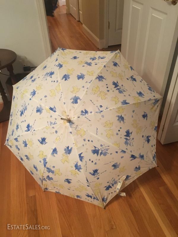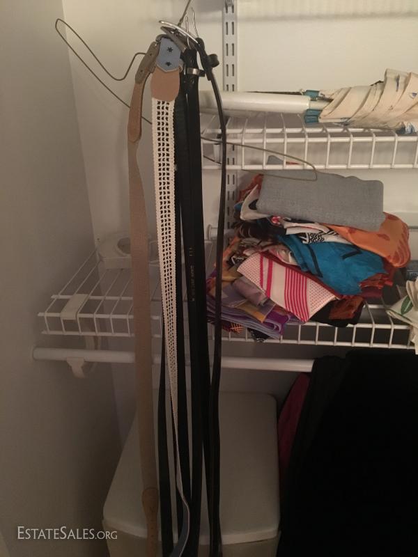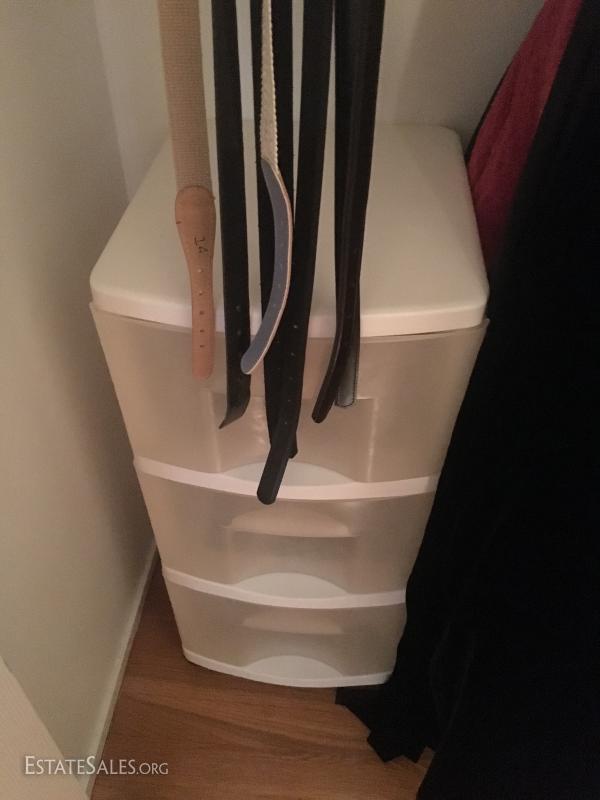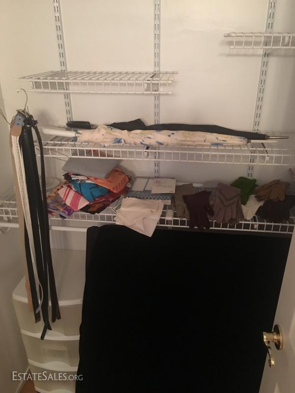 Umbrellas, scarves, gloves, belts, and handkerchiefs. Plastic storage bin with three drawers on wheels. This lot is available for local pick up in Asheville, NC only.