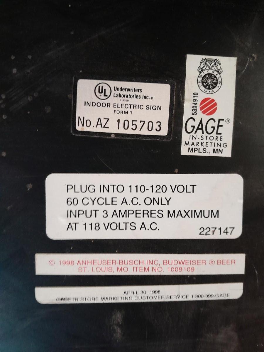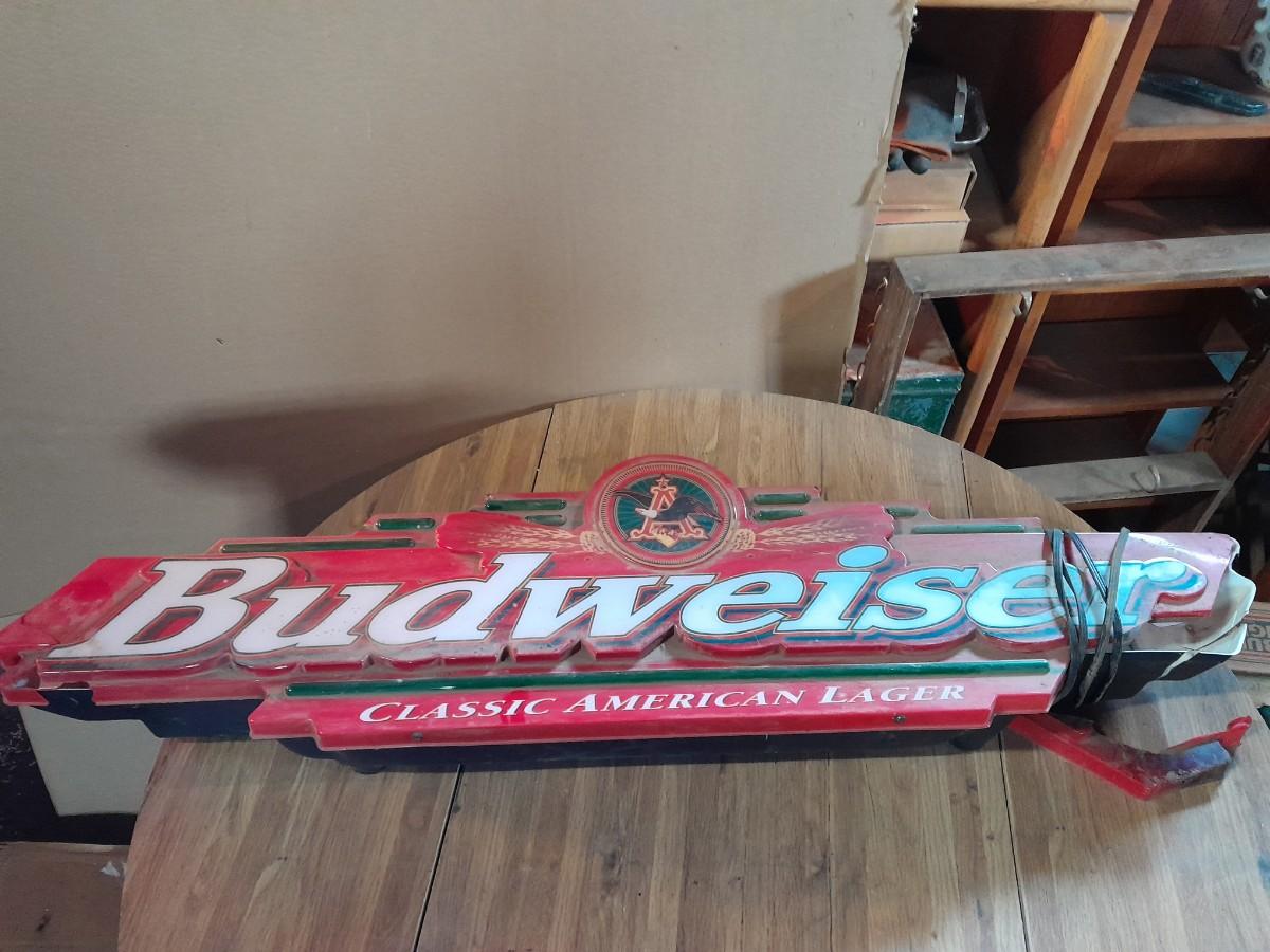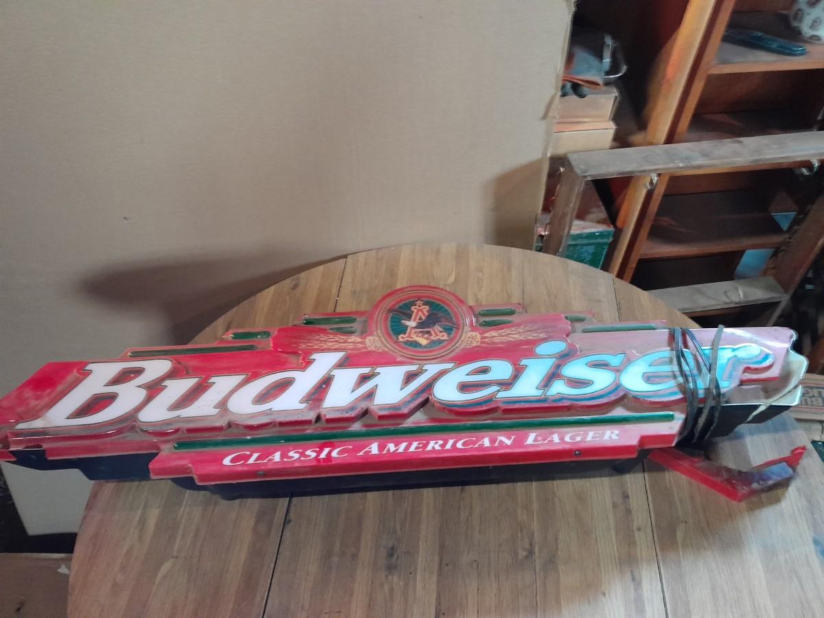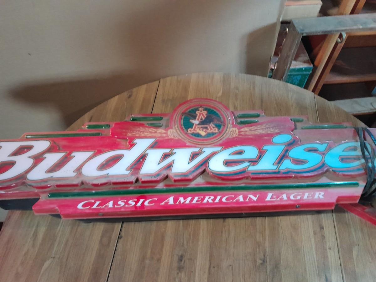 LARGE ELECTRIC BUDWEISER CLASSIC AMERICAN LAGER BEER ADVERTISEMENT SIGN THIS SIGN DOES HAVE DAMAGE ON THE CORNER AS SHOWN. THE PIECE TO FIX IT IS INCLUDED.