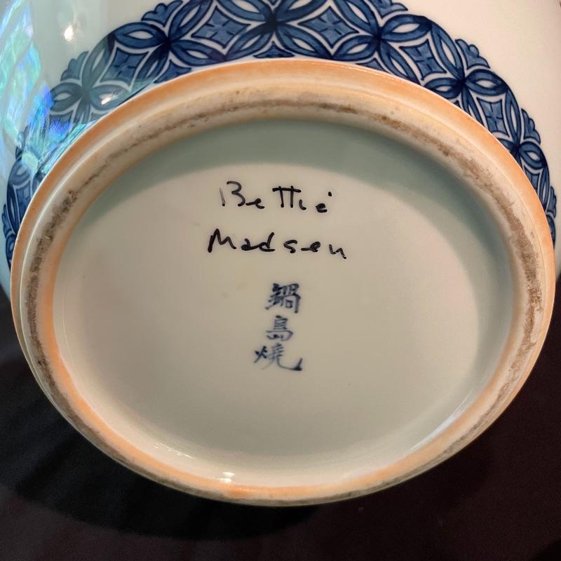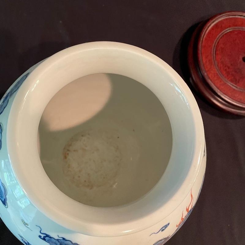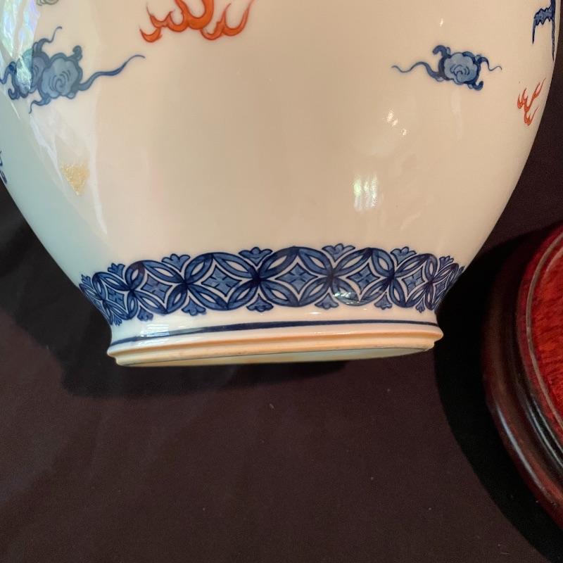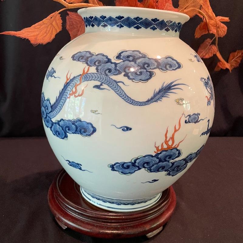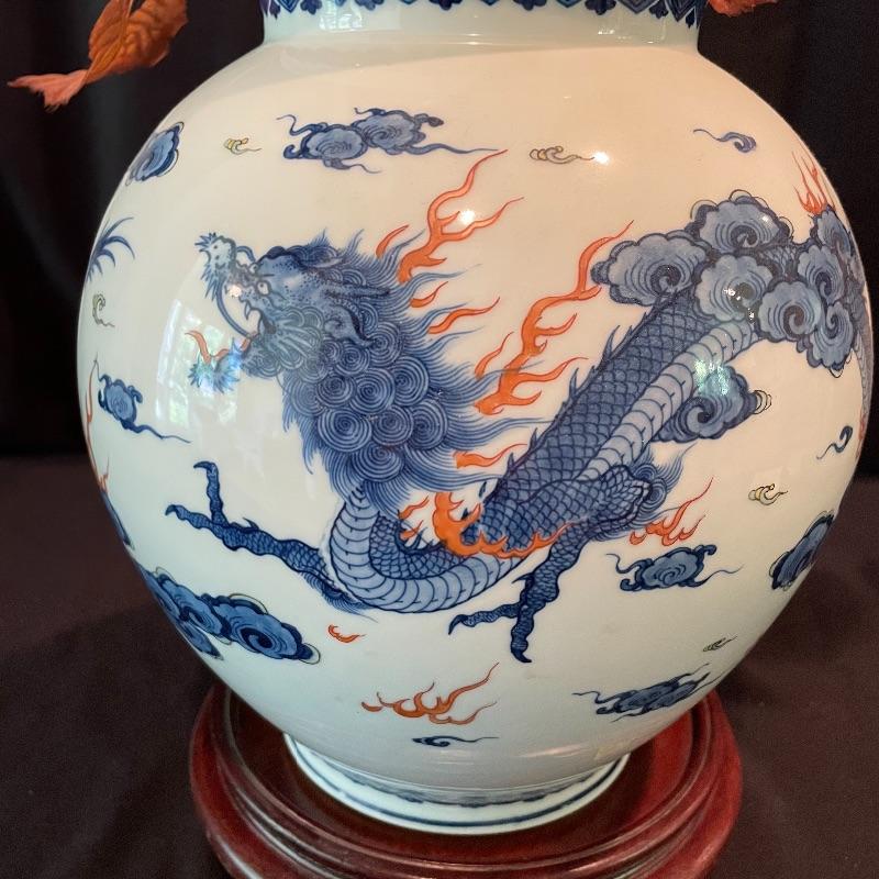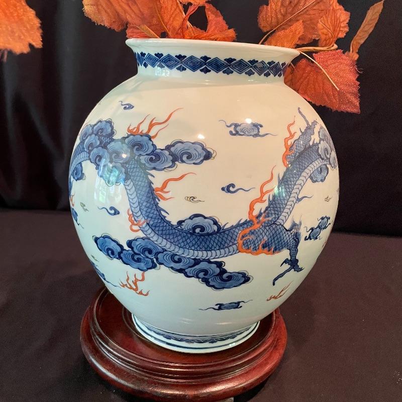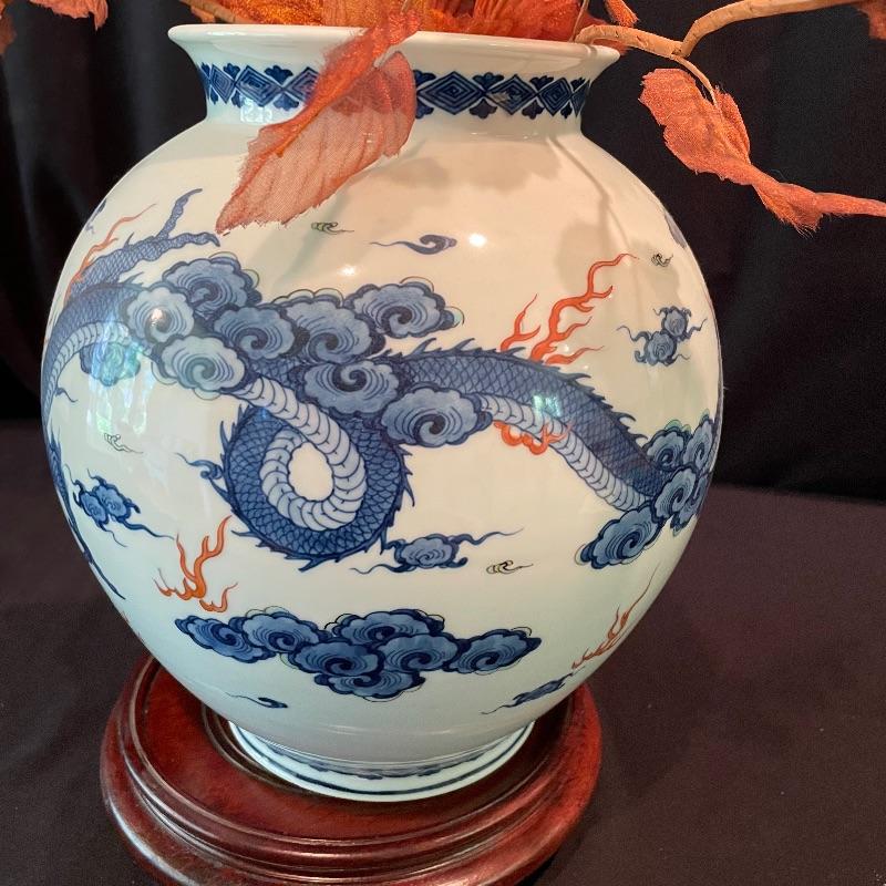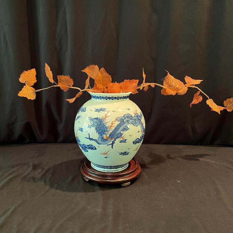 Stunning bright white vase with deep blue dragon design and more. The faux autumn leaf decor brings out the orange fire on the vase. Piece is signed and comes with a nice round wooden stand. Vase stands about 10.5”. See images. Shipping available.