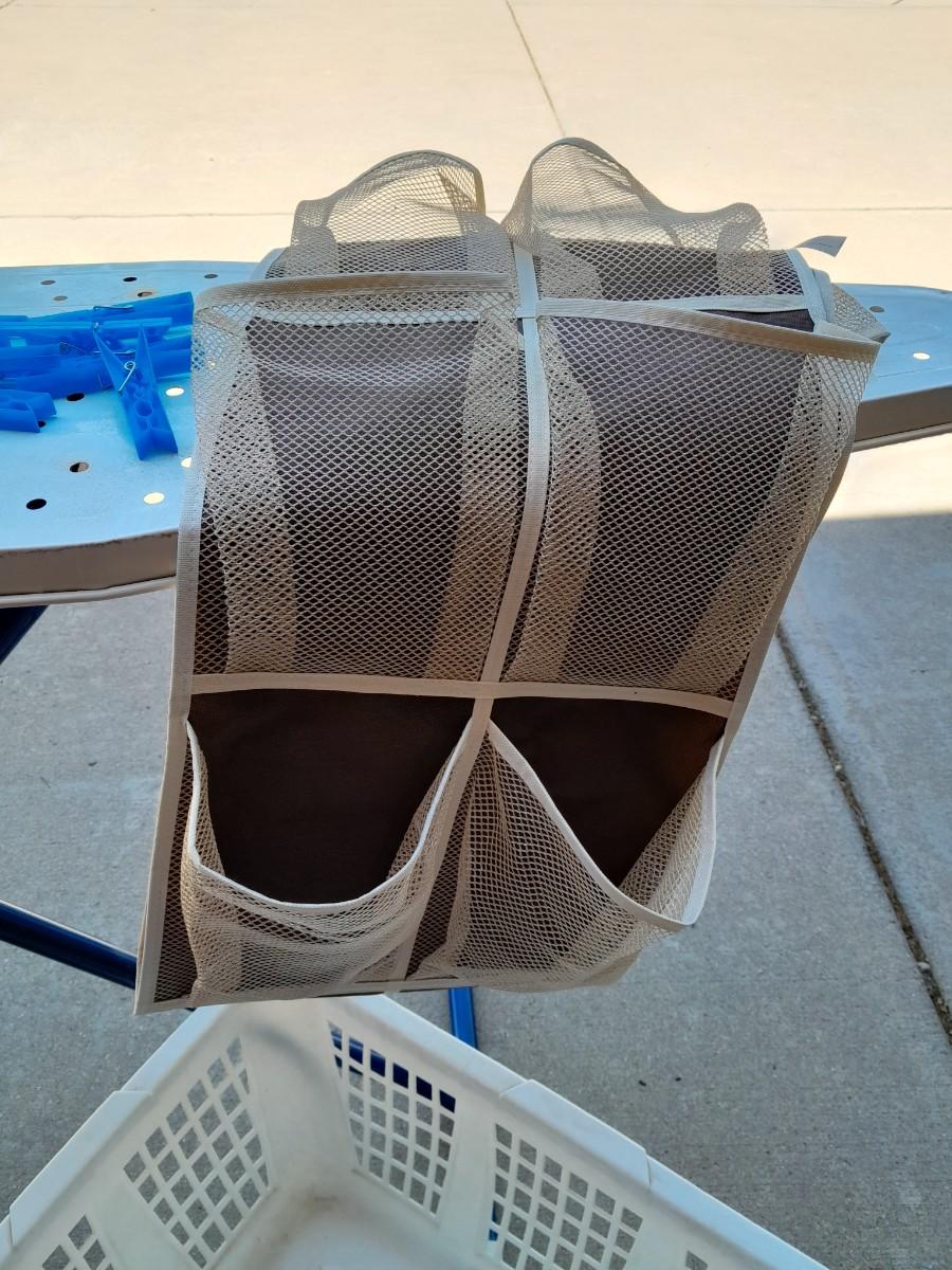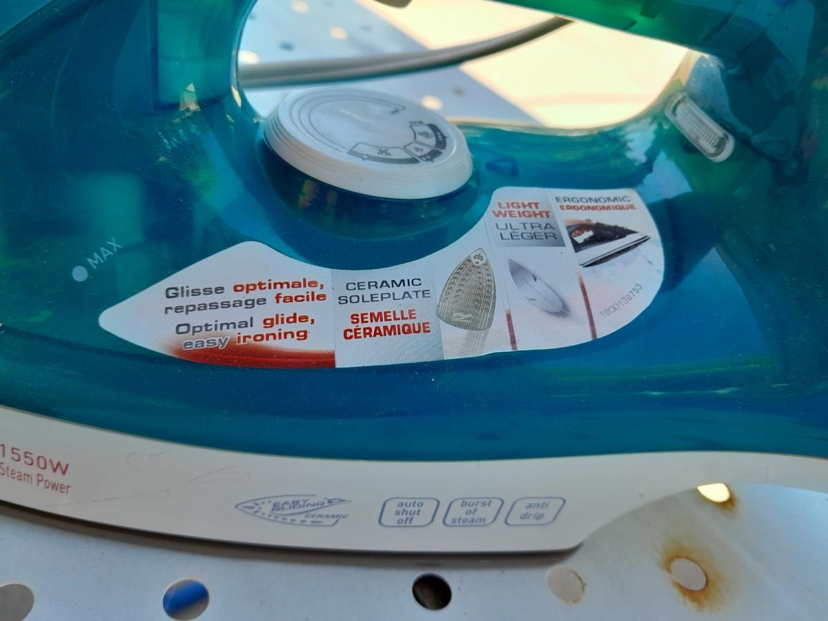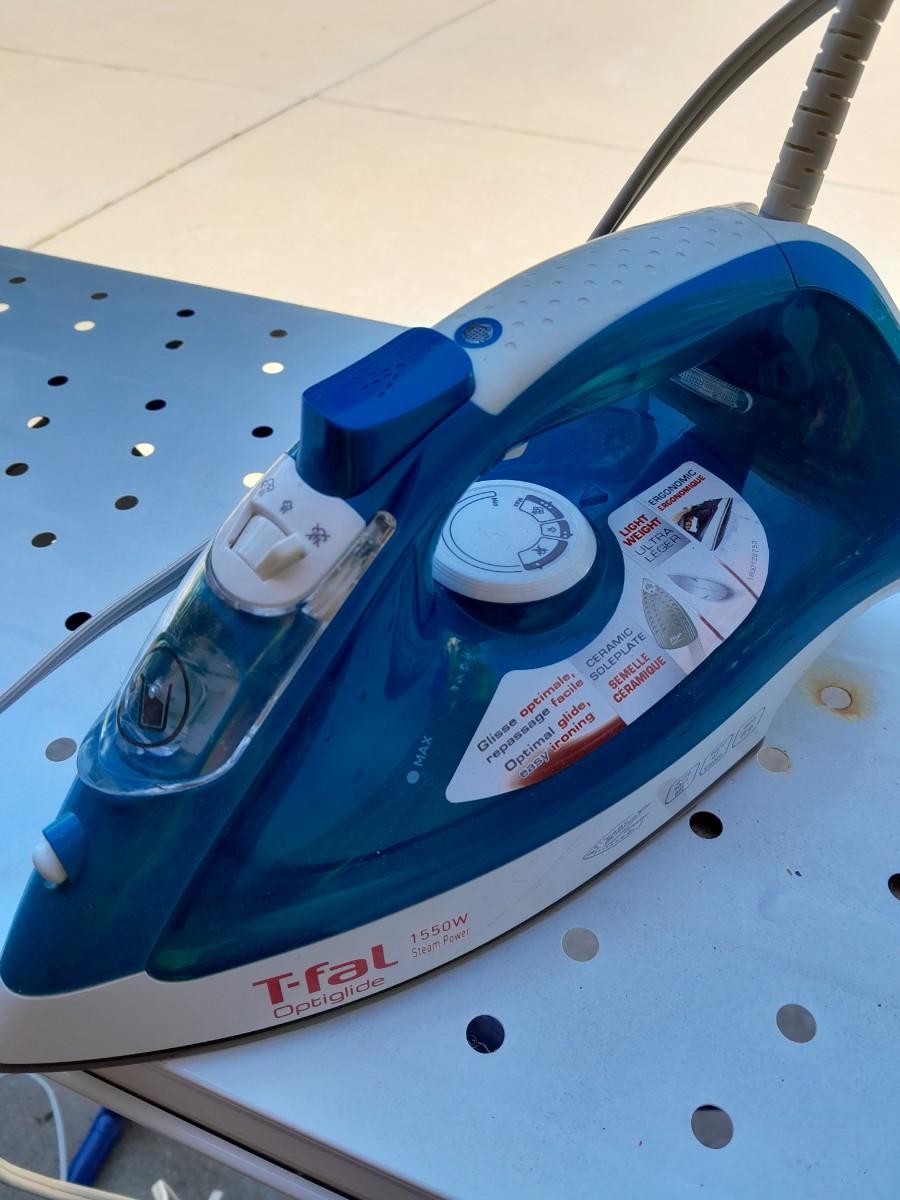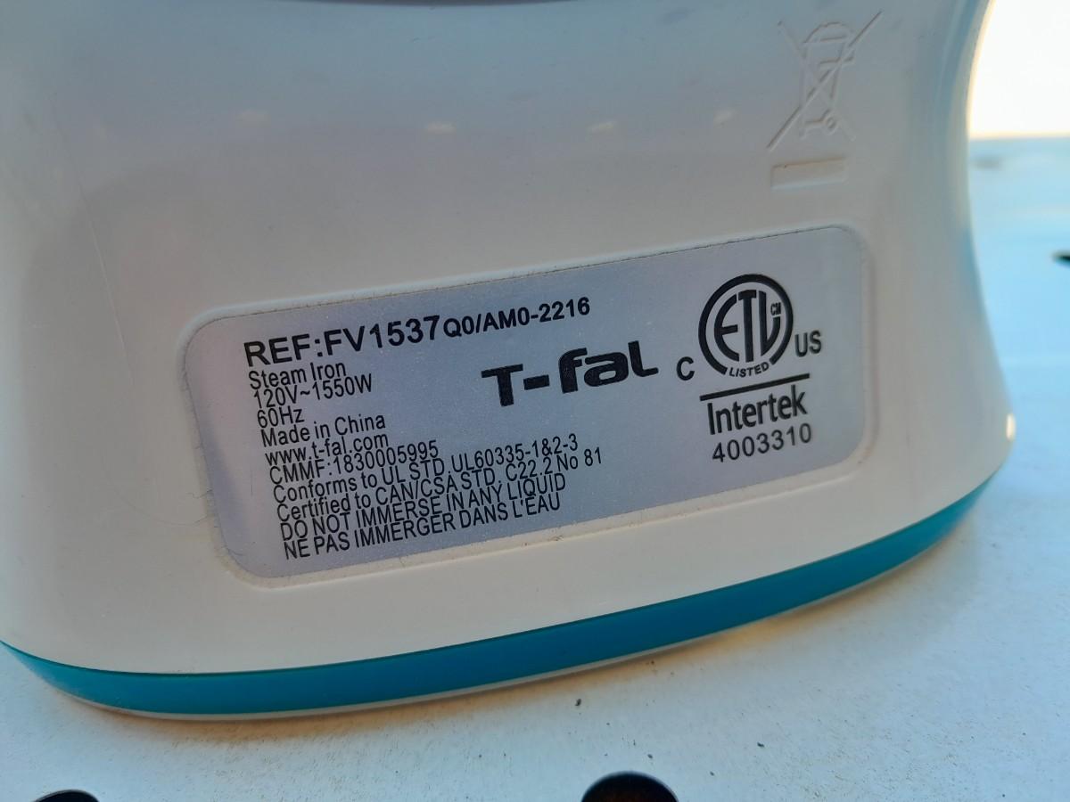 T-FAL STEAM IRON MODEL REF-FV1537 WITH A METAL FOLDING IRONING BOARD, CLOSET SHOE ORGANIZER, AND TWO LAUNDRY BASKETS.