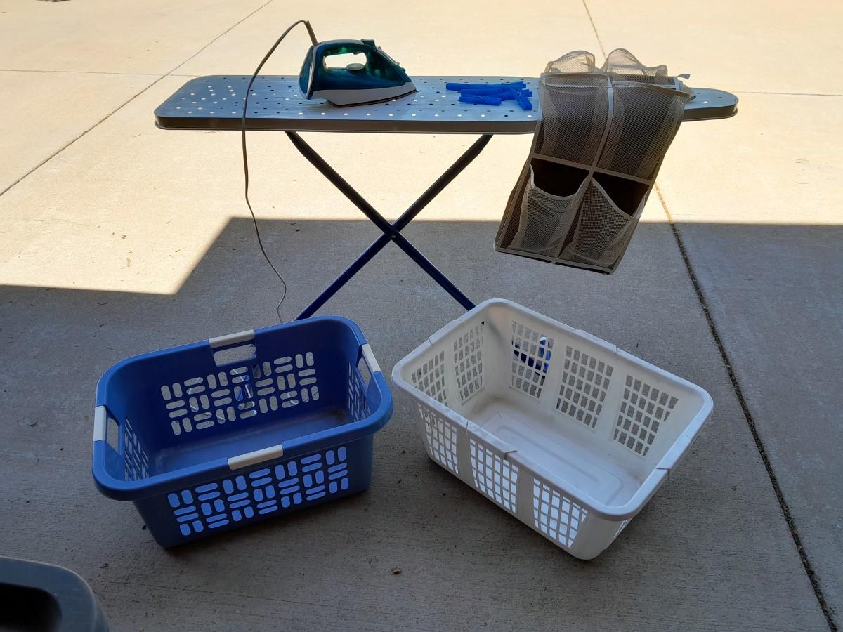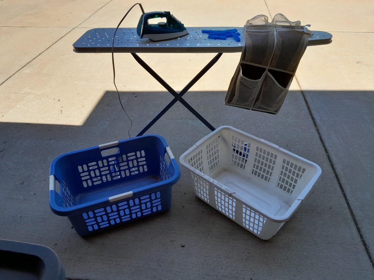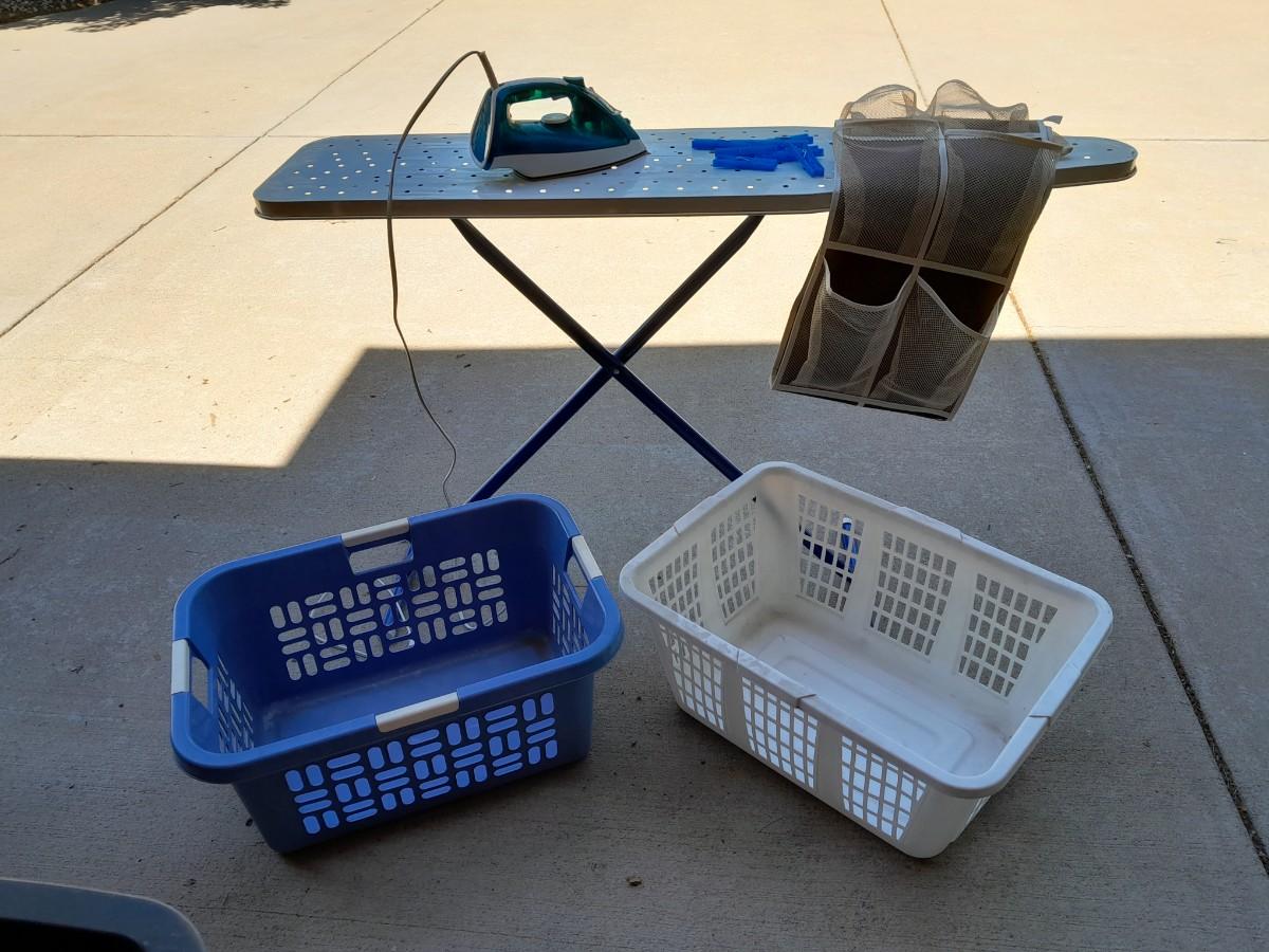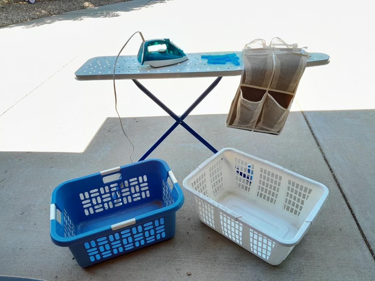 LOT 117 LAUNDRY TIME! IRON, IRONING BOARD, AND LAUNDRY BASKETS